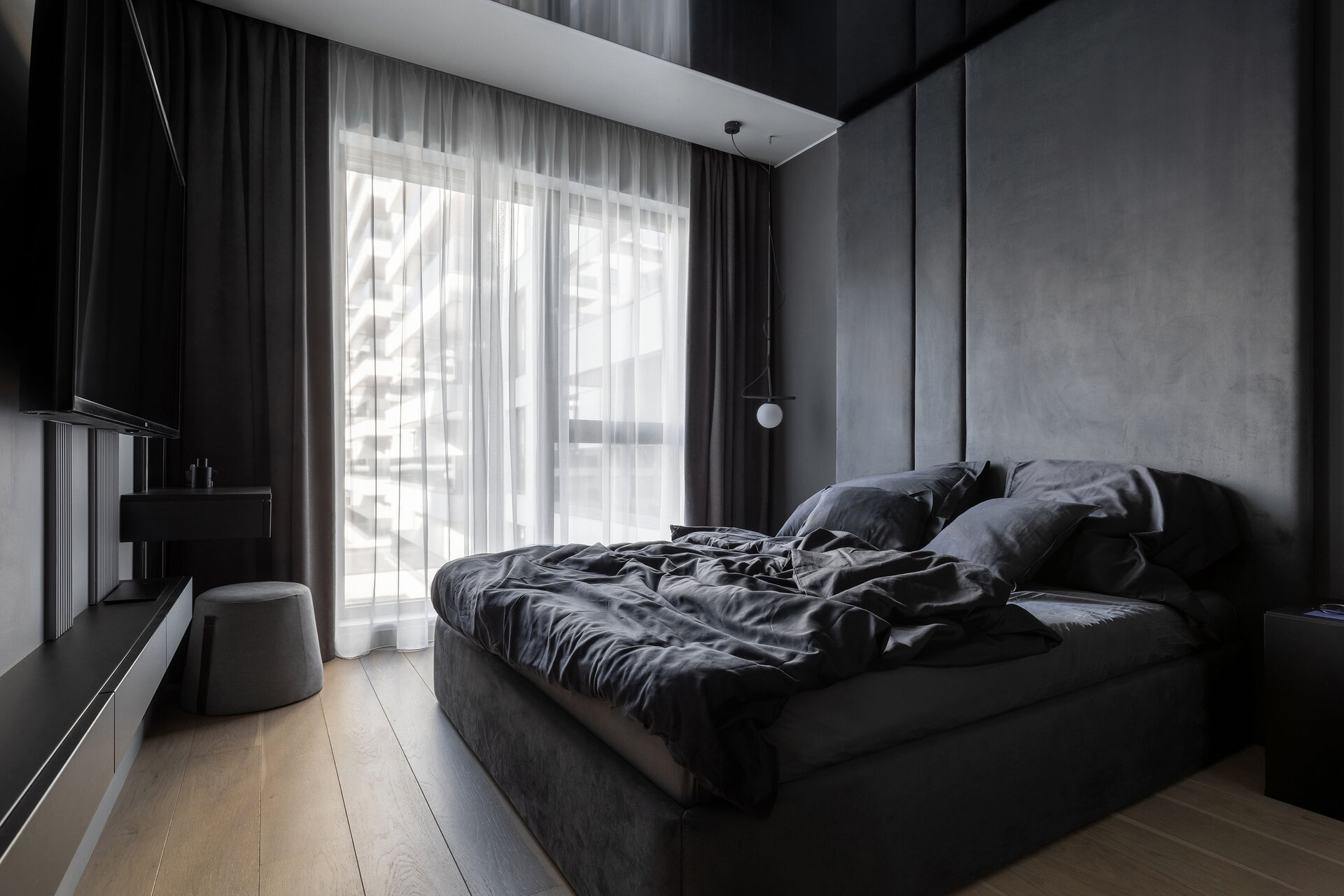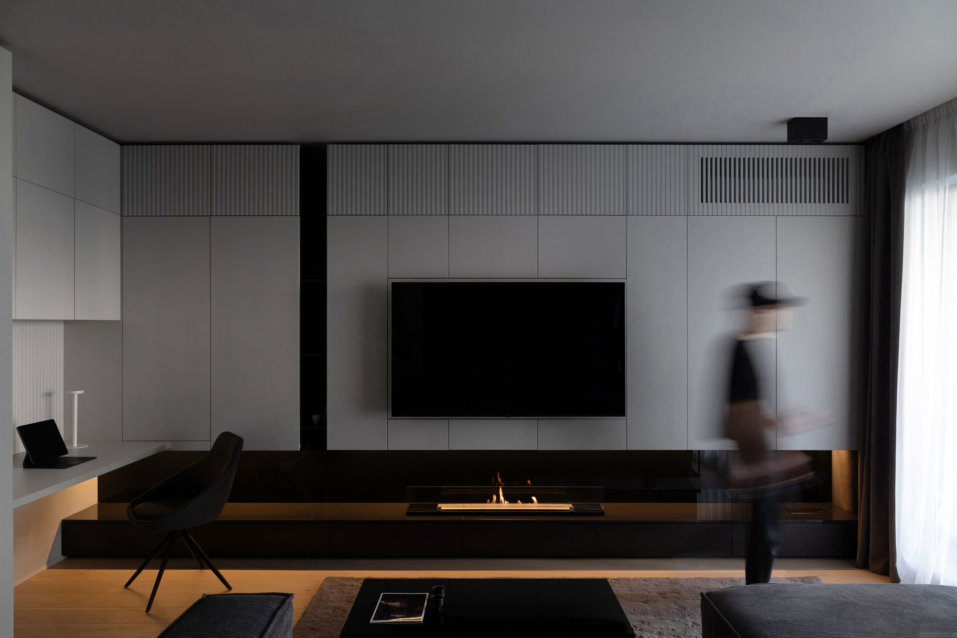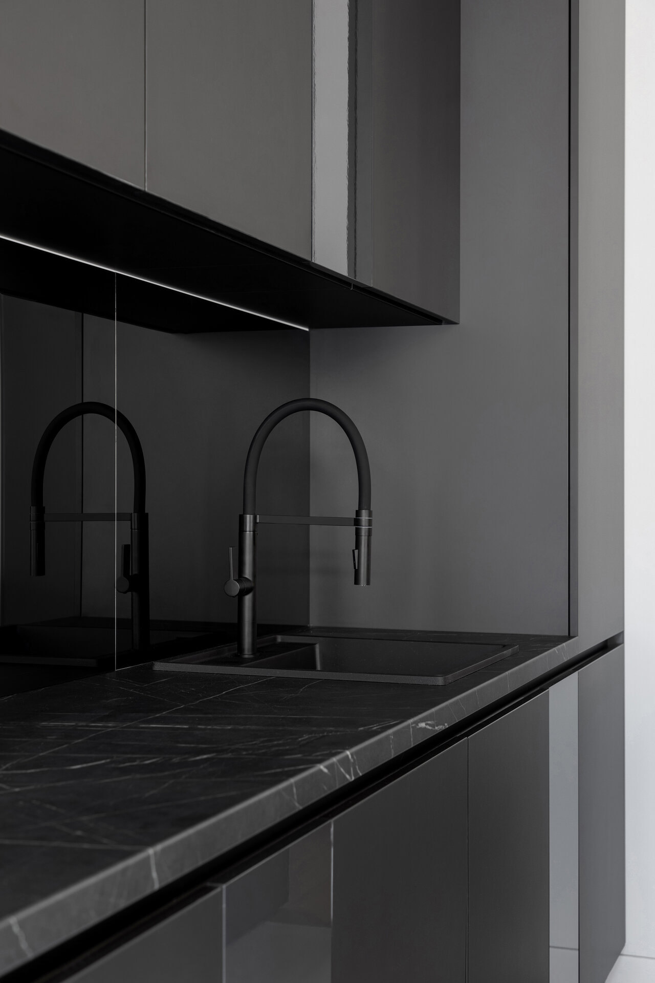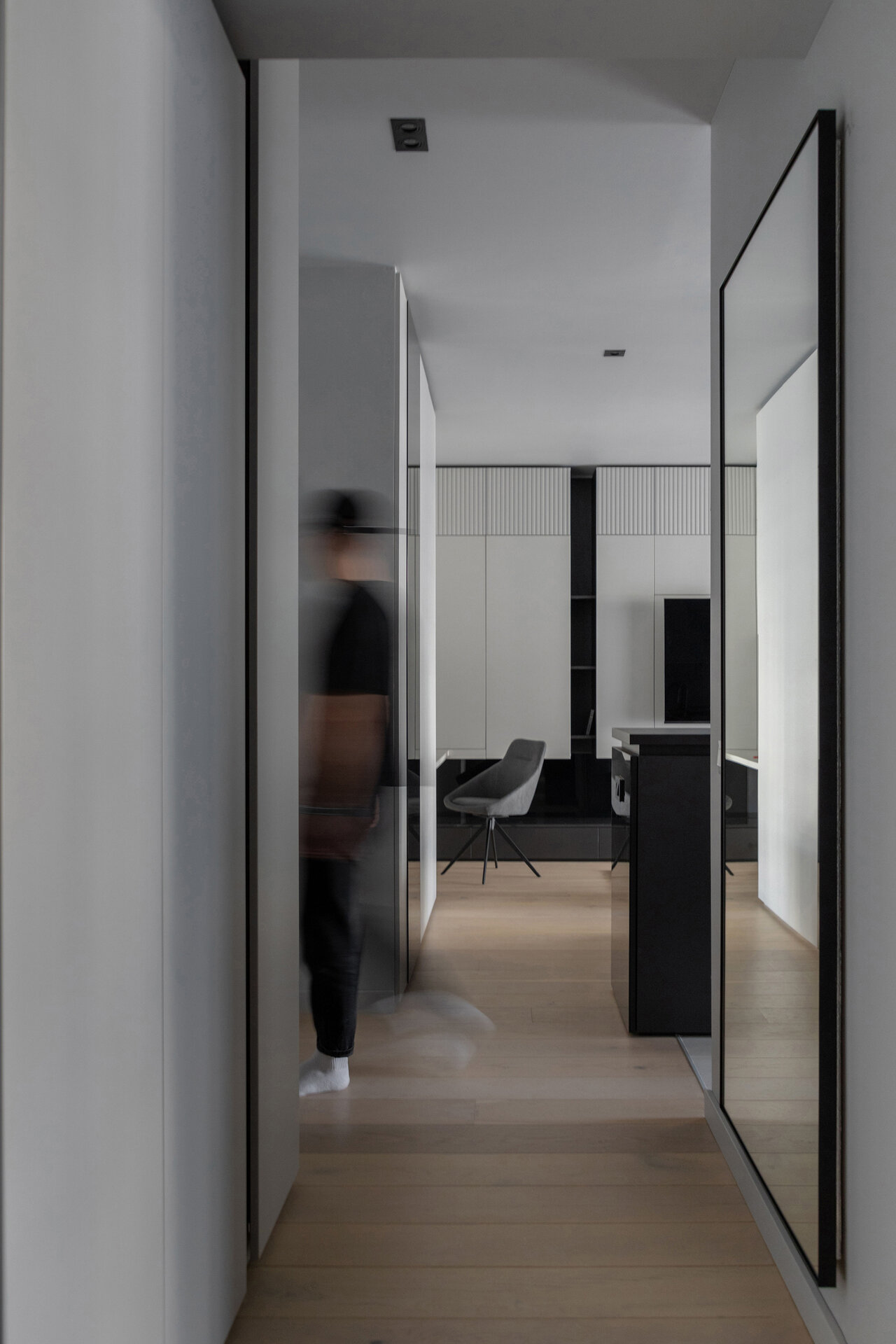 O particularitate a acestui proiect a fost legată în primul rând de posibilitatea de a face modificări asupra planului de compartimentare dar şi de crearea unui concept de amenajare personalizabil pentru două apartamente identice în cadrul aceluiaşi complex. Astfel, am reuşit să creăm un openspace din fosta bucătărie separată de zona de living printr-o partiţie de sticlă, dar să şi introducem o insulă cu zona de luat masa, care nu ar fi fost posibilă în compartimentarea iniţială propusă de către dezvoltator. Din punct de vedere al atmosferei, am considerat potrivită o abordare minimalistă şi discretă în tonuri de gri cu accente de negru integrate în diferite texturi, totul sub spoturi de lumină reglabile care pot crea scenarii diferite în funcţie de nevoile chiriaşilor. La nivel de materialitate, predomină suprafeţele reflectante, fie că vorbim de placări MDF cu aspect lucios sau placări de sticlă neagră, poziţionate strategic în relaţie cu lumina naturala şi diversele scenarii posibile de relaţionare cu spaţiul.