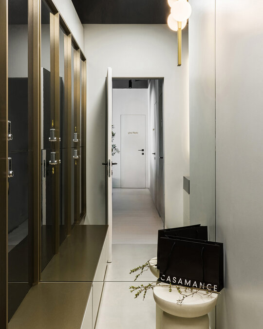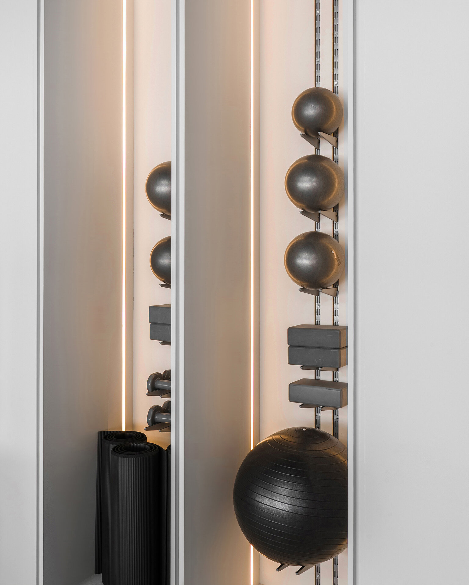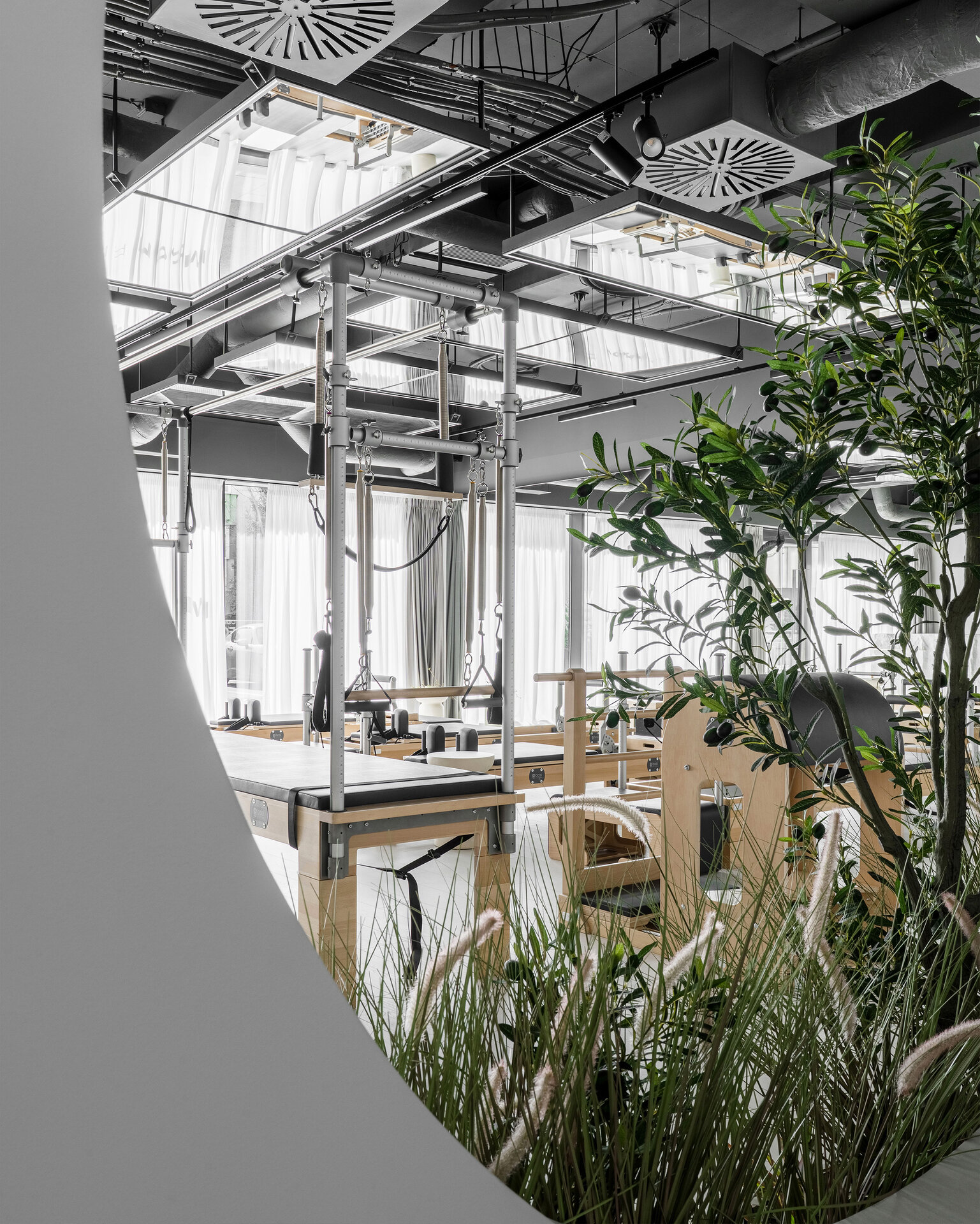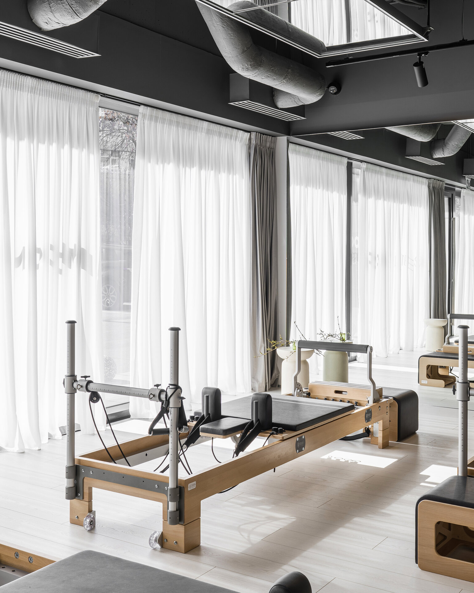 Pentru a extinde percepția spațiului și a aduce un instrument util practicii pilates, oglinzile de mari dimensiuni au fost amplasate nu doar pe verticală, la nivelul pereților, ci și la nivelul plafonului, o soluție care introduce, în mod autentic, o perspectivă nouă pentru acest tip de funcțiune.