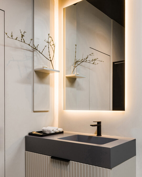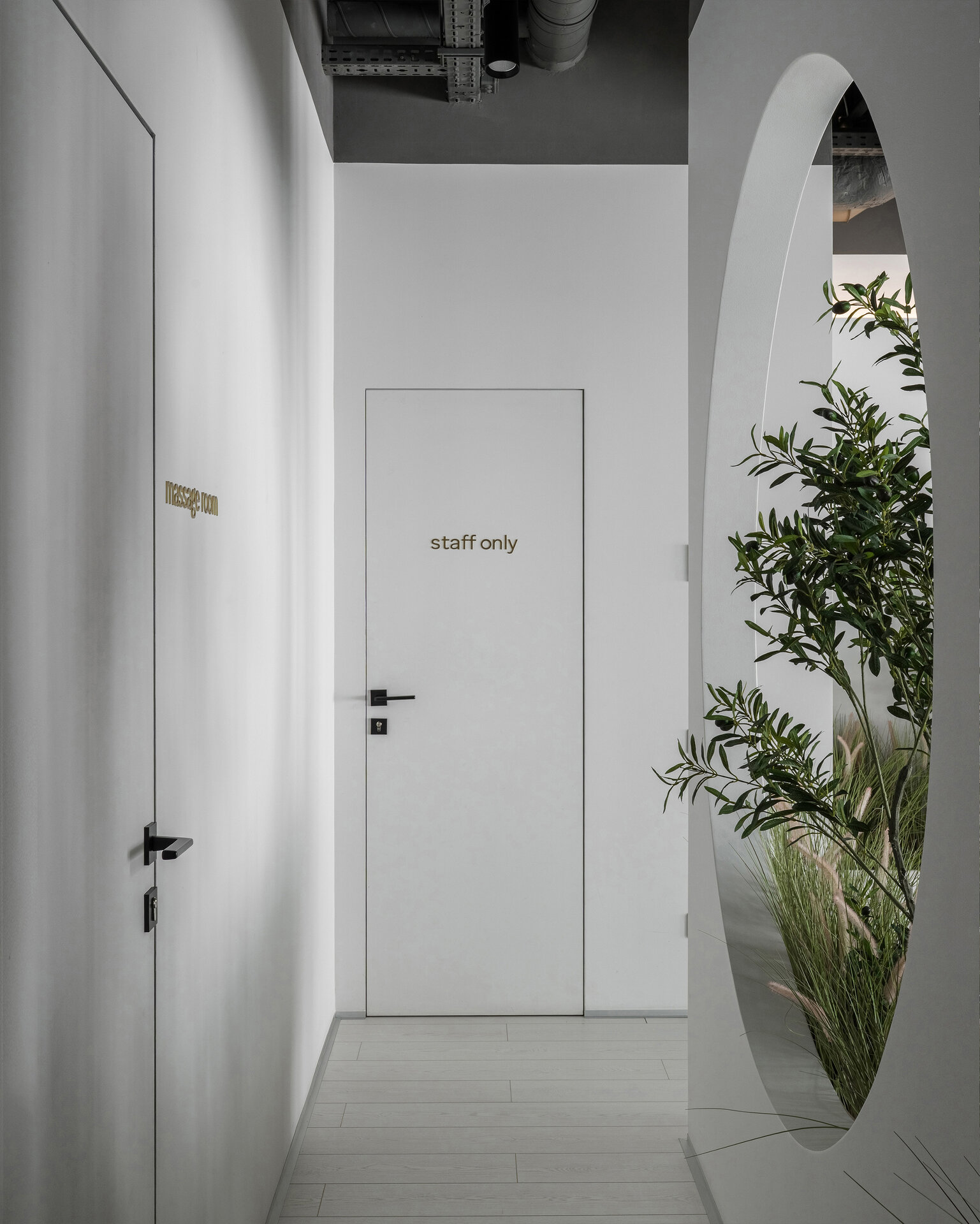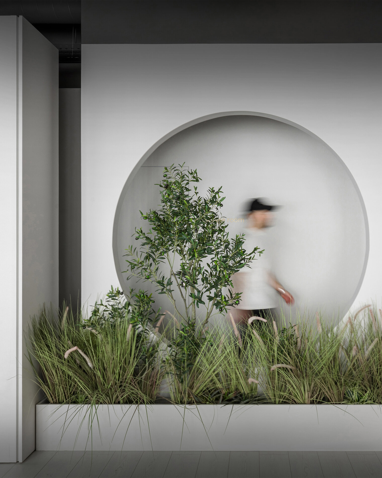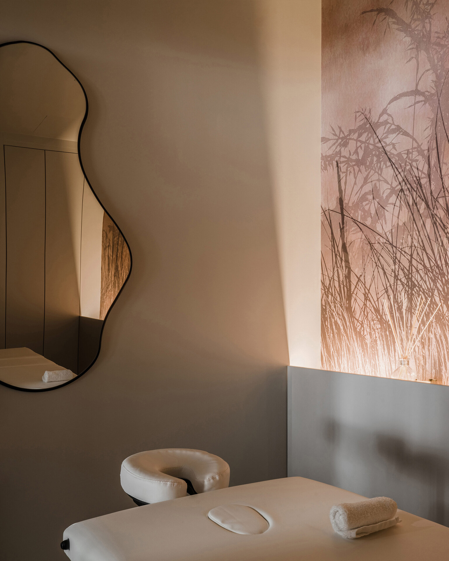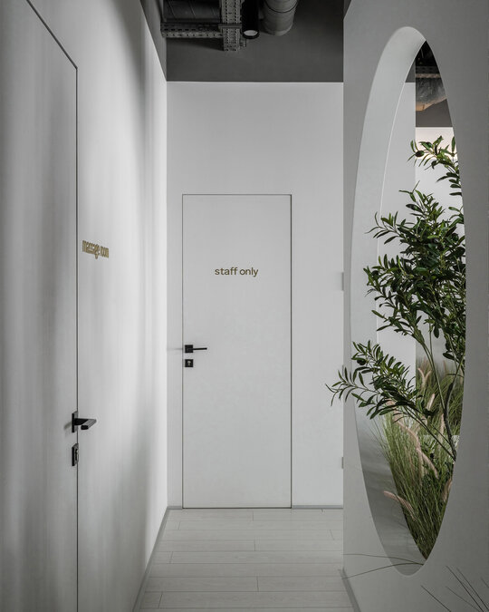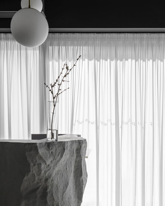 Această relație se conturează încă de la intrare, prin prezența recepției, un element mineral, sculptural, a cărei volumetrie introduce un contrast controlat față de liniile clare ale restului amenajării, ancorând vizual compoziția în planul materialității.