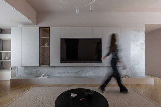 Pardoseala existentă a fost păstrată, ca element de continuitate, însă restul componentelor au fost regândite complet. Pereții și plafonul au fost unificați printr-un ton bej cald, aplicat integral, pentru a crea un fundal coerent și calm, menit să evidențieze detaliile texturate și accentele contrastante. Pe această bază neutră, am suprapus inserții grafice de negru, fronturi mate, placări din sticlă fumurie, măsuțe cu geometrii clare, care aduc profunzime și ritm compoziției.