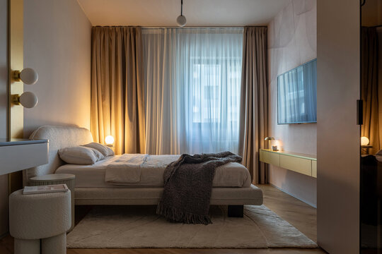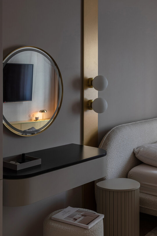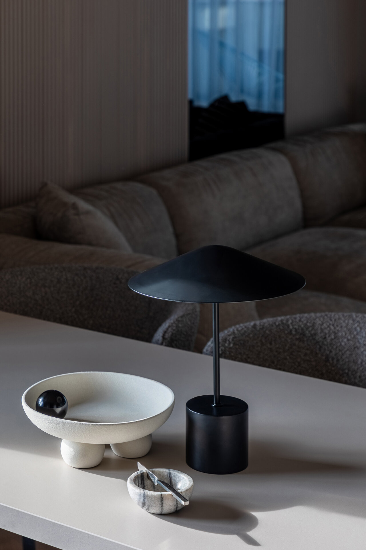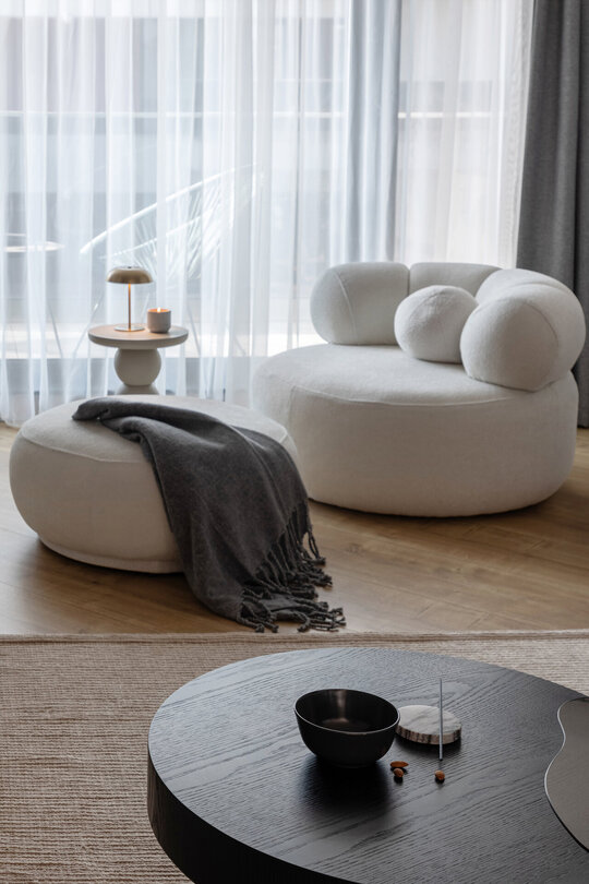 Texturile conferă caracter și profunzime întregii amenajări: boucle generos, bumbac texturat, accente de lână, toate contribuind la o experiență tactilă și vizuală bogată, care invită la confort și apropiere. Mobilierul contemporan, cu volume rotunjite și proporții echilibrate, se alătură zonelor bine definite și decorului atent compus. Accesoriile și decorațiunile au fost selectate cu aceeași grijă, urmărind linia stilistică a amenajării și completând-o cu obiecte care au atât rol estetic, cât și functional, de la textile decorative la piese de mic mobilier care adaugă un plus de utilitate și expresivitate.