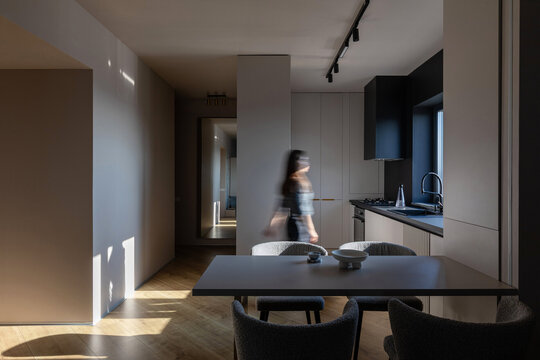 Prima schimbare majoră a vizat reorganizarea circulației. În zona bucătăriei și a holului, un coridor de acces practic inexistent a fost desenat printr-o piesă de mobilier înaltă, cu rol de delimitare fluidă între funcțiuni, care ordonează spațiul fără a-l fragmenta. Această redefinire subtilă a trasat trasee firești și a adus un plus de intimitate și logică spațială.