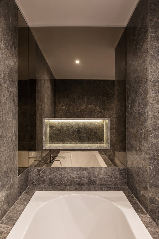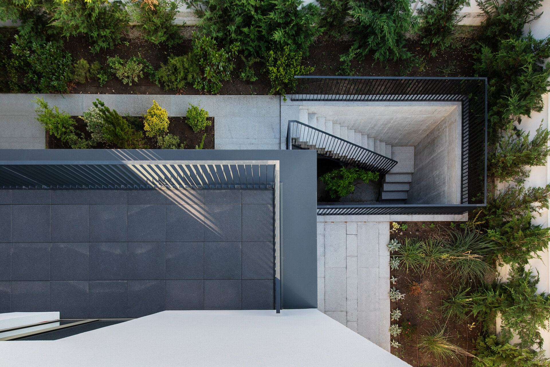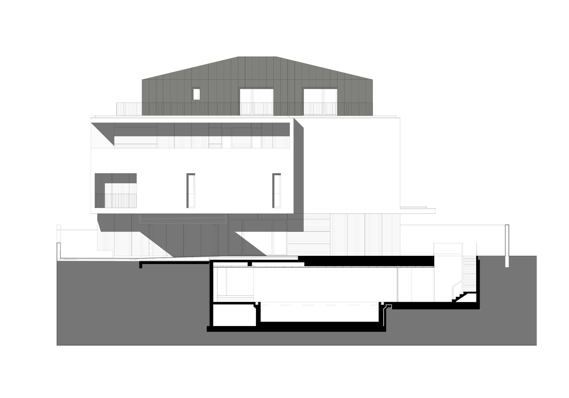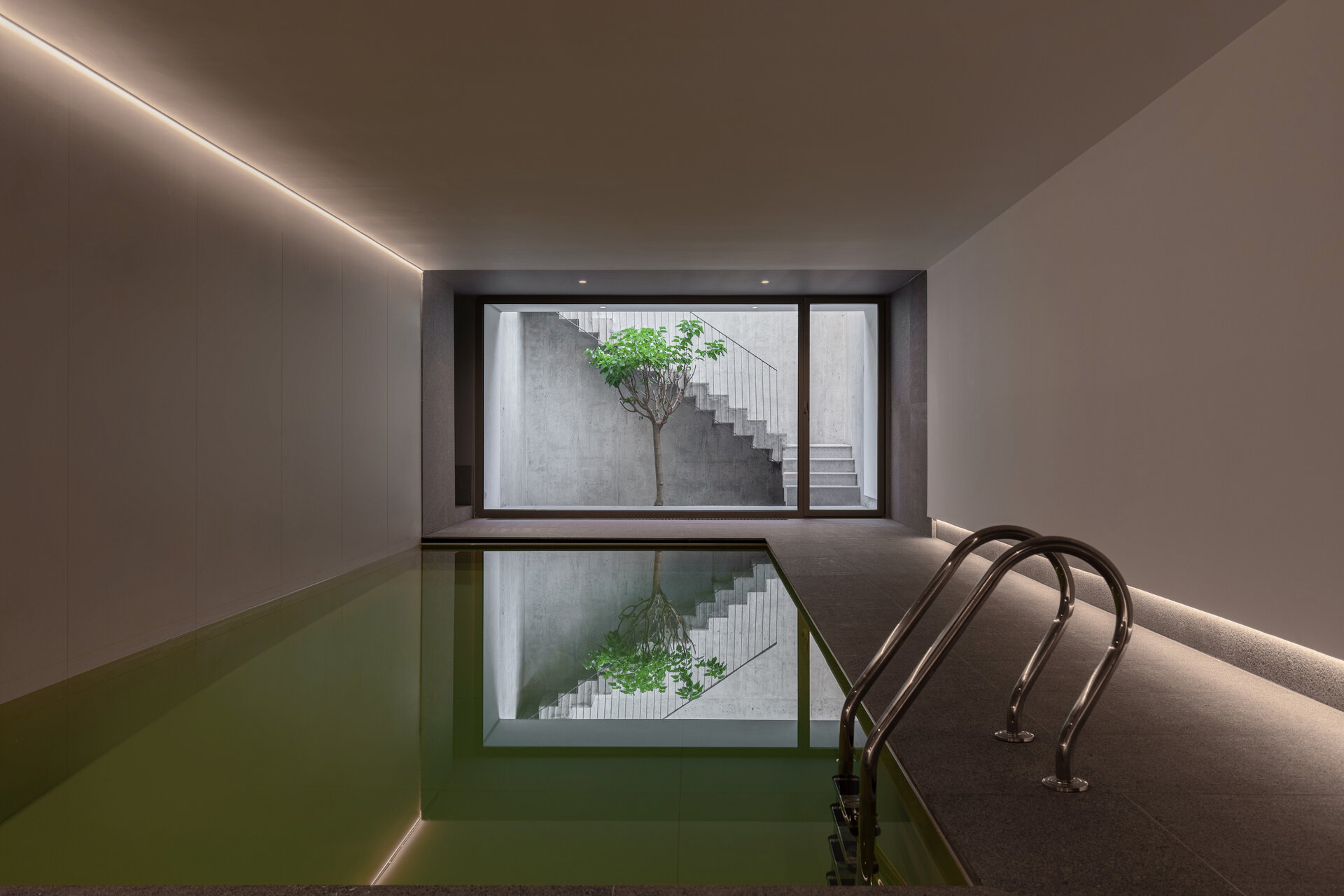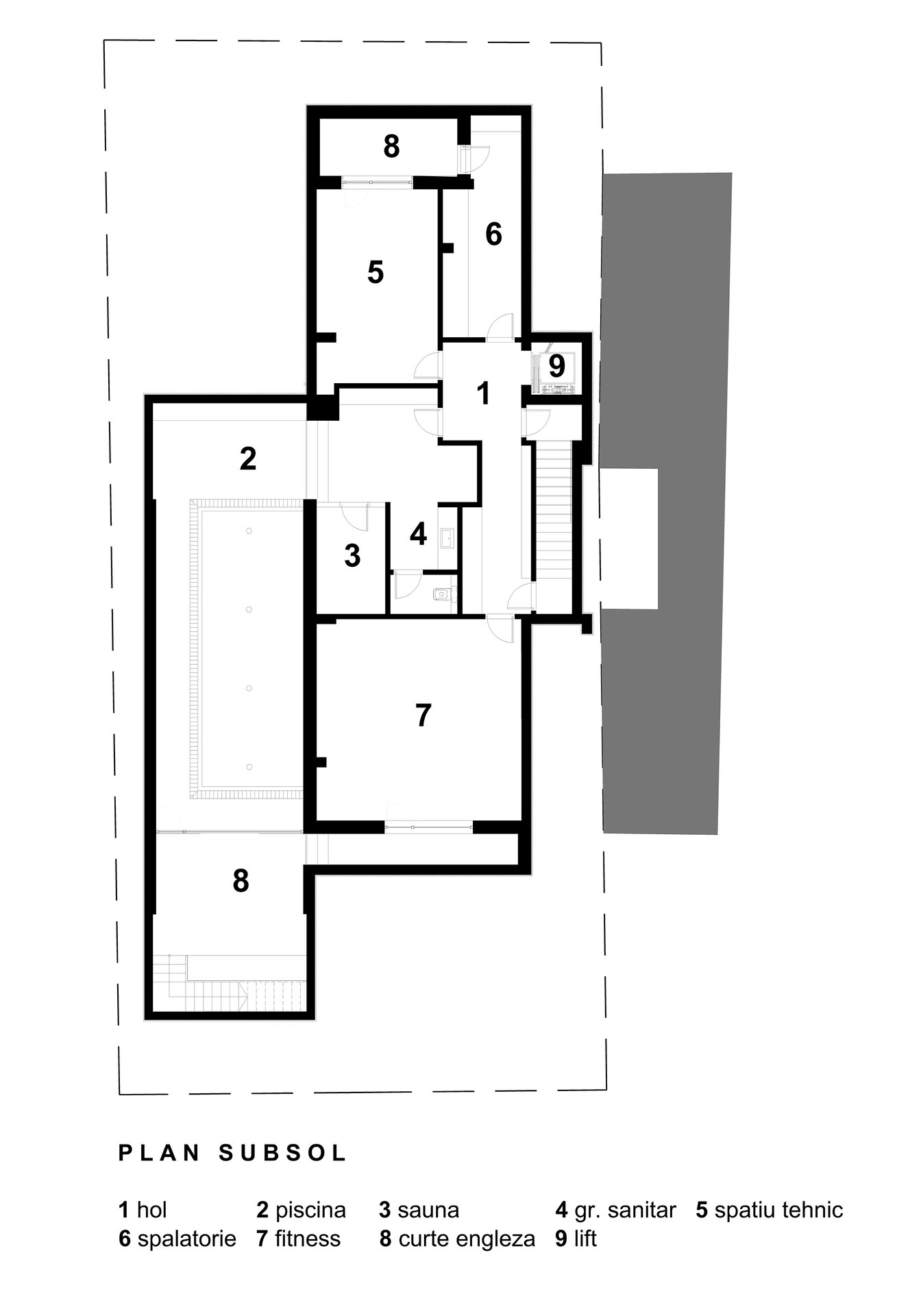 La subsol, pe langa spatiile tehnice, se afla o zona spa, incluzand piscina, sala gimnastica, sauna si anexele. Spatiul piscinei se continua printr-un perete vitrat cu o curte engleza ce comunica printr-o scara cu gradina de la parter. Astfel, desi aflat complet sub nivelul terenului, subsolul beneficiaza de lumina naturala.