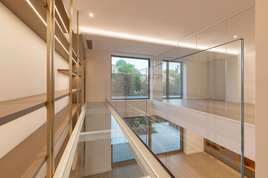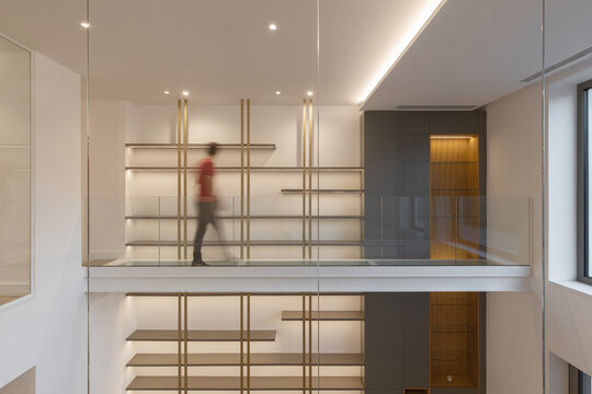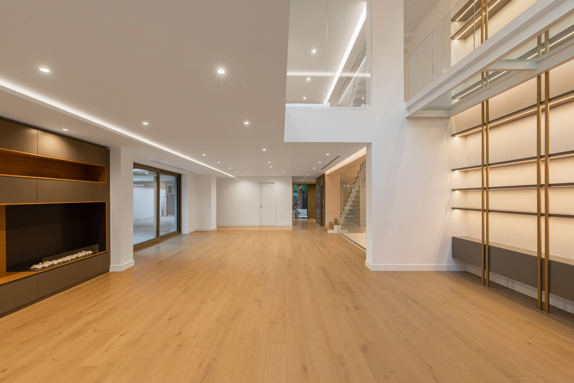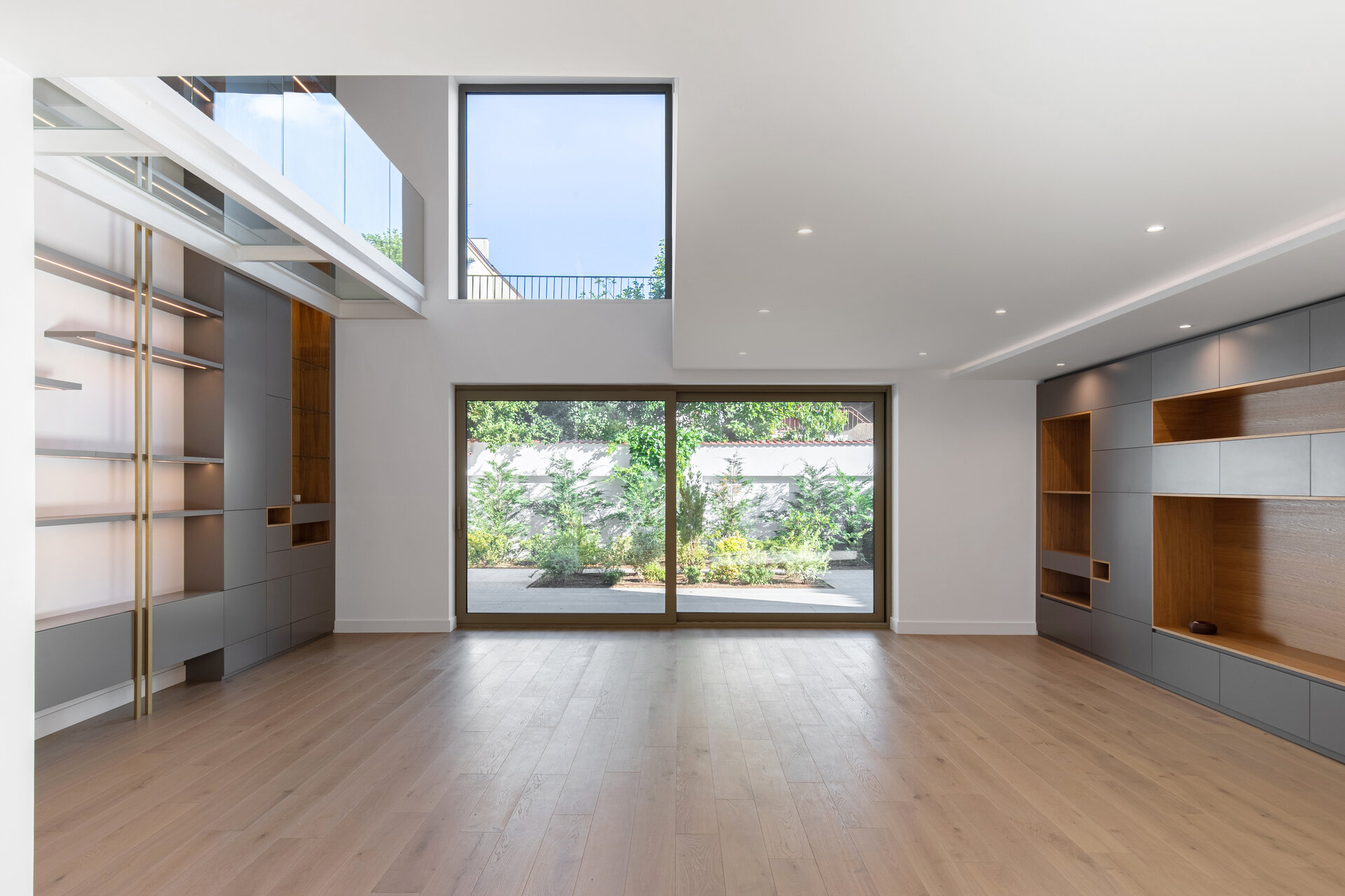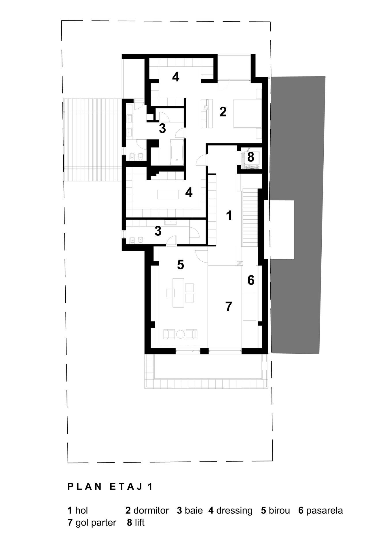 Nivelul parterului este dedicat integral activitatilor de zi, cuprinzand living room-ul si locul de luat masa intr-un spatiu generos comun, precum si bucataria si nodul de circulatie verticala (scara si ascensor). Zona destinata camerei de zi se extinde pe inaltimea a doua nivele, comunicand vizual cu etajul 1, unde sunt amplasate un birou si o galerie ce deserveste biblioteca desfasurata pe un perete cu inaltime dubla.