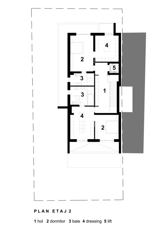 La etajul 2 sunt amplasate inca 2 dormitoare, fiecare cu baie, dressing si terasa proprii.