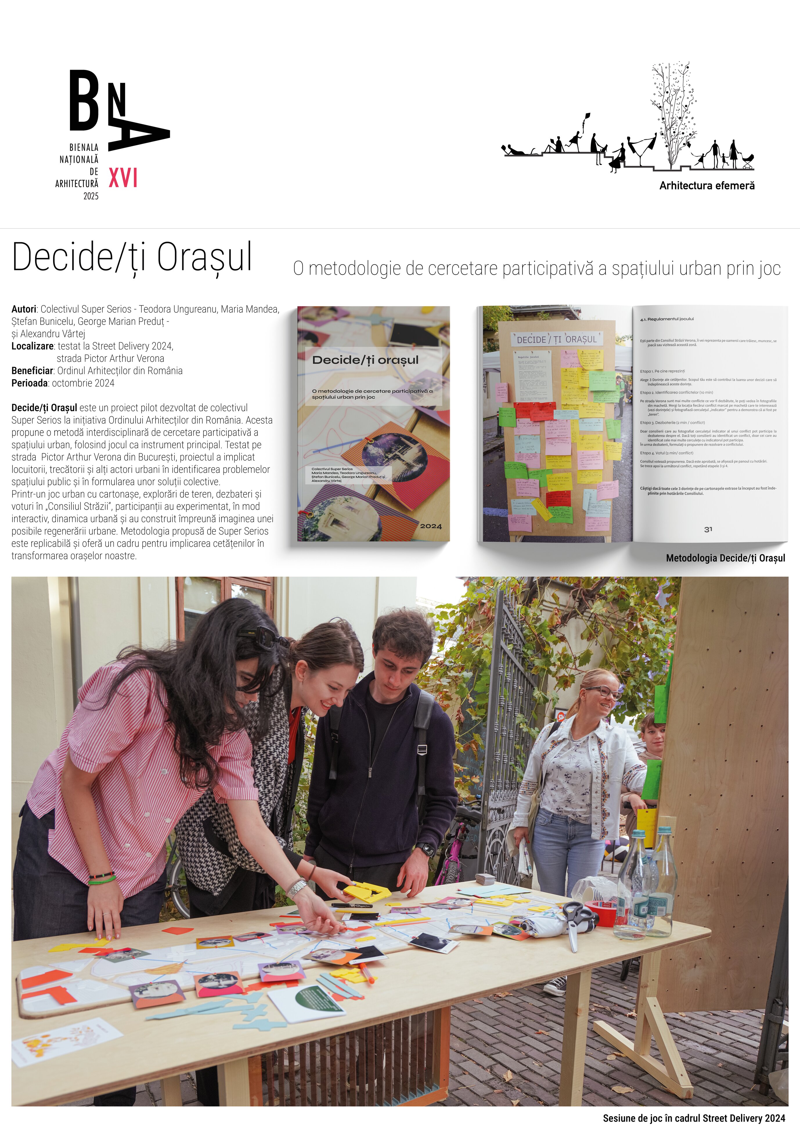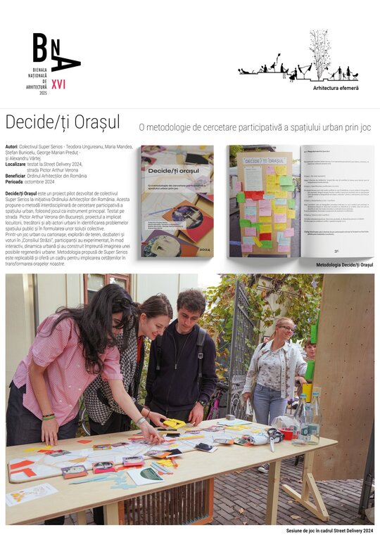 Decide/ți Orașul este un proiect pilot dezvoltat de colectivul Super Serios la inițiativa Ordinului Arhitecților din România. Acesta propune o metodă interdisciplinară de cercetare participativă a spațiului urban, folosind jocul ca instrument principal. Testat pe strada Pictor Arthur Verona din București, proiectul a implicat locuitorii, trecătorii și alți actori urbani în identificarea problemelor spațiului public și în formularea unor soluții colective.