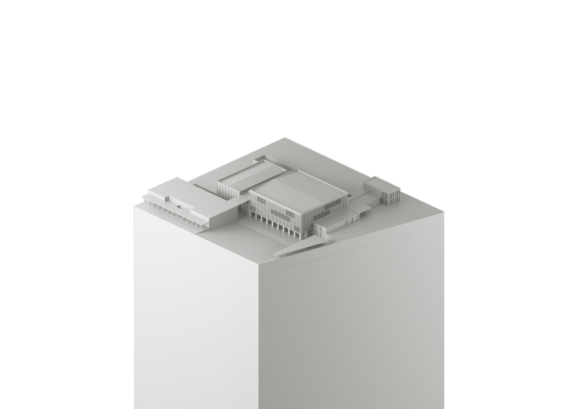 Compoziția volumetrică este alcătuită din trei corpuri majore, dispuse gradual ca masivitate și înălțime, în raport cu importanța funcțiunilor pe care le adăpostesc, și conectate între ele prin corpuri de legătură transparente, cu structură ușoară, ce găzduiesc funcțiuni conexe.