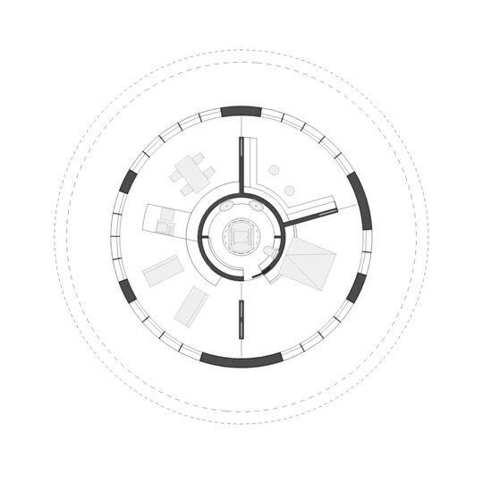 Organizarea spațiilor este circulară, în jurul unui nucleu central – baia. Celelalte încăperi îmbrățișează acest nucleu și se contopesc unele cu altele, fără delimitări rigide sau clare.
