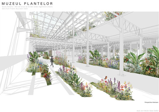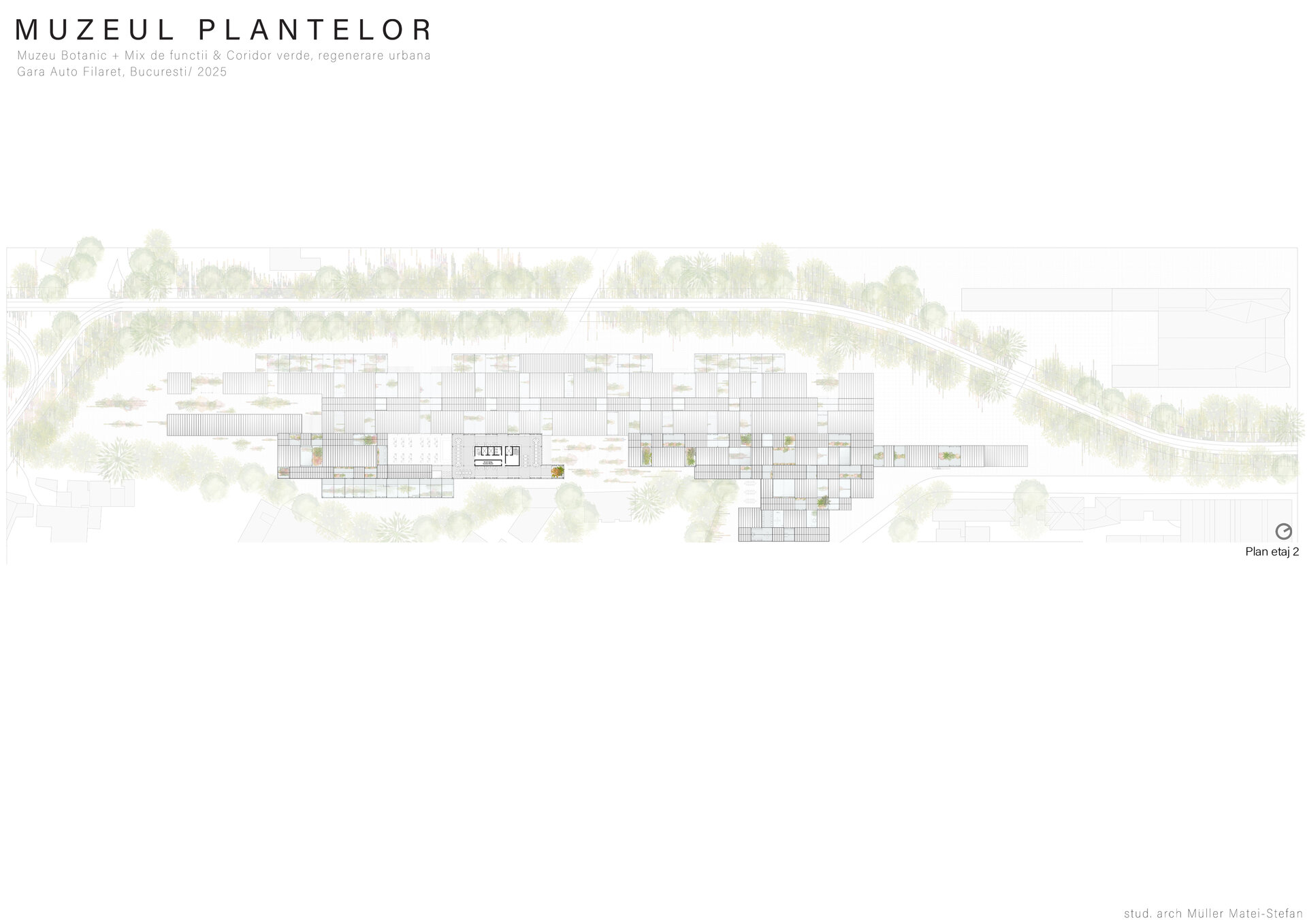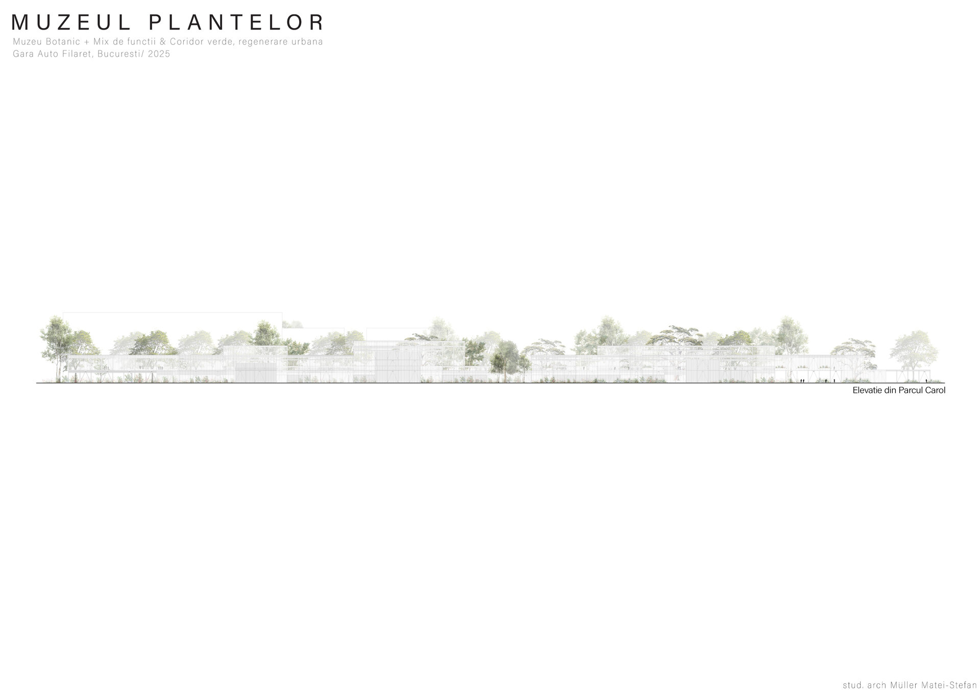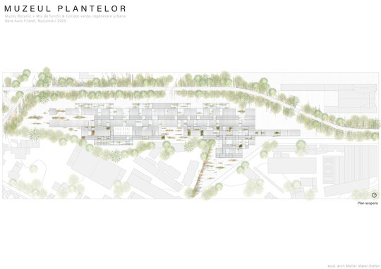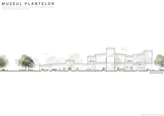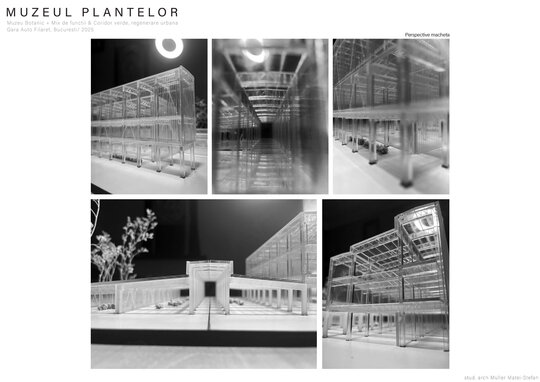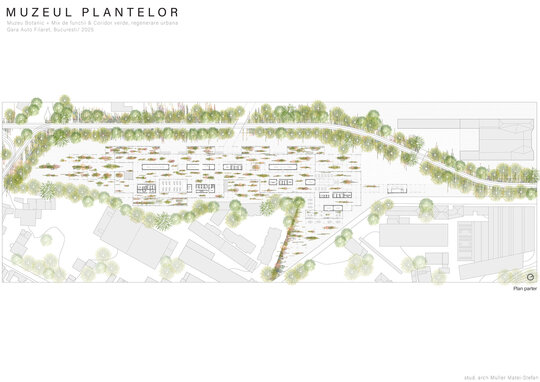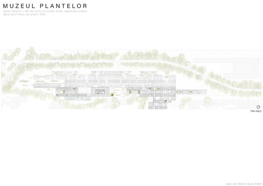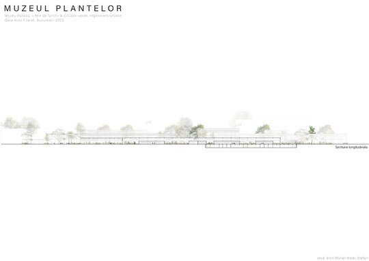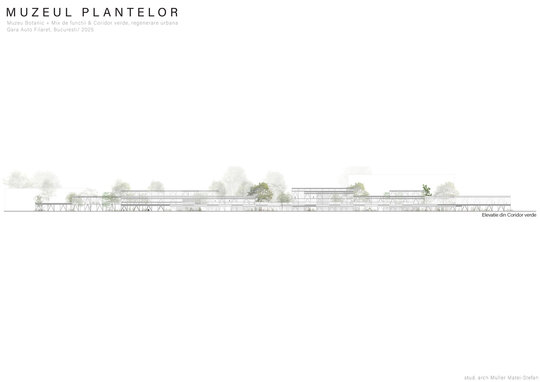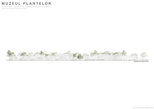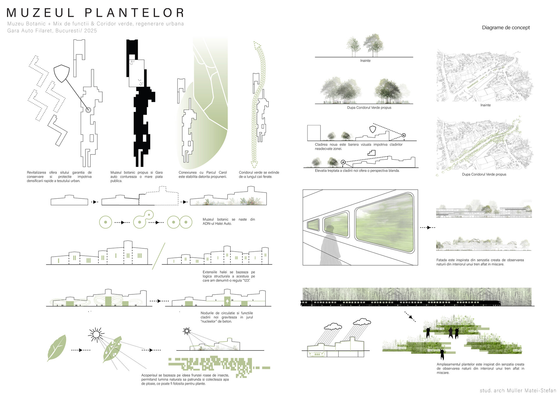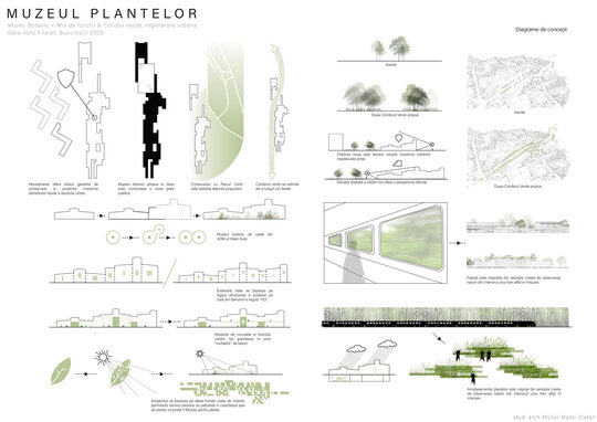 Numeroase decizii legate de estetica propunerii si planificarea acesteia orbiteaza in jurul inspiratiei provenite din senzatia creata de observarea naturii din interiorul unui tren aflat in miscare, in special fatadele si amplasamentul plantelor. Nodurile de circulatie sunt aflate in “nucleele” de beton care de asemenea, ofera functii spatiilor inconjuratoare si camere utilitare. Observata dinspre Parcul Carol, cladirea propusa actioneaza ca o bariera vizuala impotriva cladirilor neadecvate sitului de patrimoniu iar vazuta dinspre coridorul verde, ofera o perspectiva blanda ce creste treptat. In legatura cu expozitiile gazduite de muzeul botanic in sine, una dintre caracteristicile cheie pe care am dorit ca acestea sa le prezinte este fluiditatea, prin lipsa unor pereti suplimentari care sa anunte tranzitiile dintre ele. De asemenea, am creat subdiviziuni care impart expozitiile in diferite categorii, toate fiind esentiale pentru intelegerea lumii botanice: Clasificare, Evolutia Plantelor, Biomi, Practici sustenabile, Arhitectura verde, Semnificatie culturala, Interactiunea plantelor si Plante speciale. Toate aceste expozitii bazate pe subdiviziunile mentionate ar fi ciclice in functie de anotimpuri, avand posibilitatea sa functioneze impreuna sau uneori separat, fiind sustinute de sere, sistemul de ventilatie climatica si spatiile prevazute la parter si primul etaj.