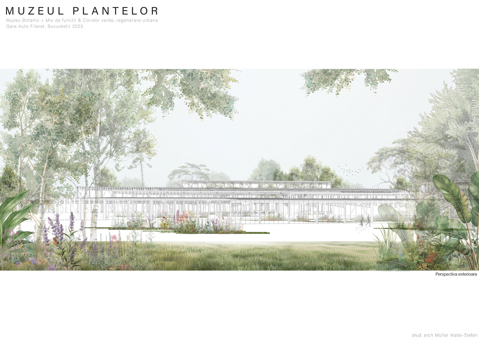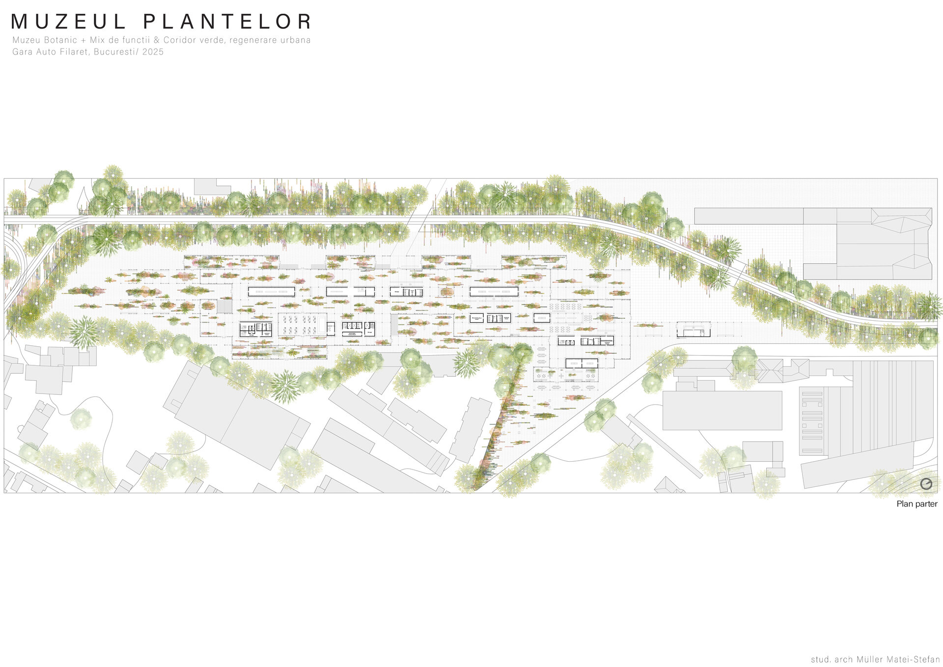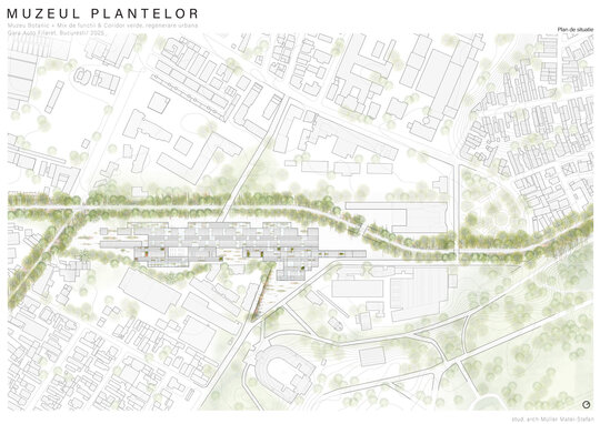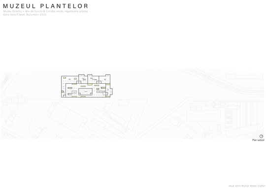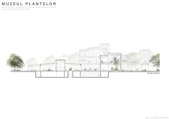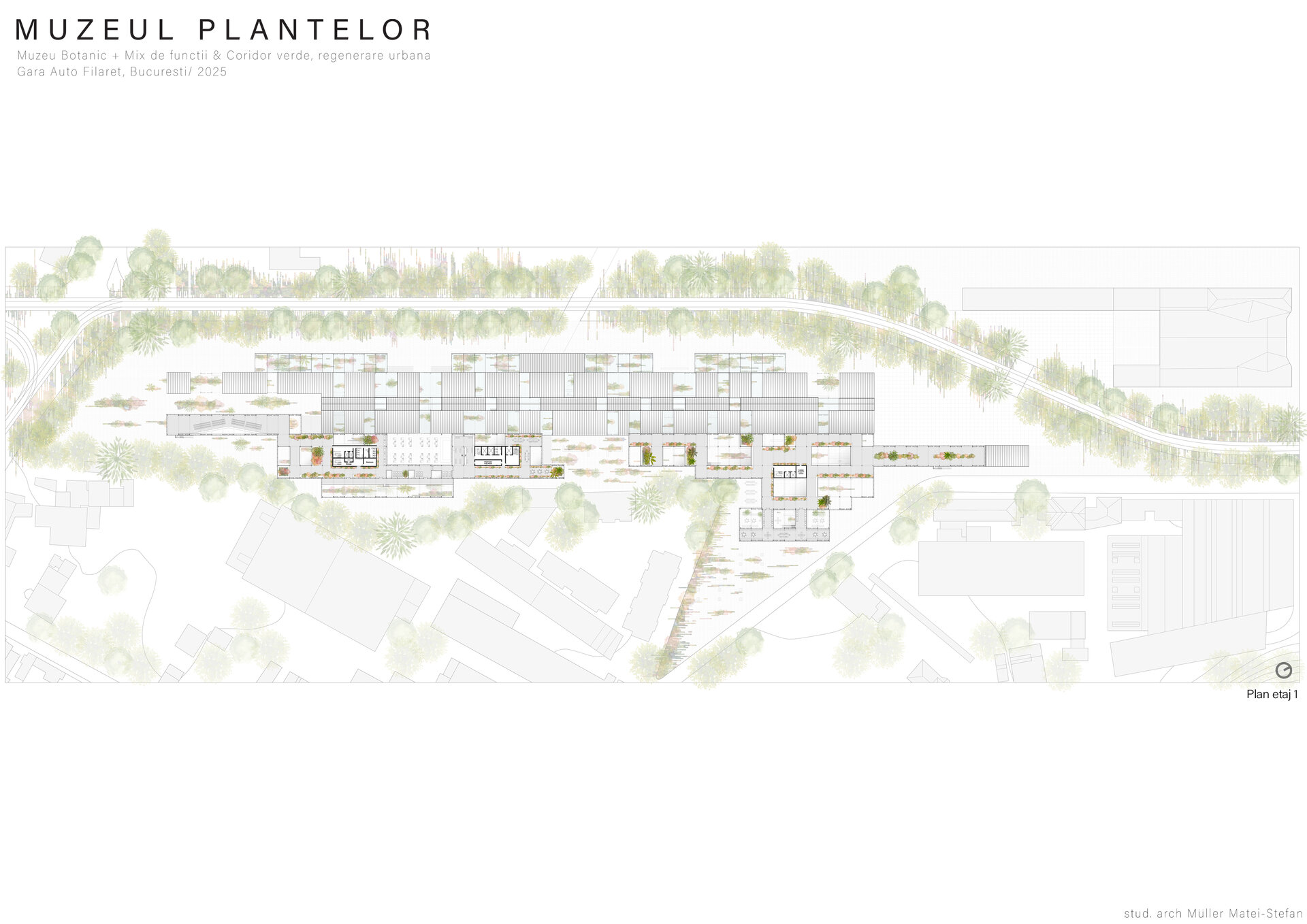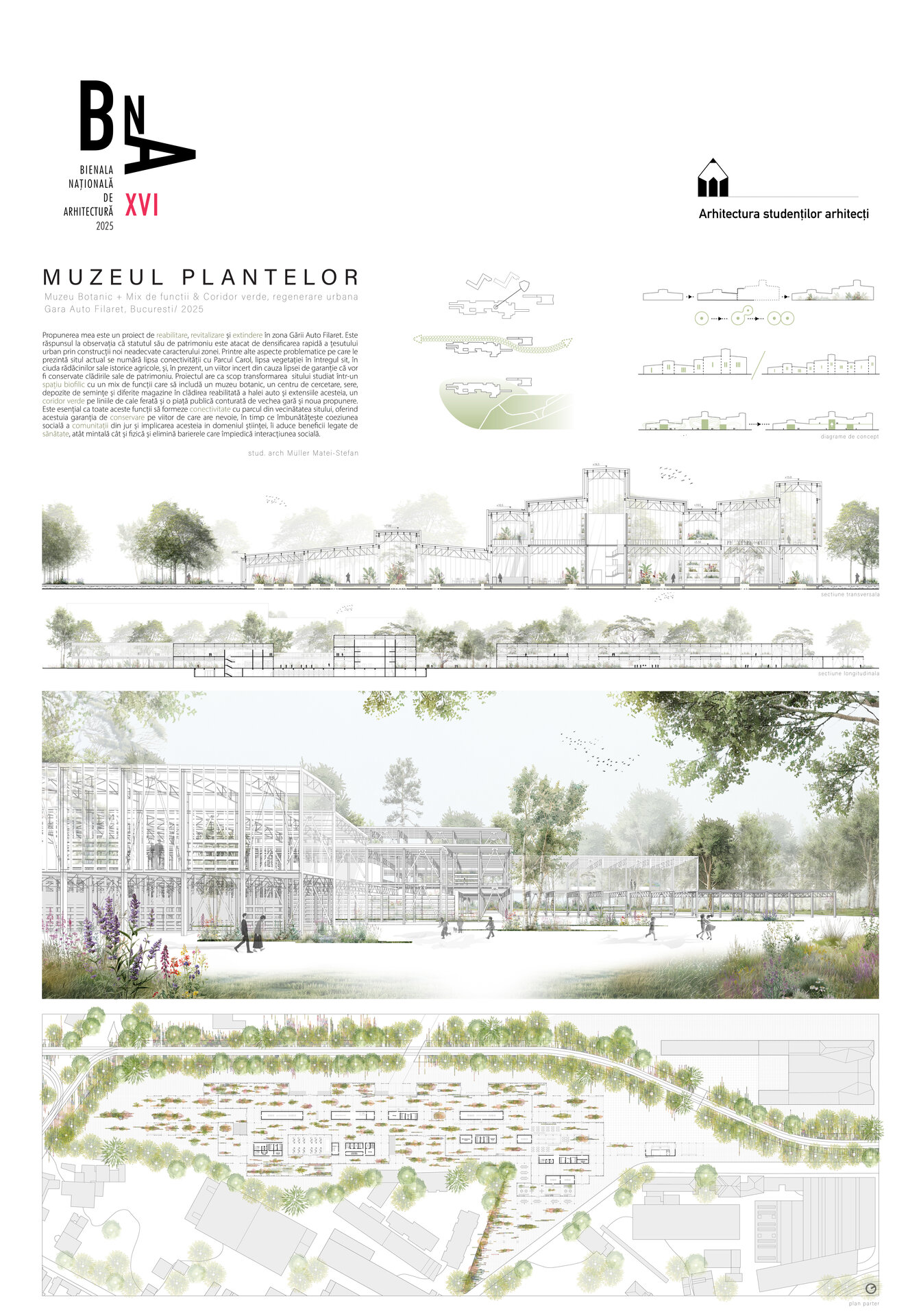 Numeroase decizii legate de estetica propunerii si planificarea acesteia orbiteaza in jurul inspiratiei provenite din senzatia creata de observarea naturii din interiorul unui tren aflat in miscare, in special fatadele si amplasamentul plantelor. Nodurile de circulatie sunt aflate in “nucleele” de beton care de asemenea, ofera functii spatiilor inconjuratoare si camere utilitare. Observata dinspre Parcul Carol, cladirea propusa actioneaza ca o bariera vizuala impotriva cladirilor neadecvate sitului de patrimoniu iar vazuta dinspre coridorul verde, ofera o perspectiva blanda ce creste treptat. In legatura cu expozitiile gazduite de muzeul botanic in sine, una dintre caracteristicile cheie pe care am dorit ca acestea sa le prezinte este fluiditatea, prin lipsa unor pereti suplimentari care sa anunte tranzitiile dintre ele. De asemenea, am creat subdiviziuni care impart expozitiile in diferite categorii, toate fiind esentiale pentru intelegerea lumii botanice: Clasificare, Evolutia Plantelor, Biomi, Practici sustenabile, Arhitectura verde, Semnificatie culturala, Interactiunea plantelor si Plante speciale. Toate aceste expozitii bazate pe subdiviziunile mentionate ar fi ciclice in functie de anotimpuri, avand posibilitatea sa functioneze impreuna sau uneori separat, fiind sustinute de sere, sistemul de ventilatie climatica si spatiile prevazute la parter si primul etaj.