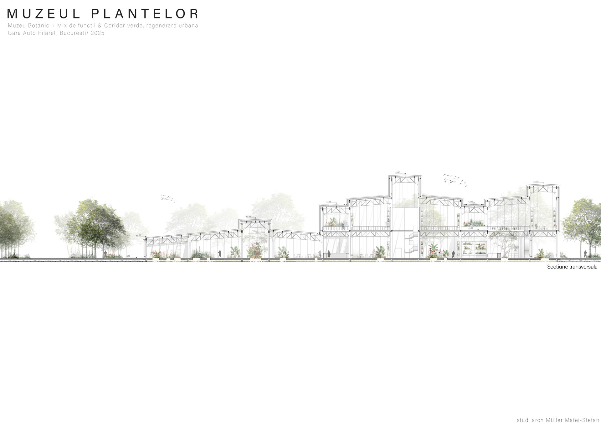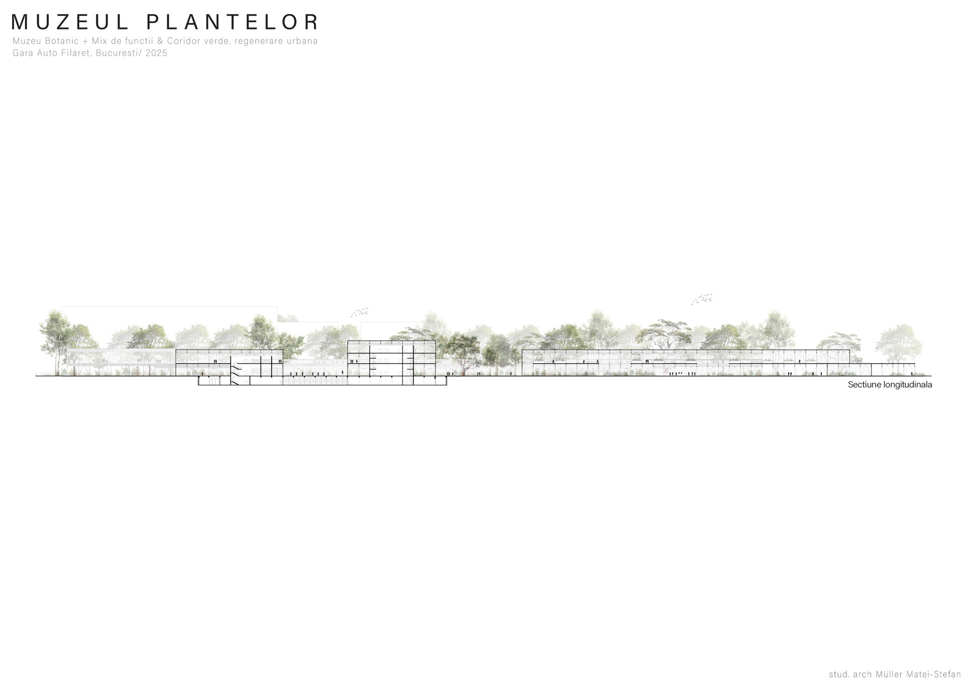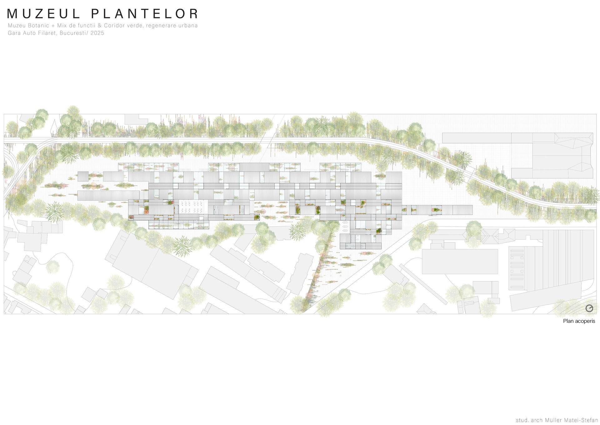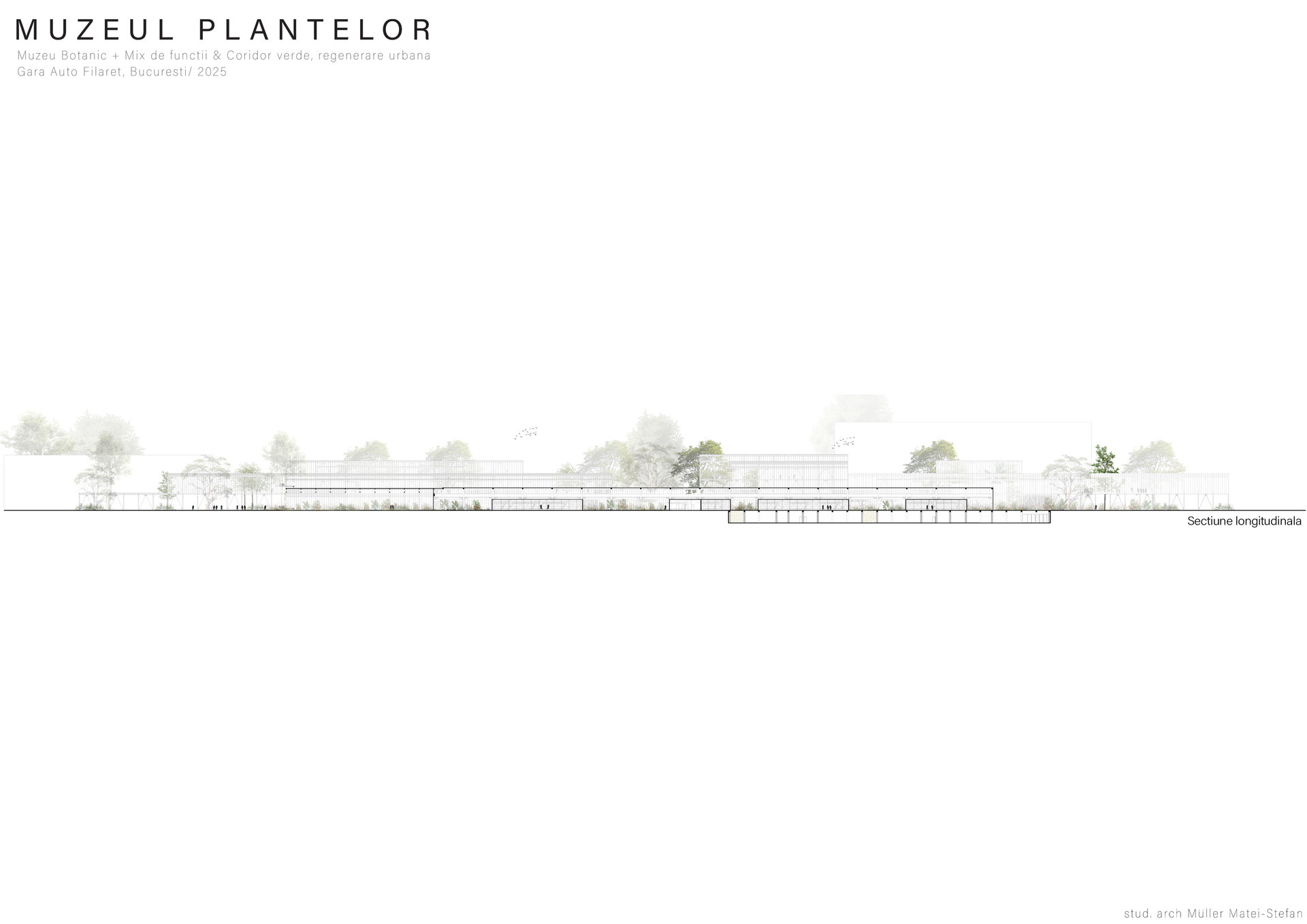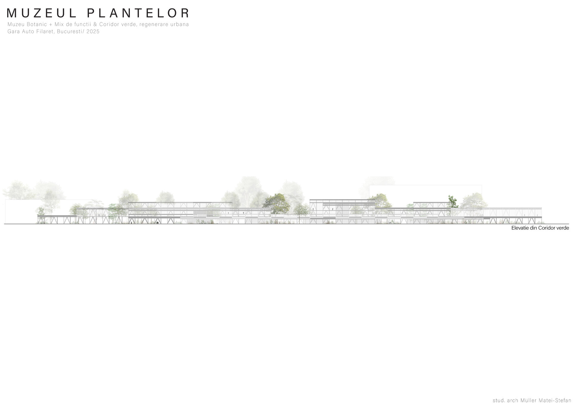 Numeroase decizii legate de estetica propunerii si planificarea acesteia orbiteaza in jurul inspiratiei provenite din senzatia creata de observarea naturii din interiorul unui tren aflat in miscare, in special fatadele si amplasamentul plantelor. Nodurile de circulatie sunt aflate in “nucleele” de beton care de asemenea, ofera functii spatiilor inconjuratoare si camere utilitare. Observata dinspre Parcul Carol, cladirea propusa actioneaza ca o bariera vizuala impotriva cladirilor neadecvate sitului de patrimoniu iar vazuta dinspre coridorul verde, ofera o perspectiva blanda ce creste treptat. In legatura cu expozitiile gazduite de muzeul botanic in sine, una dintre caracteristicile cheie pe care am dorit ca acestea sa le prezinte este fluiditatea, prin lipsa unor pereti suplimentari care sa anunte tranzitiile dintre ele. De asemenea, am creat subdiviziuni care impart expozitiile in diferite categorii, toate fiind esentiale pentru intelegerea lumii botanice: Clasificare, Evolutia Plantelor, Biomi, Practici sustenabile, Arhitectura verde, Semnificatie culturala, Interactiunea plantelor si Plante speciale. Toate aceste expozitii bazate pe subdiviziunile mentionate ar fi ciclice in functie de anotimpuri, avand posibilitatea sa functioneze impreuna sau uneori separat, fiind sustinute de sere, sistemul de ventilatie climatica si spatiile prevazute la parter si primul etaj.