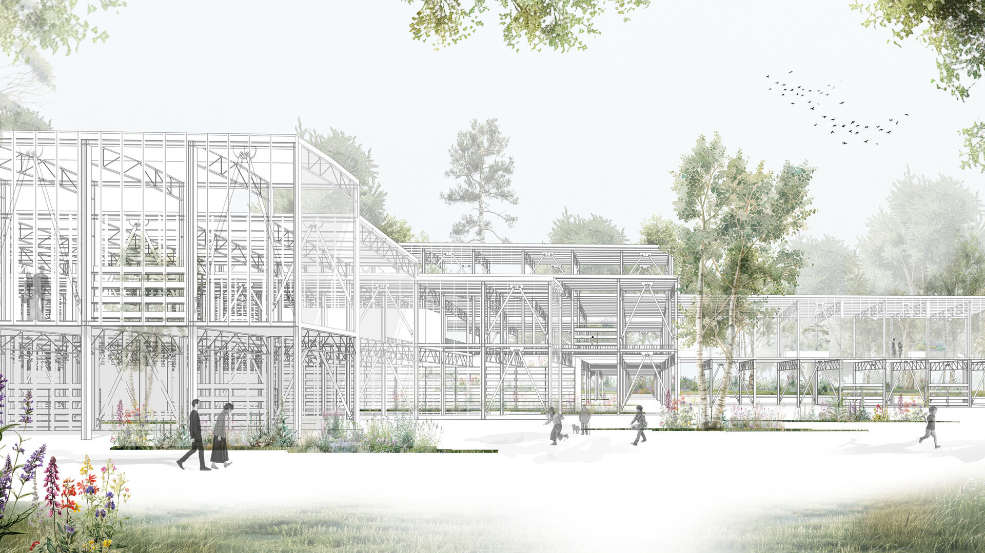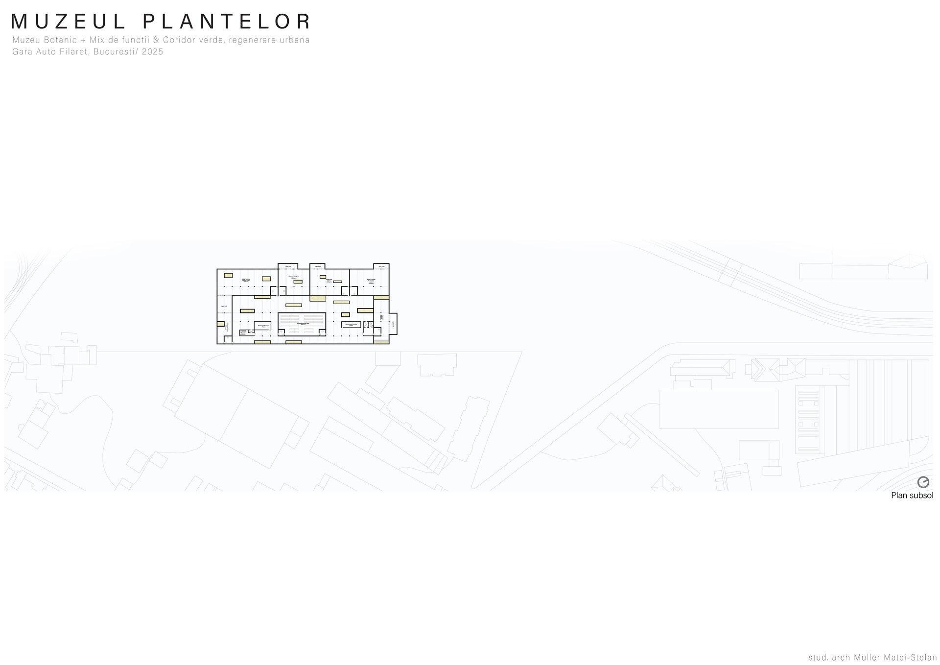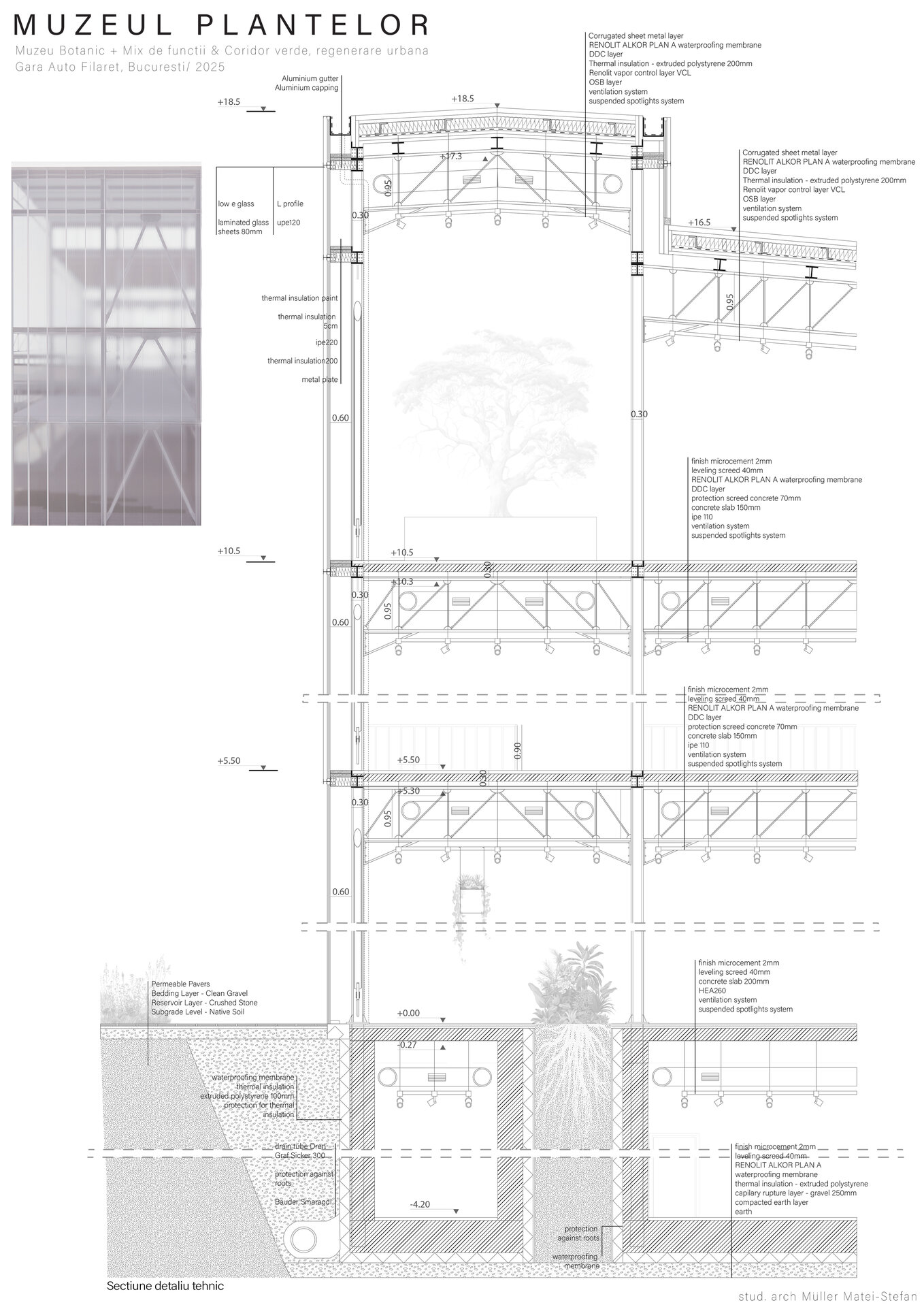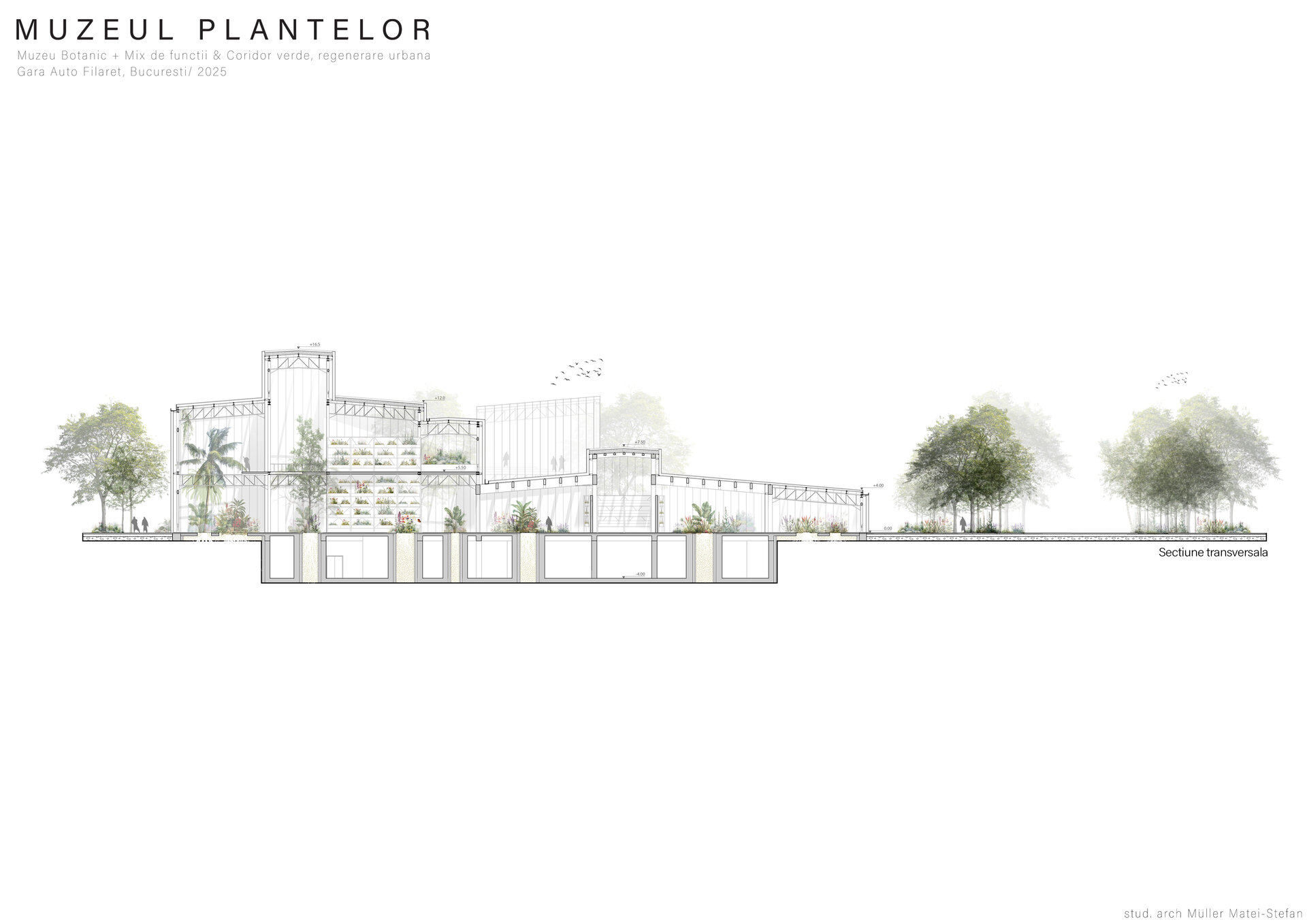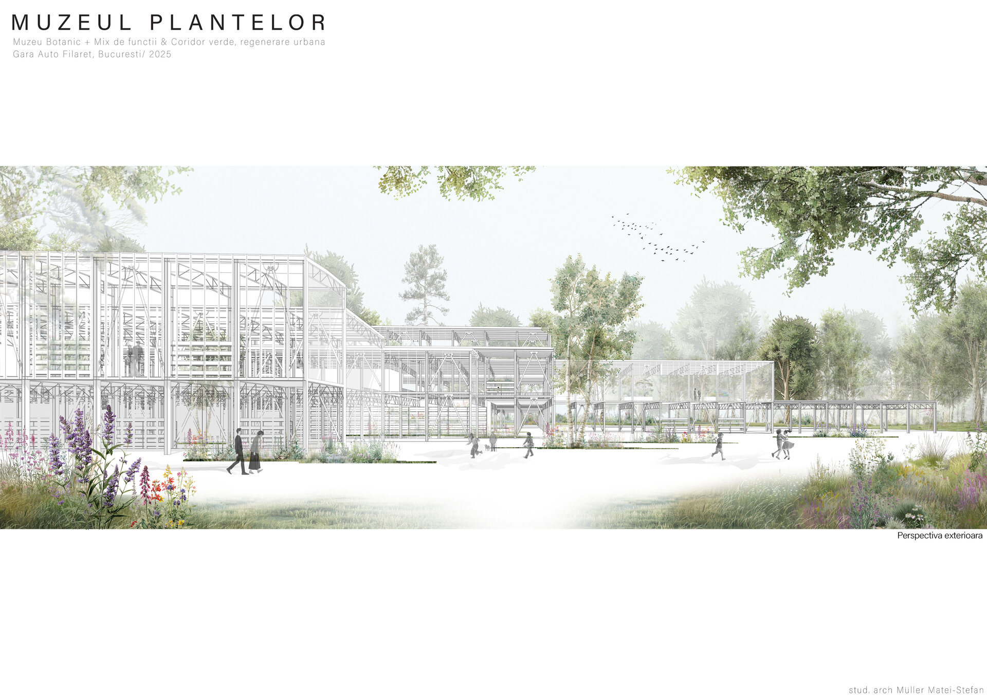 Numeroase decizii legate de estetica propunerii si planificarea acesteia orbiteaza in jurul inspiratiei provenite din senzatia creata de observarea naturii din interiorul unui tren aflat in miscare, in special fatadele si amplasamentul plantelor. Nodurile de circulatie sunt aflate in “nucleele” de beton care de asemenea, ofera functii spatiilor inconjuratoare si camere utilitare. Observata dinspre Parcul Carol, cladirea propusa actioneaza ca o bariera vizuala impotriva cladirilor neadecvate sitului de patrimoniu iar vazuta dinspre coridorul verde, ofera o perspectiva blanda ce creste treptat. In legatura cu expozitiile gazduite de muzeul botanic in sine, una dintre caracteristicile cheie pe care am dorit ca acestea sa le prezinte este fluiditatea, prin lipsa unor pereti suplimentari care sa anunte tranzitiile dintre ele. De asemenea, am creat subdiviziuni care impart expozitiile in diferite categorii, toate fiind esentiale pentru intelegerea lumii botanice: Clasificare, Evolutia Plantelor, Biomi, Practici sustenabile, Arhitectura verde, Semnificatie culturala, Interactiunea plantelor si Plante speciale. Toate aceste expozitii bazate pe subdiviziunile mentionate ar fi ciclice in functie de anotimpuri, avand posibilitatea sa functioneze impreuna sau uneori separat, fiind sustinute de sere, sistemul de ventilatie climatica si spatiile prevazute la parter si primul etaj.