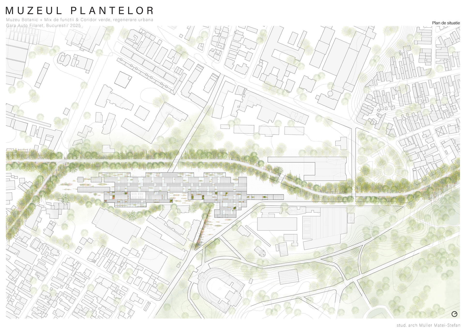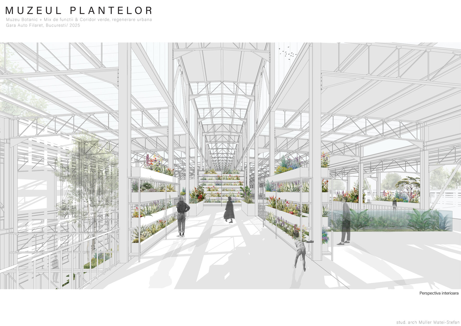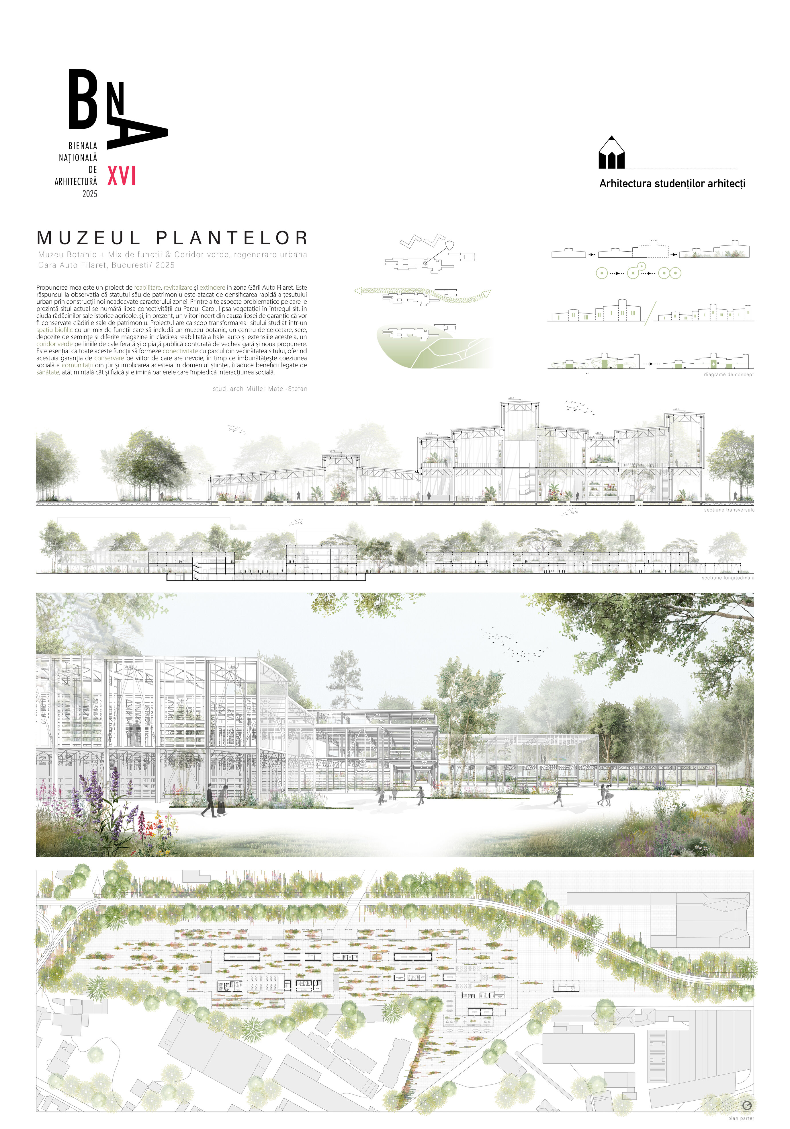 Propunerea mea este un proiect de reabilitare, revitalizare si extindere in zona Garii Auto Filaret. Este raspunsul la observatia ca statutul sau de patrimoniu este atacat de densificarea rapida a tesutului urban prin constructii noi neadecvate caracterului zonei. Printre alte aspecte problematice pe care le prezinta situl actual se numara lipsa conectivitatii cu Parcul Carol, lipsa vegetatiei in intregul sit, in ciuda radacinilor sale istorice agricole, si, in prezent, un viitor incert din cauza lipsei de garantie ca vor fi conservate cladirile sale de patrimoniu. Proiectul are ca scop transformarea sitului studiat intr-un spatiu biofilic cu un mix de functii care sa includa un muzeu botanic, un centru de cercetare, sere, depozite de seminte si diferite magazine in cladirea reabilitata a halei auto si extensiile acesteia, un coridor verde pe liniile de cale ferata si o piata publica, conturata de vechea gara si noua propunere. Este esential ca toate aceste functii sa formeze conectivitate cu parcul din vecinatatea sitului, oferind acestuia garantia de conservare pe viitor de care are nevoie, in timp ce imbunatateste coeziunea sociala a comunitatii din jur si implicarea acesteia in domeniul stiintei, ii aduce beneficii legate de sanatate, atat mintala cat si fizica si elimina barierele care impiedica interactiunea sociala.