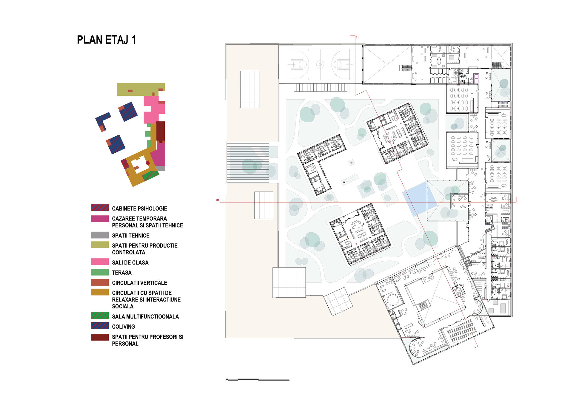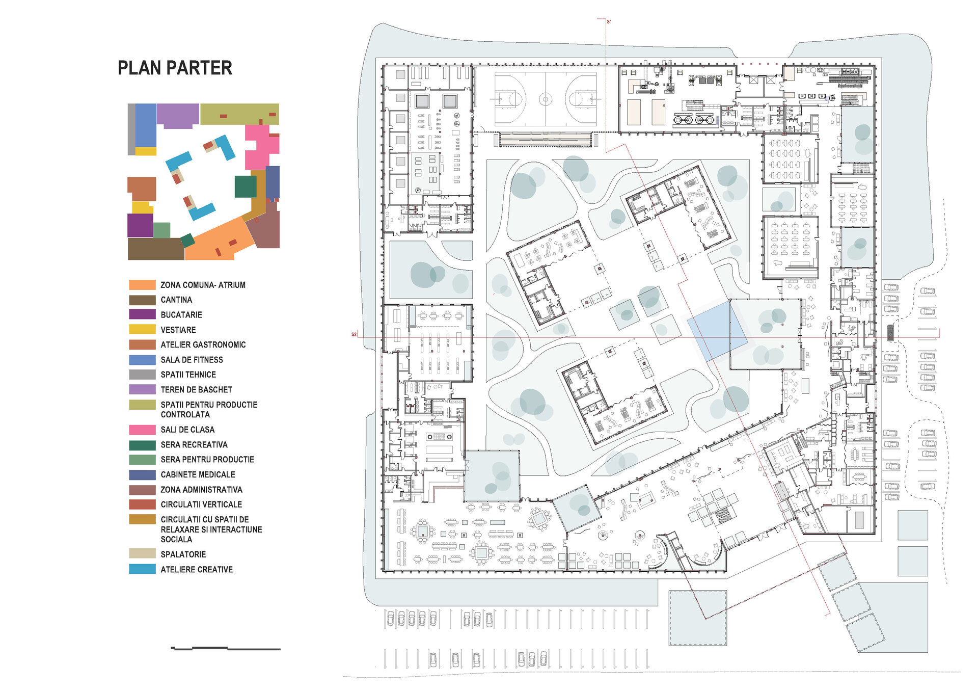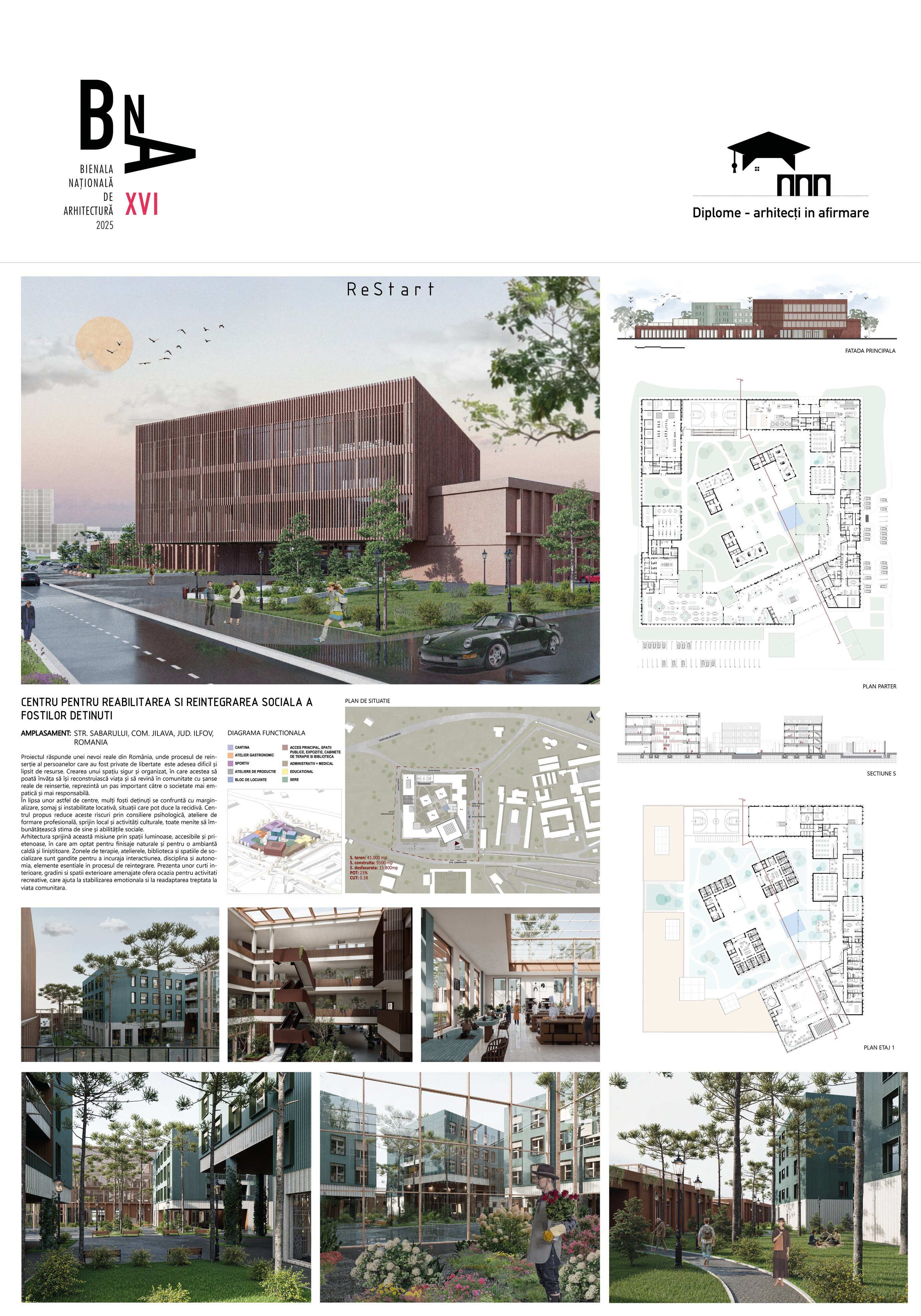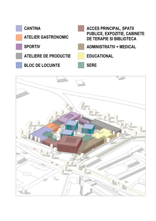 Arhitectura și modul de organizare al centrului joacă un rol esențial în îndeplinirea acestei misiuni. Spațiile sunt concepute astfel încât să inspire încredere și să creeze o atmosferă luminoasă, pozitivă și prietenoasă. Zonele de terapie oferă cadrul necesar pentru vindecare emoțională, atelierele sprijină disciplina și dobândirea unor competențe practice, biblioteca devine un loc pentru educație, cunoaștere și reflecție, iar spațiile de socializare stimulează interacțiunea și colaborarea. Curțile interioare, grădinile și spațiile verzi exterioare nu au doar un rol estetic, ci sunt concepute pentru a recrea un mediu familiar, liniștitor și plăcut, care să le ofere beneficiarilor sentimentul de apartenență și de siguranță. Contactul direct cu natura, chiar și în forme controlate – un colț verde, o grădină de legume, o alee umbrită sau un spațiu de odihnă sub copaci – contribuie la reducerea stresului și la stabilizarea emoțională. Pentru persoanele aflate într-un parcurs de reintegrare, aceste spații devin adevărate „zone de respiro”, unde își pot recăpăta echilibrul și pot experimenta bucuria unor activități simple, poate uitate in timp. Prin acest proiect, se demonstrează că reintegrarea socială nu este un vis utopic, ci un proces funcțional și eficient atunci când există voință, empatie și o infrastructură adecvată. Este o șansă reală ca oamenii să își reia drumul în viață într-un mod echilibrat, iar societatea să evolueze prin recuperarea și valorizarea resurselor umane, în loc să le piardă.