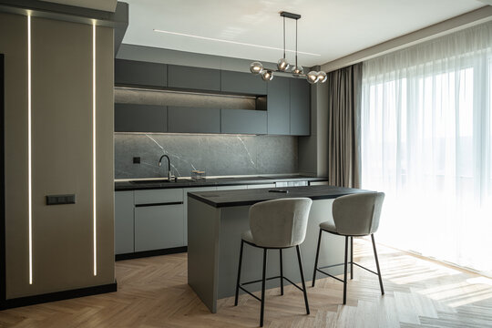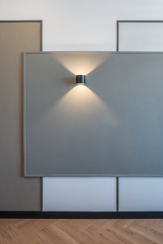 Schema cromatică adoptată accentuează caracterul masculin al interiorului. O gamă de griuri – de la tonuri calde, până la nuanțe închise, aproape negre – structurează fundalul, în contrast cu textura naturală a parchetului, care devine element de echilibru și sursă de căldură vizuală. Această opoziție între austeritate și materialitate caldă definește ambianța, transformând spațiul într-un mediu atât riguros, cât și primitor.