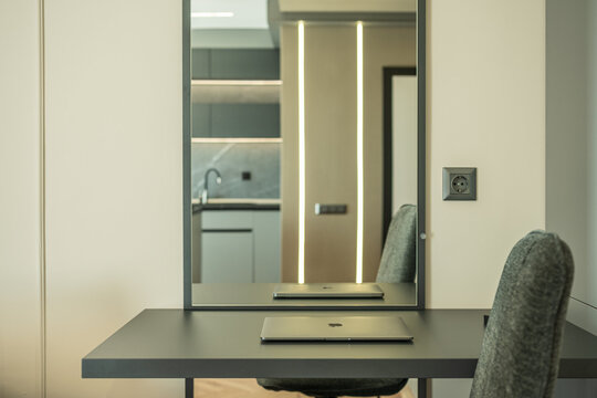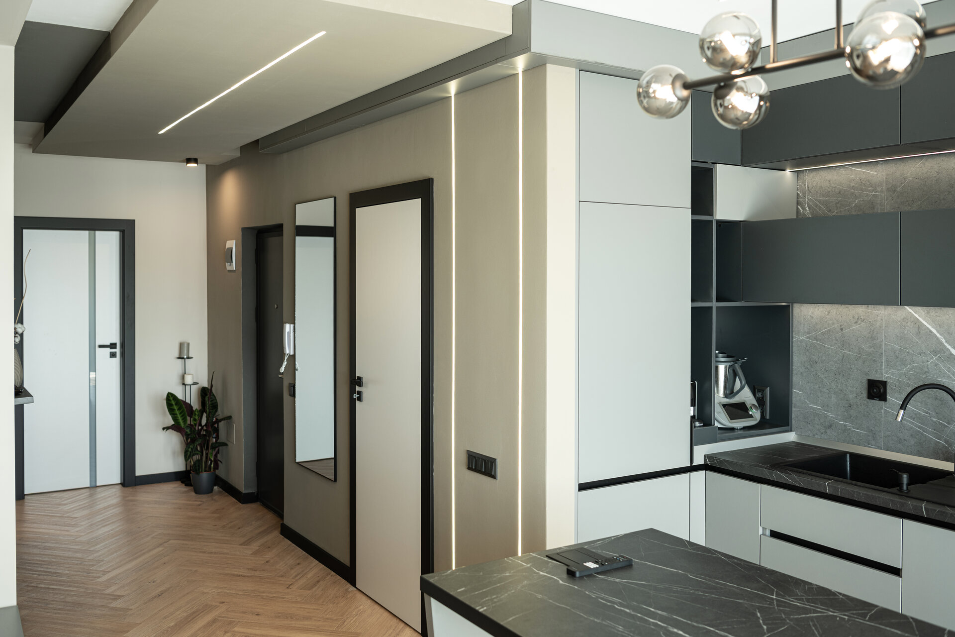 Iluminatul a fost tratat ca parte integrantă a conceptului. Benzile LED, integrate discret în arhitectura interioară, permit configurarea unor scenarii multiple: de la o lumină difuză și intimă, la o atmosferă dinamică, stratificată prin efecte de suprapunere și reflexie. Astfel, pe timpul nopții, apartamentul capătă o identitate variabilă, capabilă să susțină diferite tipuri de activități și stări.