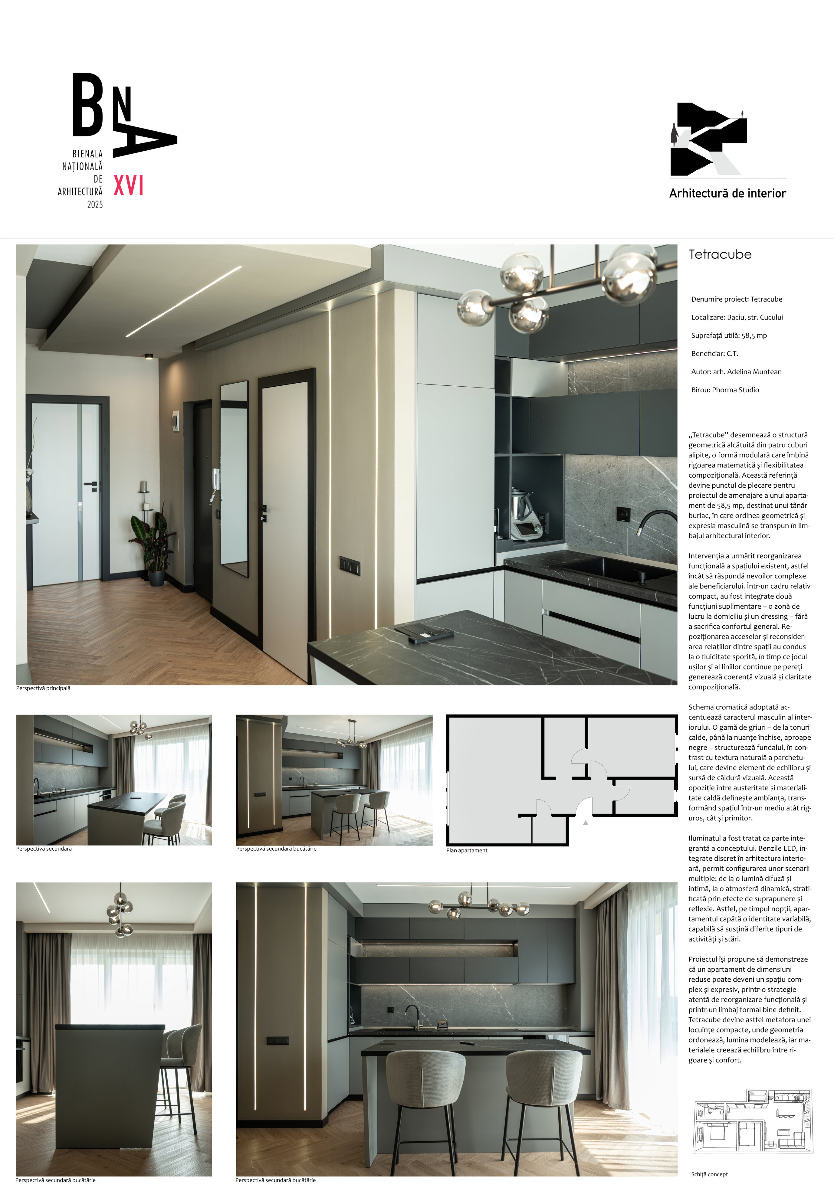„Tetracube” desemnează o structură geometrică alcătuită din patru cuburi alipite, o formă modulară care îmbină rigoarea matematică și flexibilitatea compozițională. Această referință devine punctul de plecare pentru proiectul de amenajare a unui apartament de 58,5 mp, destinat unui tânăr burlac, în care ordinea geometrică și expresia masculină se transpun în limbajul arhitectural interior.