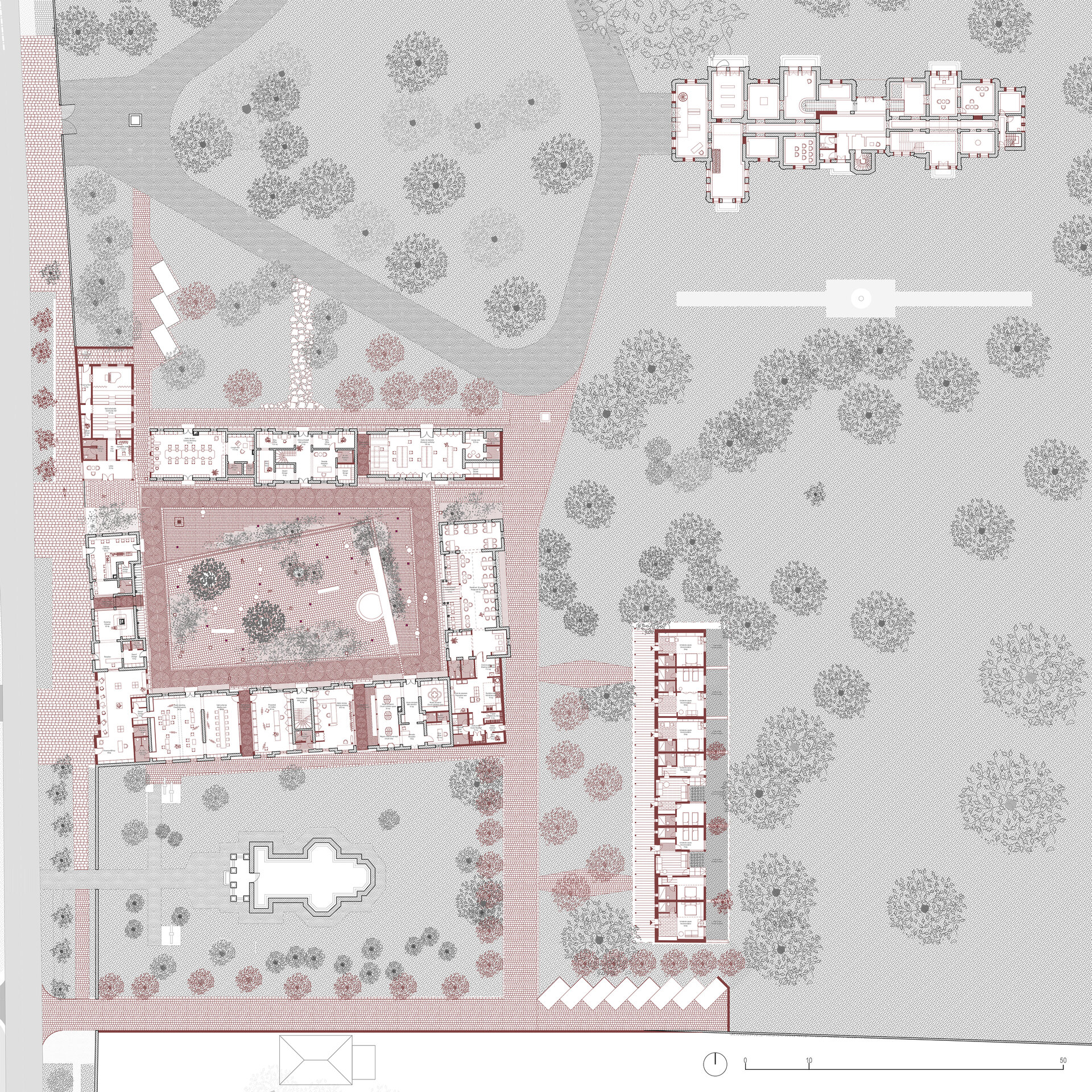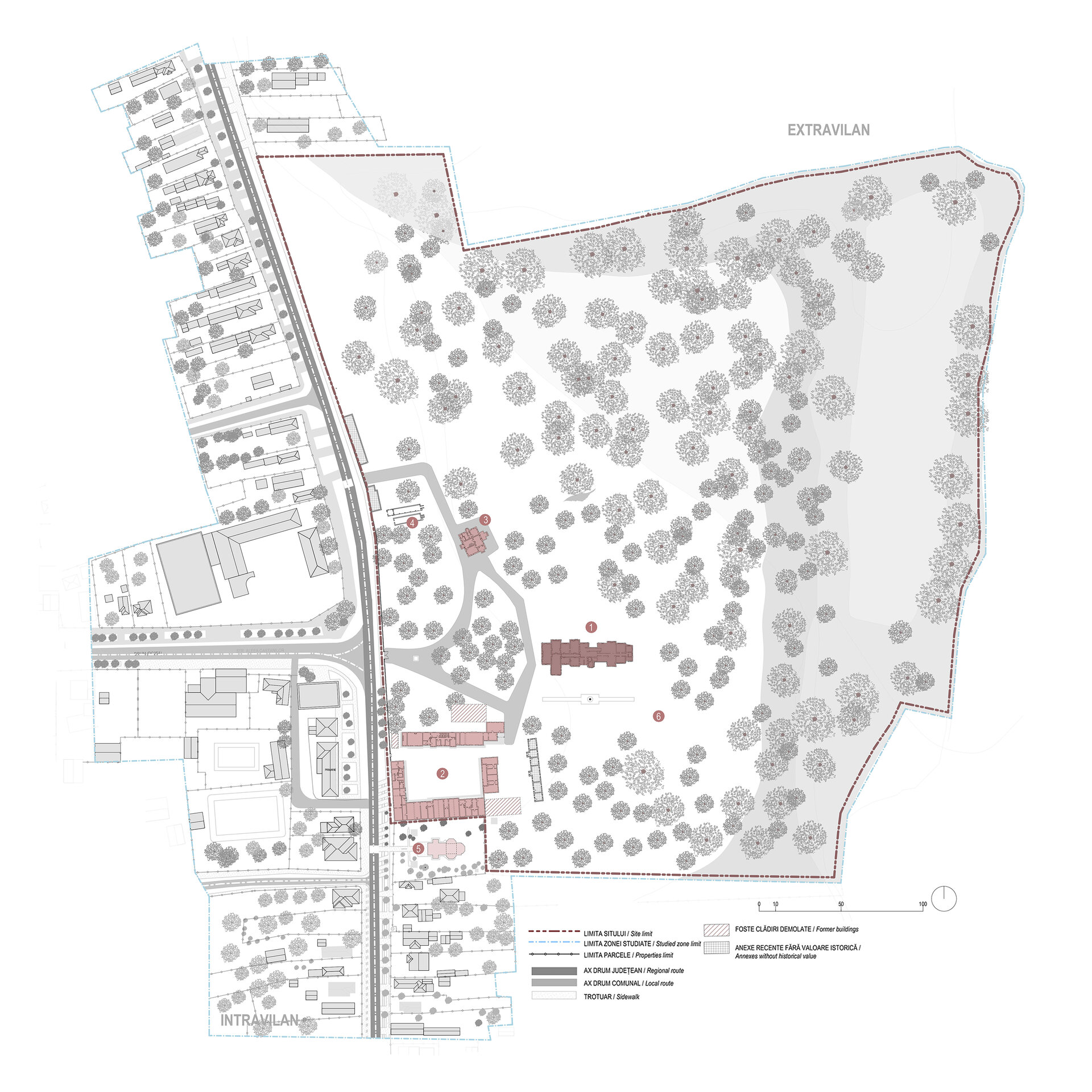 Astăzi domeniul se întinde pe o suprafață de 14 hectare și găzduiește ansamblul unui vechi conac construit după planurile arhitectului francez Paul Gottereau între 1882 - 1892 (1), anexele gospodărești construite separat de acesta (transformate în sanatoriu T.B.C. în anii 1950-1960) și în prezent dezafectat complet (2), vila de vacanță a moștenitoarei Pussy Callimachi) (3), două sere de legume în apropiere de intrarea nordică al ansamblului (4) și biserica de secol al XIX-lea (construită la puțin timp după inaugurarea conacului (5), de către același arhitect, în prezent nu mai face parte din ansamblu). La acestea se adaugă și o serie de amenajări peisagere ale parcului. Edificiul care a devenit emblema domeniului, palatul Conacul Callimachi-Văcărescu se poziționează nu neapărat strategic din punct de vedere al orientării (având una dintre laturile principale spre nord), amplasamentul său fiind cel mai probabil o rezultantă a factorilor dați de sit, și anume preexistența unei construcții anterioare de gabarit mult mai mic. Conacul reprezintă în memoria colectivă o prezență față de care comunitatea locală se raportează nostalgic și de la o oarecare distanță fatalistă - un castel ruinat, abandonat, a cărui singură urmă încă persistentă este legenda populară despre ceea ce a fost. Din această nevoie, amenajarea unor spații expoziționale în sălile conacului și a unui parcurs muzeal imersiv, poate fi unul din instrumentele care să asigure apropierea și educarea actorilor interni și externi față de o mărturie istorică. Cu toate acestea, un parcurs muzeal, pentru a deveni atractiv și pentru a asigura întreținerea în permanență a construcției, nu poate răspunde de unul singur problematicii abandonului - de unde rezultă și necesitatea asocierii acestuia cu alte funcțiuni și activități conexe. Programul unei școli de vară ar putea reprezenta prilejul de a aduce împreună studenți și tineri profesioniști și pasionați cu activitate în domenii precum arhitectură și restaurare, arheologie, peisagistică, arboricultură, istorie și arte vizuale.