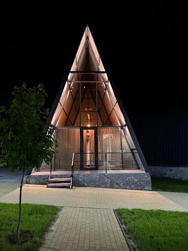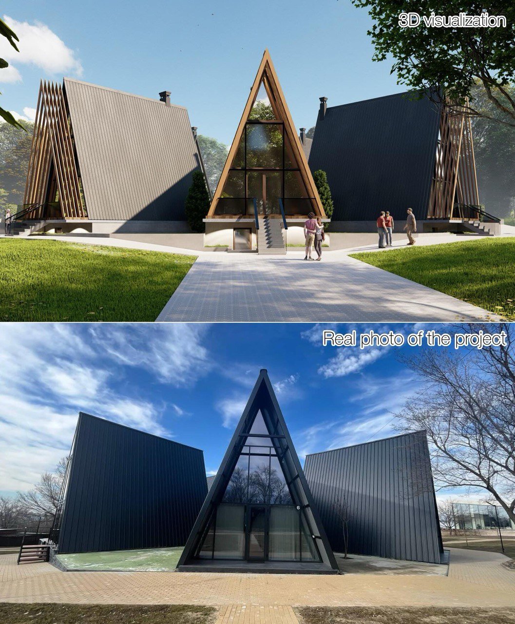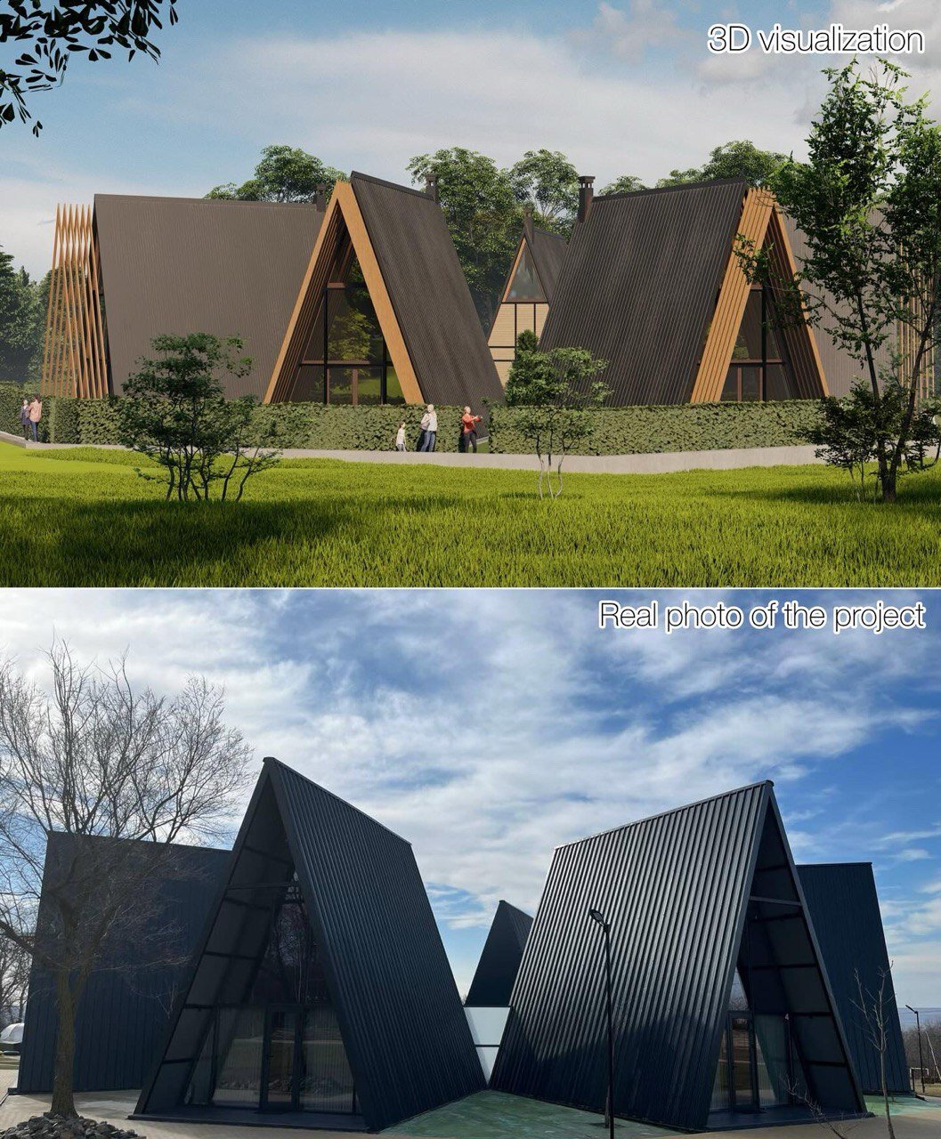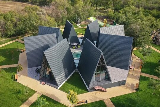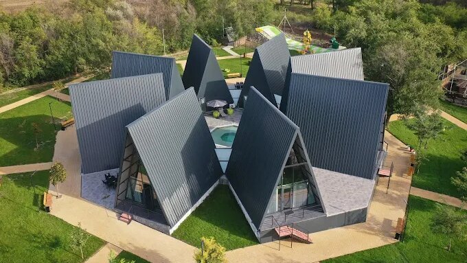 Arhitectura A-frame, caracterizată prin acoperiș abrupt și structură simplă, evocă tipologia cabanelor tradiționale reinterpretate într-o cheie contemporană. Materialele naturale – lemn, sticlă, metal – asigură armonizarea construcțiilor cu mediul înconjurător.