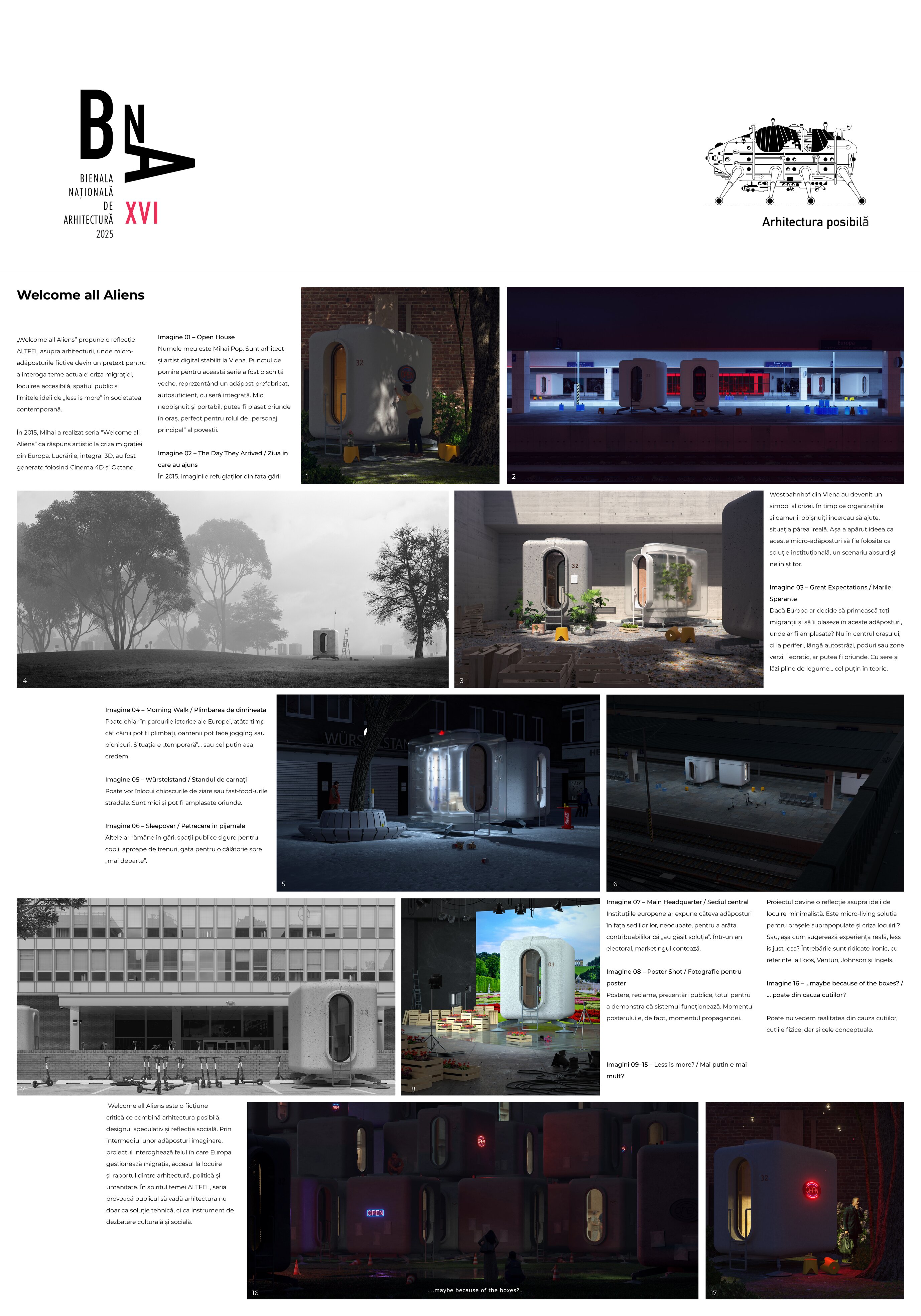 Welcome all Aliens este o ficțiune critică ce combină arhitectura posibilă, designul speculativ și reflecția socială. Prin intermediul unor adăposturi imaginare, proiectul interoghează felul în care Europa gestionează migrația, accesul la locuire și raportul dintre arhitectură, politică și umanitate. În spiritul temei ALTFEL, seria provoacă publicul să vadă arhitectura nu doar ca soluție tehnică, ci ca instrument de dezbatere culturală și socială.