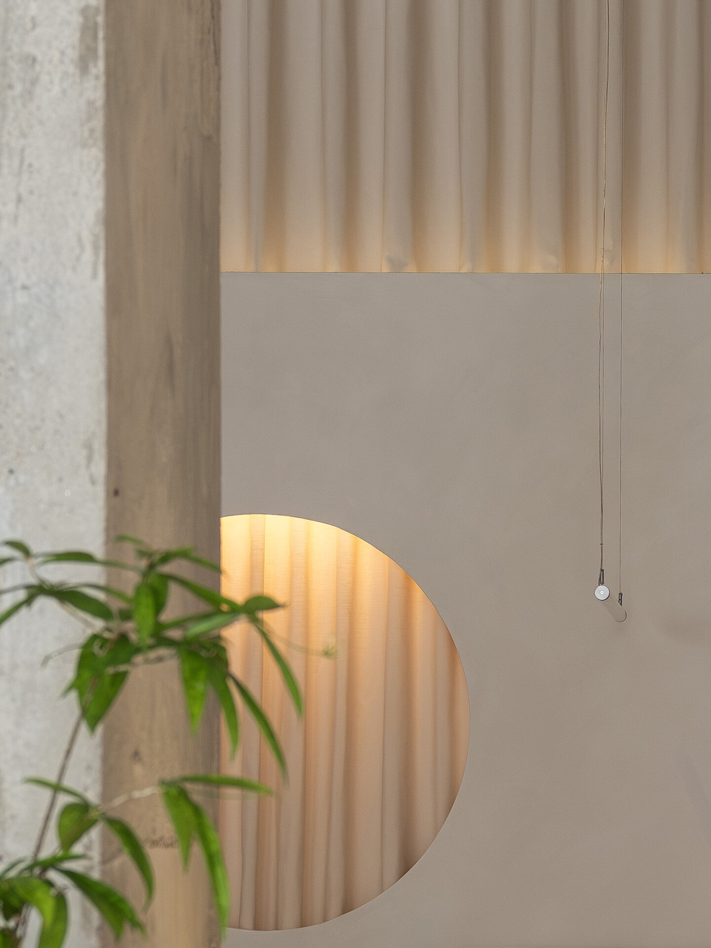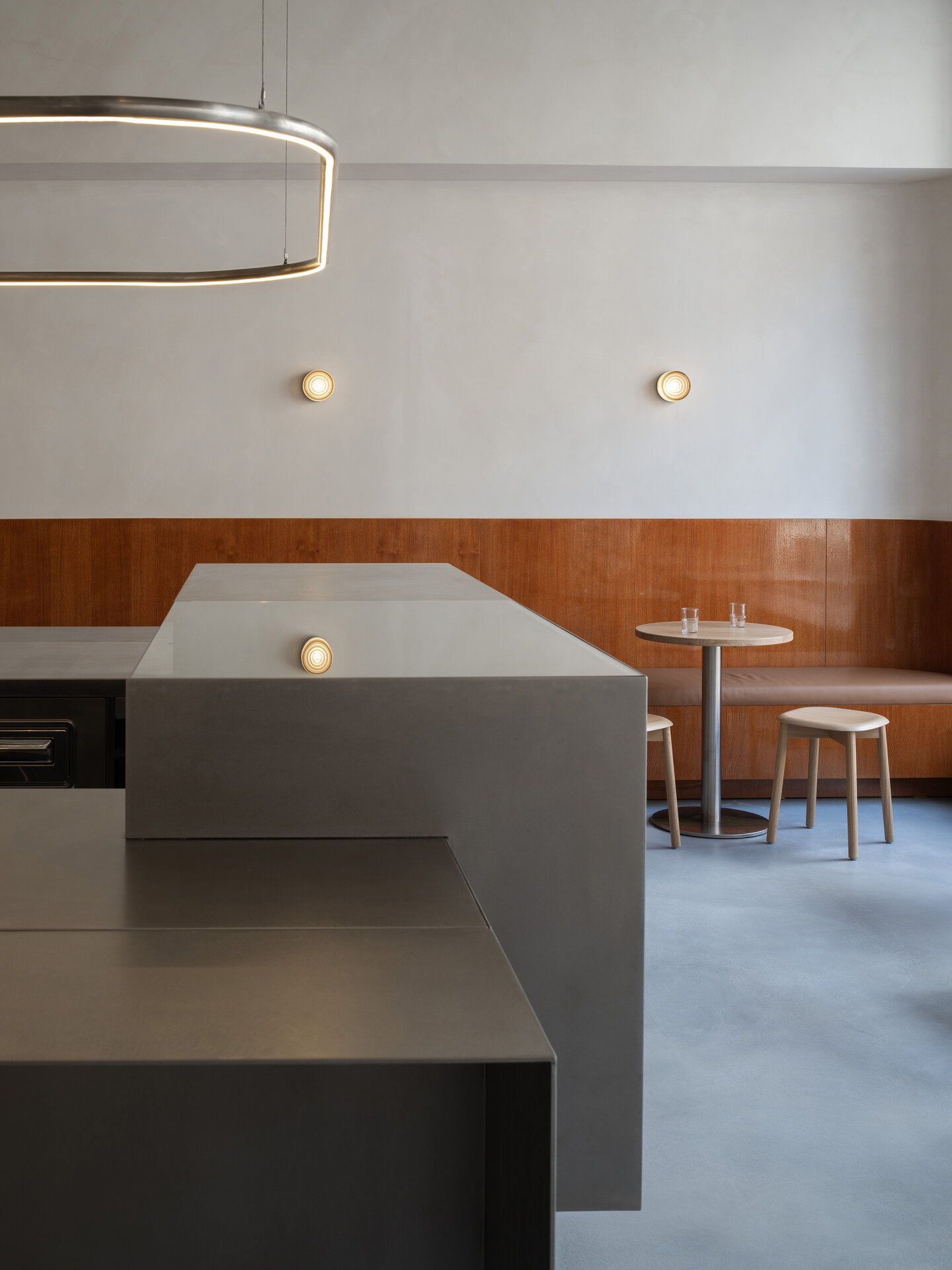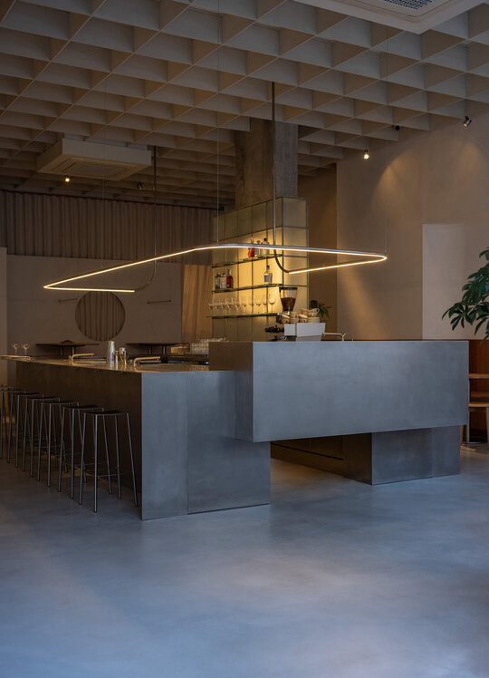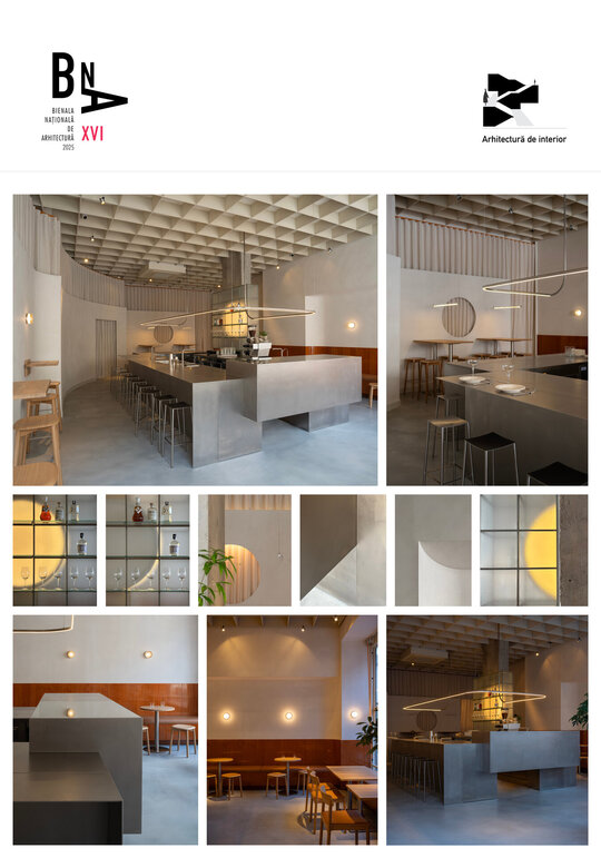 Spațiul capătă multiple profunzimi atunci când lumina întâlnește momentele meștesugite. Ziua, lumina soarelui se revarsă peste betonul brut, lemnul cald și metalul aproape mat - acestea sunt orele de contemplare matinală. Seara, spațiul trece prin propria metamorfoză: prezența industrială și rece a barului este atenuată de coregrafia ambientală a luminii; un display-wall luminos schimbă în tonuri aurii metalul iar decupajul perfect rotund din peretele-paravan revarsă lumină galbenă menită să simuleze o a doua fațadă a încăperii; Iluminatul este conceput asemenea unui mise-en-scène adaptabil și permite transformarea spațiului pentru a crea scenografii diferite.