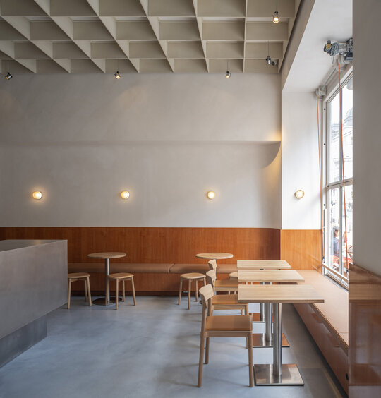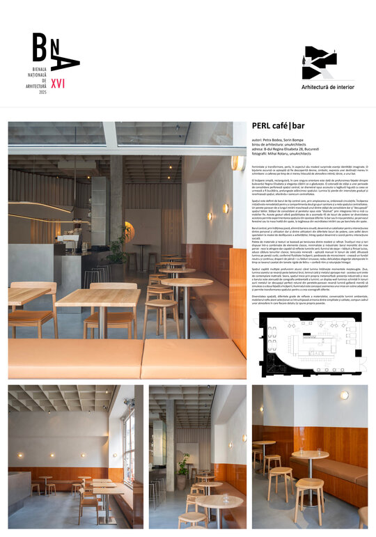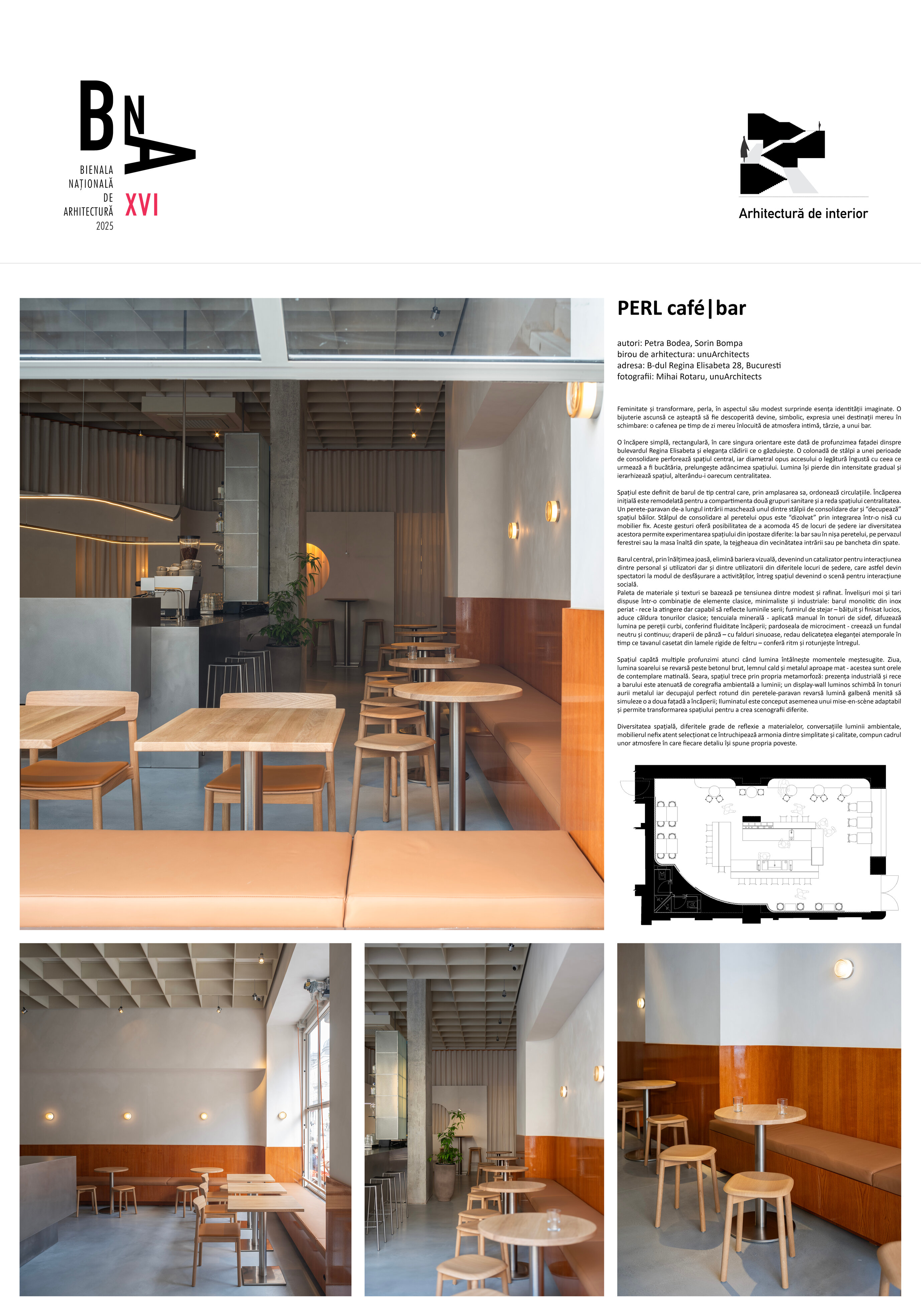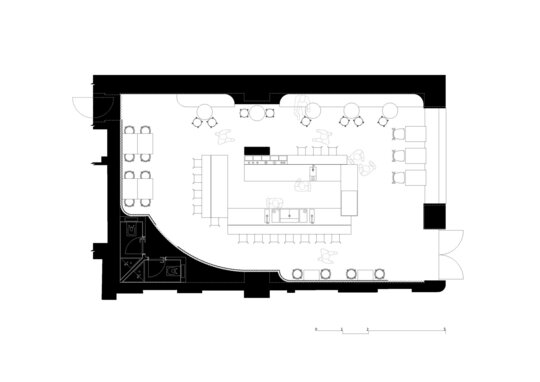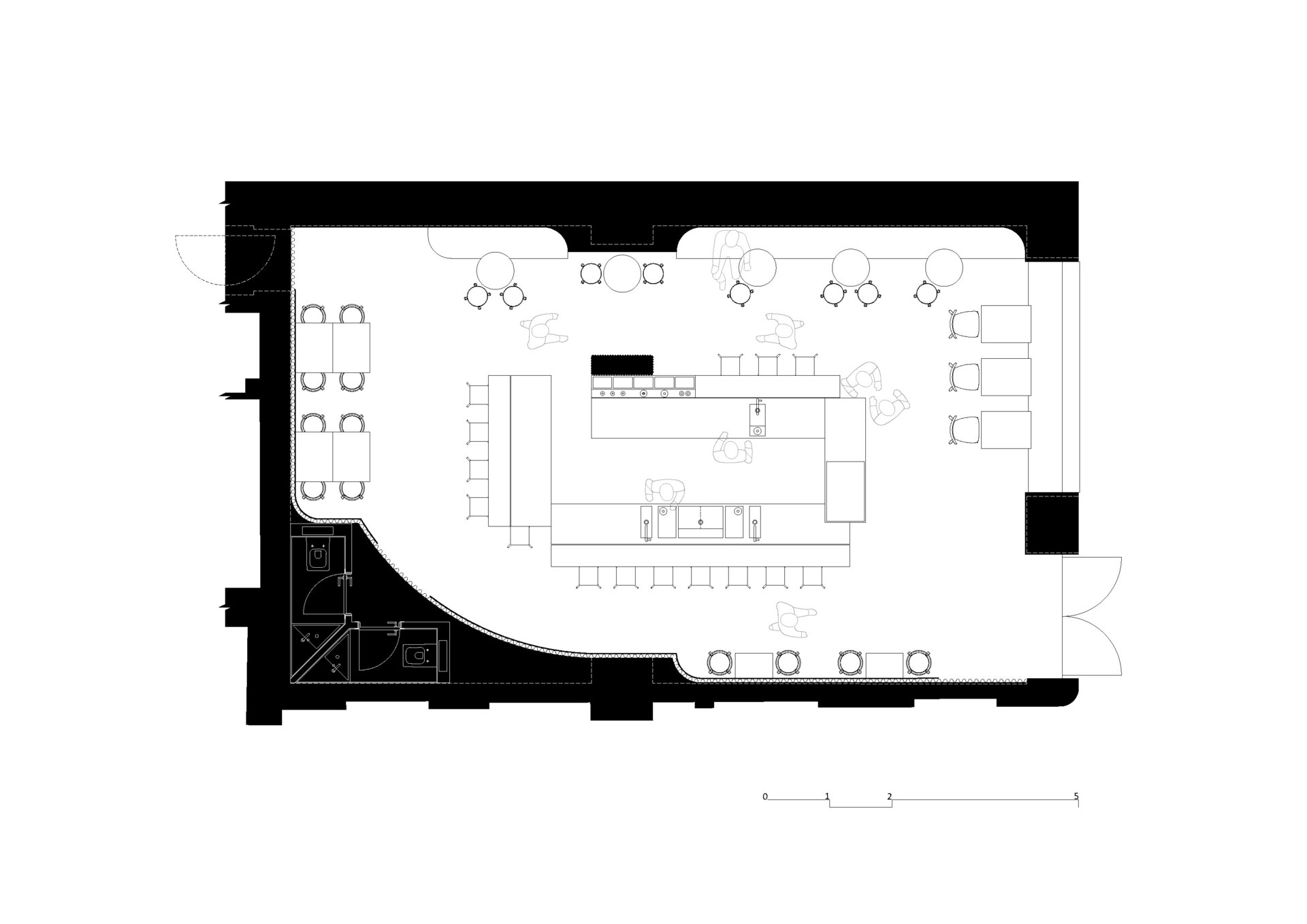 Spațiul este definit de barul de tip central care, prin amplasarea sa, ordonează circulațiile. Încăperea inițială este remodelată pentru a compartimenta două grupuri sanitare și a reda spațiului centralitatea. Un perete-paravan de-a lungul intrării maschează unul dintre stâlpii de consolidare dar și “decupează” spațiul băilor. Stâlpul de consolidare al peretelui opus este “dizolvat” prin integrarea într-o nisă cu mobilier fix. Aceste gesturi oferă posibilitatea de a acomoda 45 de locuri de ședere iar diversitatea acestora permite experimentarea spațiului din ipostaze diferite: la bar sau în nișa peretelui, pe pervazul ferestrei sau la masa înaltă din spate, la tejgheaua din vecinătatea intrării sau pe bancheta din spate.