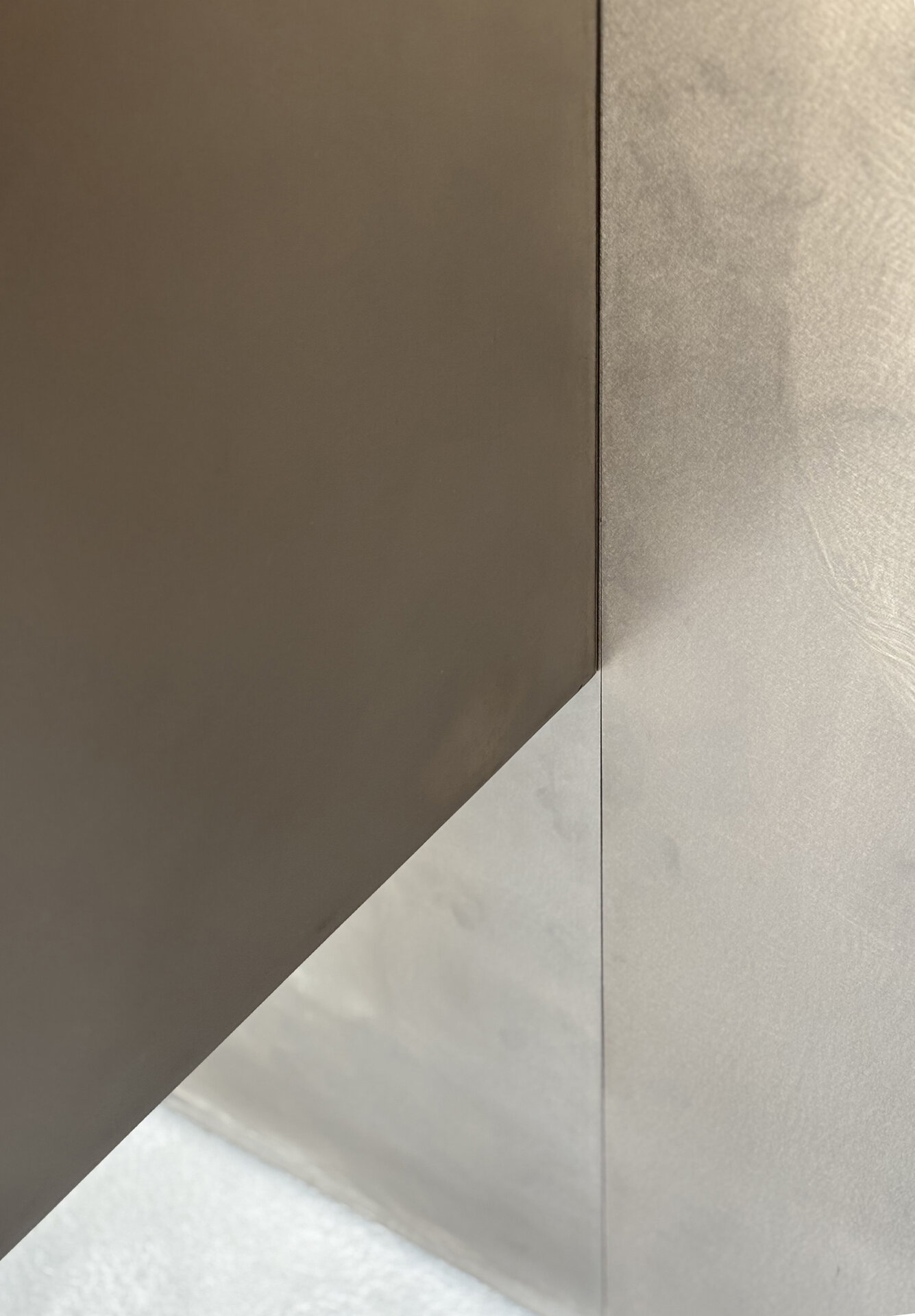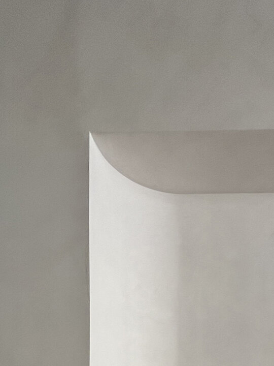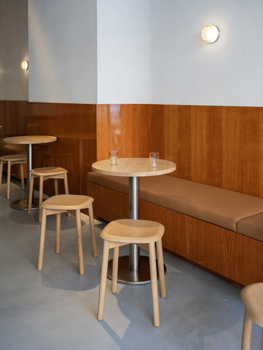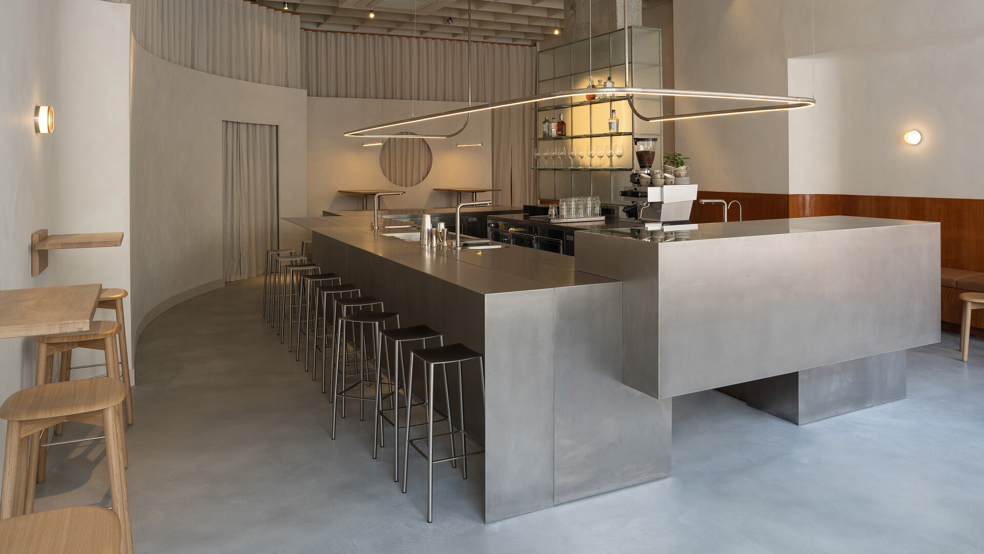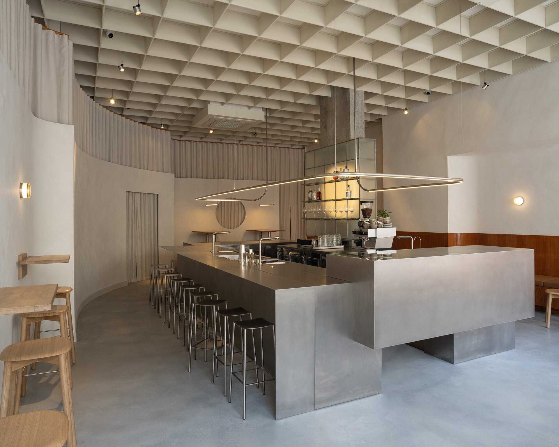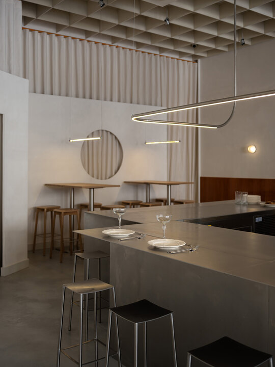 Paleta de materiale și texturi se bazează pe tensiunea dintre modest și rafinat. Învelișuri moi și tari dispuse într-o combinație de elemente clasice, minimaliste și industriale: barul monolitic din inox periat - rece la atingere dar capabil să reflecte luminile serii; furnirul de stejar – băițuit și finisat lucios, aduce căldura tonurilor clasice; tencuiala minerală - aplicată manual în tonuri de sidef, difuzează lumina pe pereții curbi, conferind fluiditate încăperii; pardoseala de microciment - creează un fundal neutru și continuu; draperii de pânză – cu falduri sinuoase, redau delicatețea eleganței atemporale în timp ce tavanul casetat din lamele rigide de feltru – conferă ritm și rotunjește întregul.