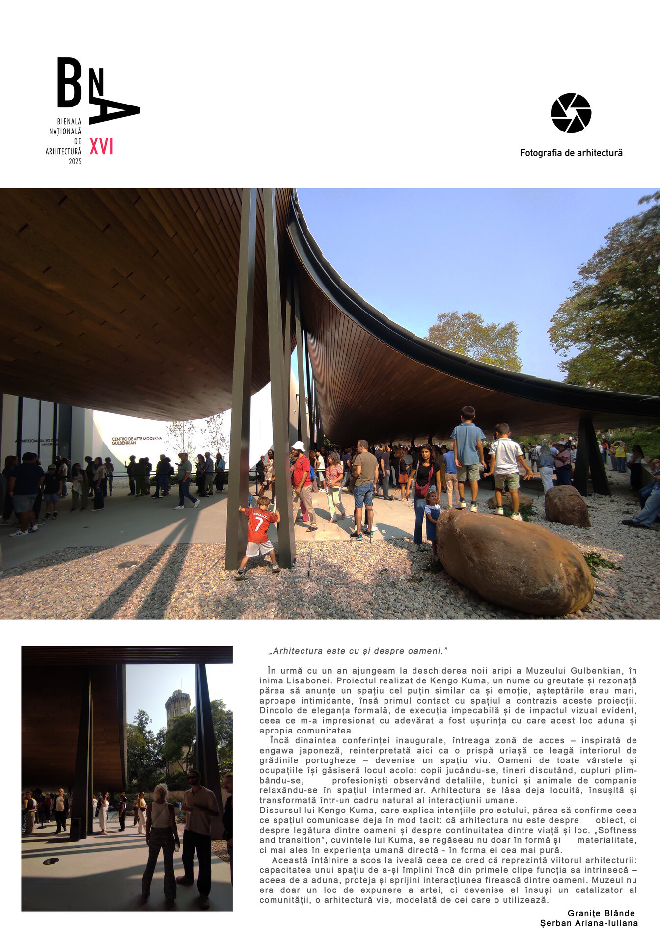 În urmă cu un an ajungeam la deschiderea noii aripi a Muzeului Gulbenkian, în inima Lisabonei. Proiectul realizat de Kengo Kuma, un nume cu greutate și rezonață părea să anunțe un spațiu cel puțin similar ca și emoție, așteptările erau mari, aproape intimidante, însă primul contact cu spațiul a contrazis aceste proiecții. Dincolo de eleganța formală, de execuția impecabilă și de impactul vizual evident, ceea ce m-a impresionat cu adevărat a fost ușurința cu care acest loc aduna și apropia comunitatea.