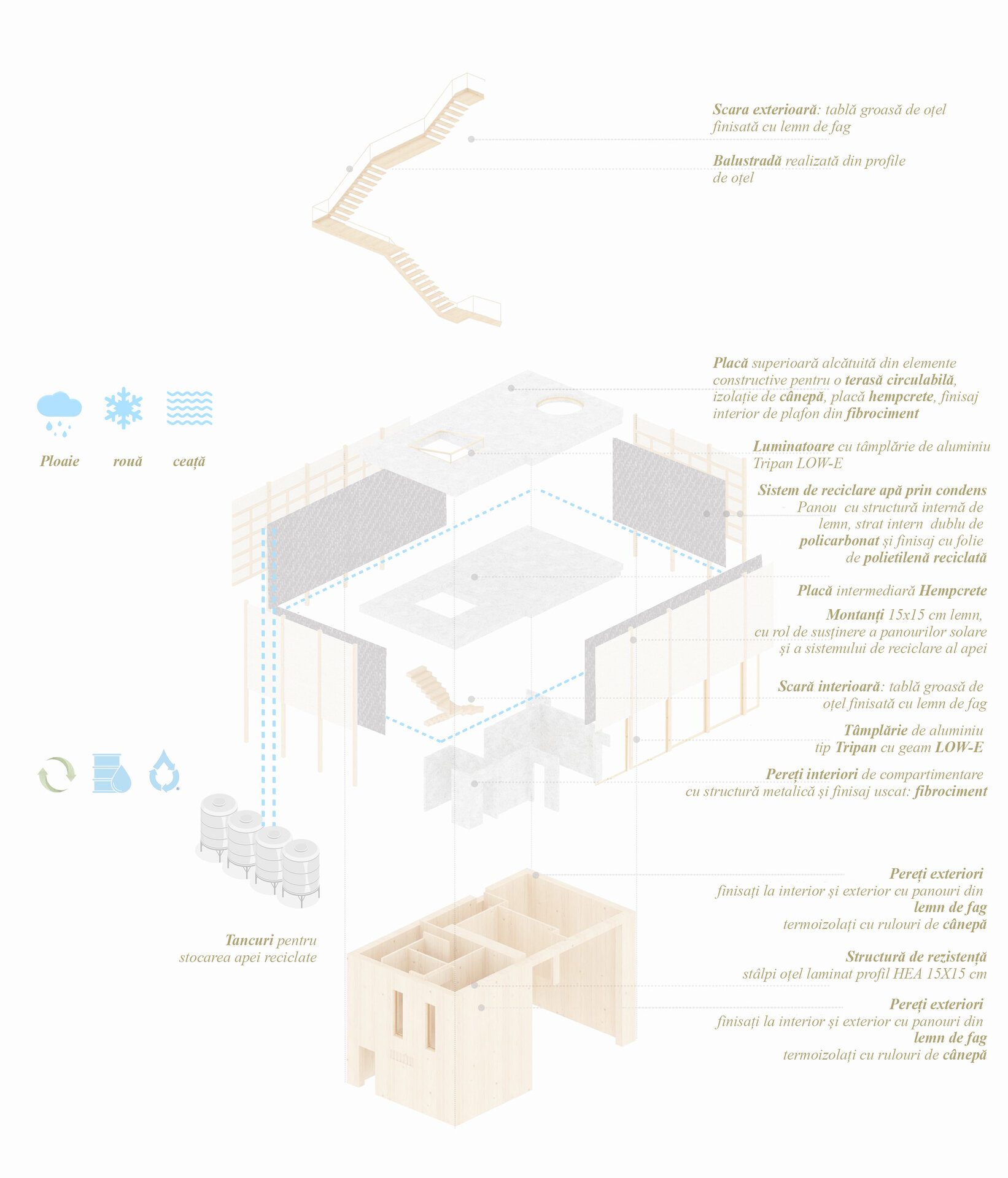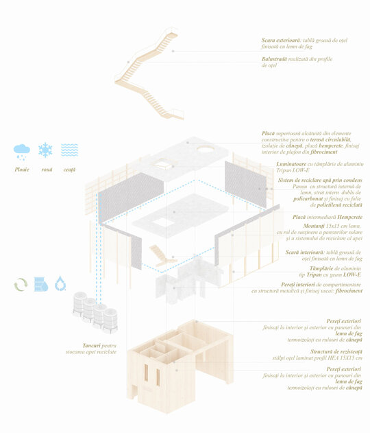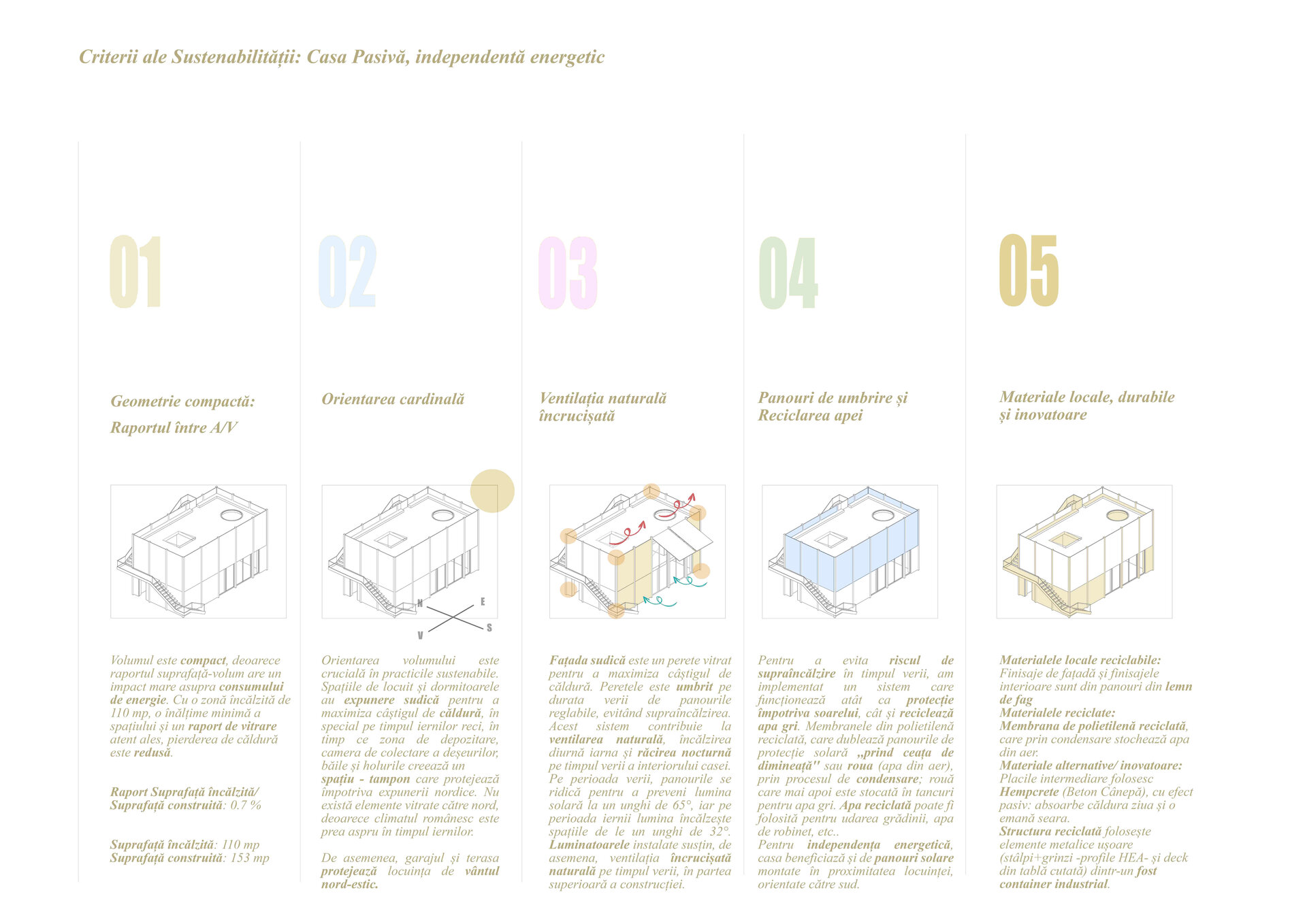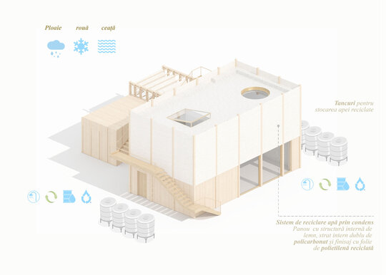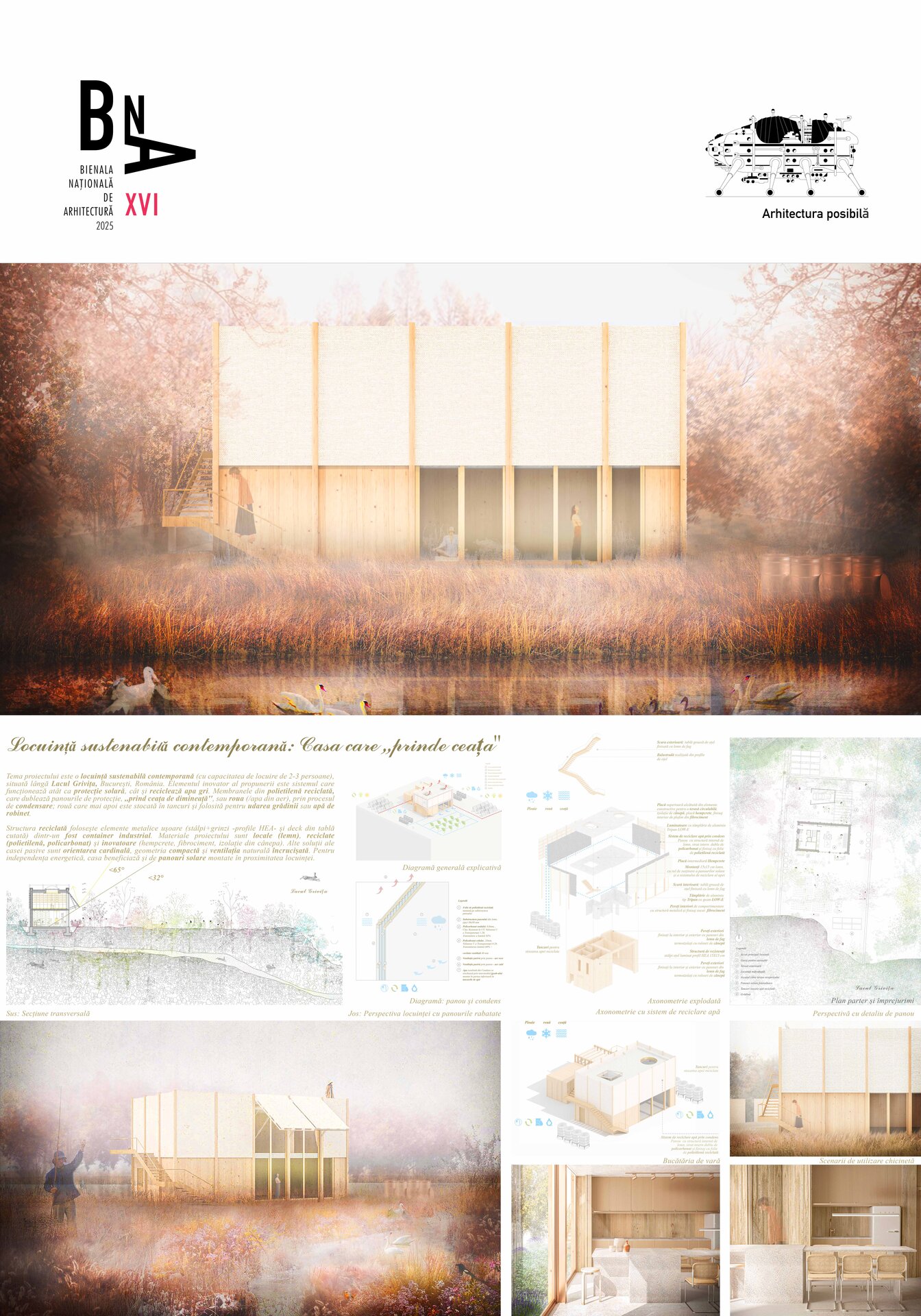 Tema proiectului este o locuință sustenabilă contemporană (cu capacitatea de locuire de 2-3 persoane), situată lângă Lacul Grivița, București, România. Elementul inovator al propunerii este sistemul care funcționează atât ca protecție solară, cât și reciclează apa gri. Membranele din polietilenă reciclată, care dublează panourile de protecție, ,,prind ceața de dimineață'', sau roua (/apa din aer), prin procesul de condensare; rouă care mai apoi este stocată în tancuri și folosită pentru udarea grădinii sau apa de robinet. Structura reciclată folosește elemente metalice ușoare (stâlpi+grinzi -profile HEA- și deck din tablă cutată) dintr-un fost container industrial. Materiale proiectului sunt locale (lemn), reciclate (polietilenă, policarbonat) și inovatoare (hempcrete, fibrociment, izolație din cânepa). Alte soluții ale casei pasive sunt orientarea cardinală, geometria compactă și ventilația naturală încrucișată. Pentru independența energetică, casa beneficiază și de panouri solare montate în proximitatea locuinței, orientate către sud. Principiile și ideile pot fi aplicate într-o miriadă de proiecte, fiind versatile și durabile.
