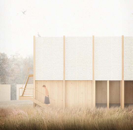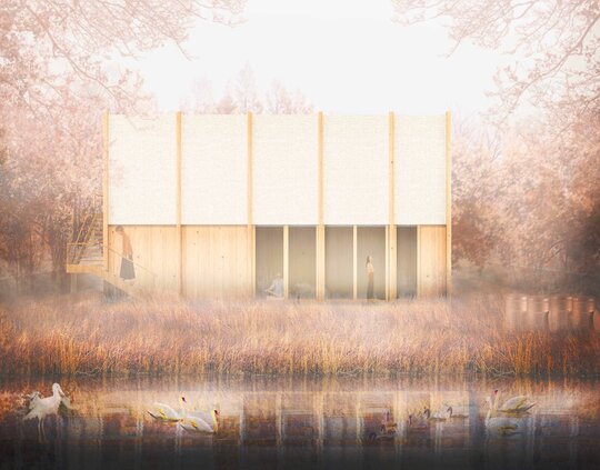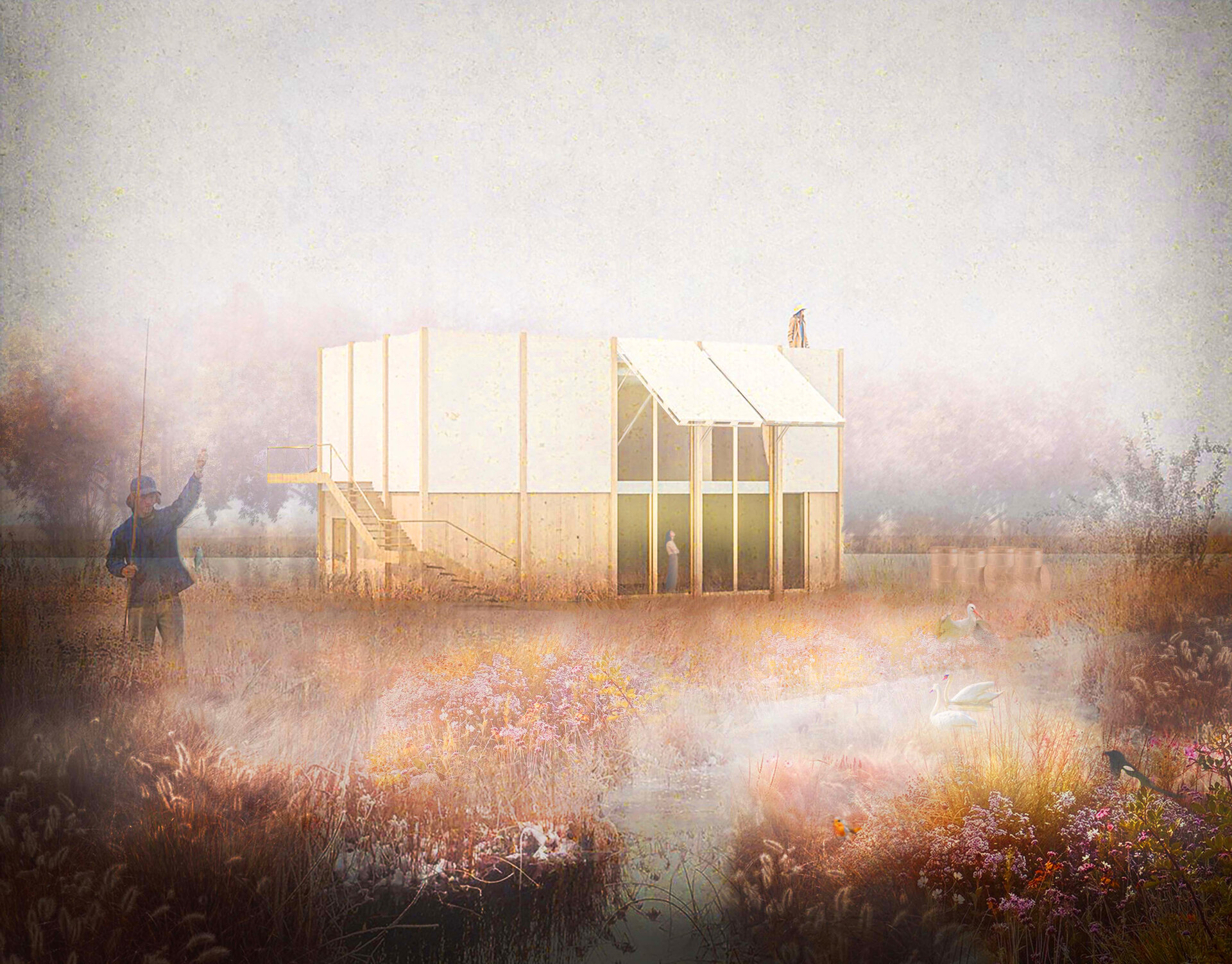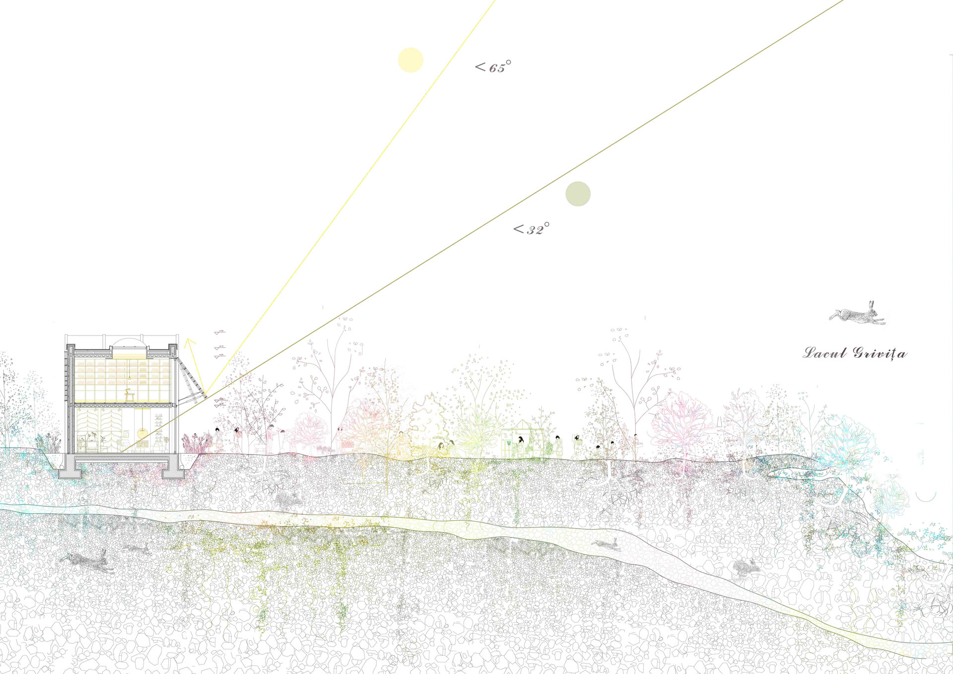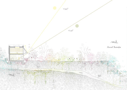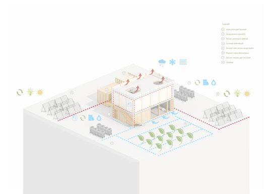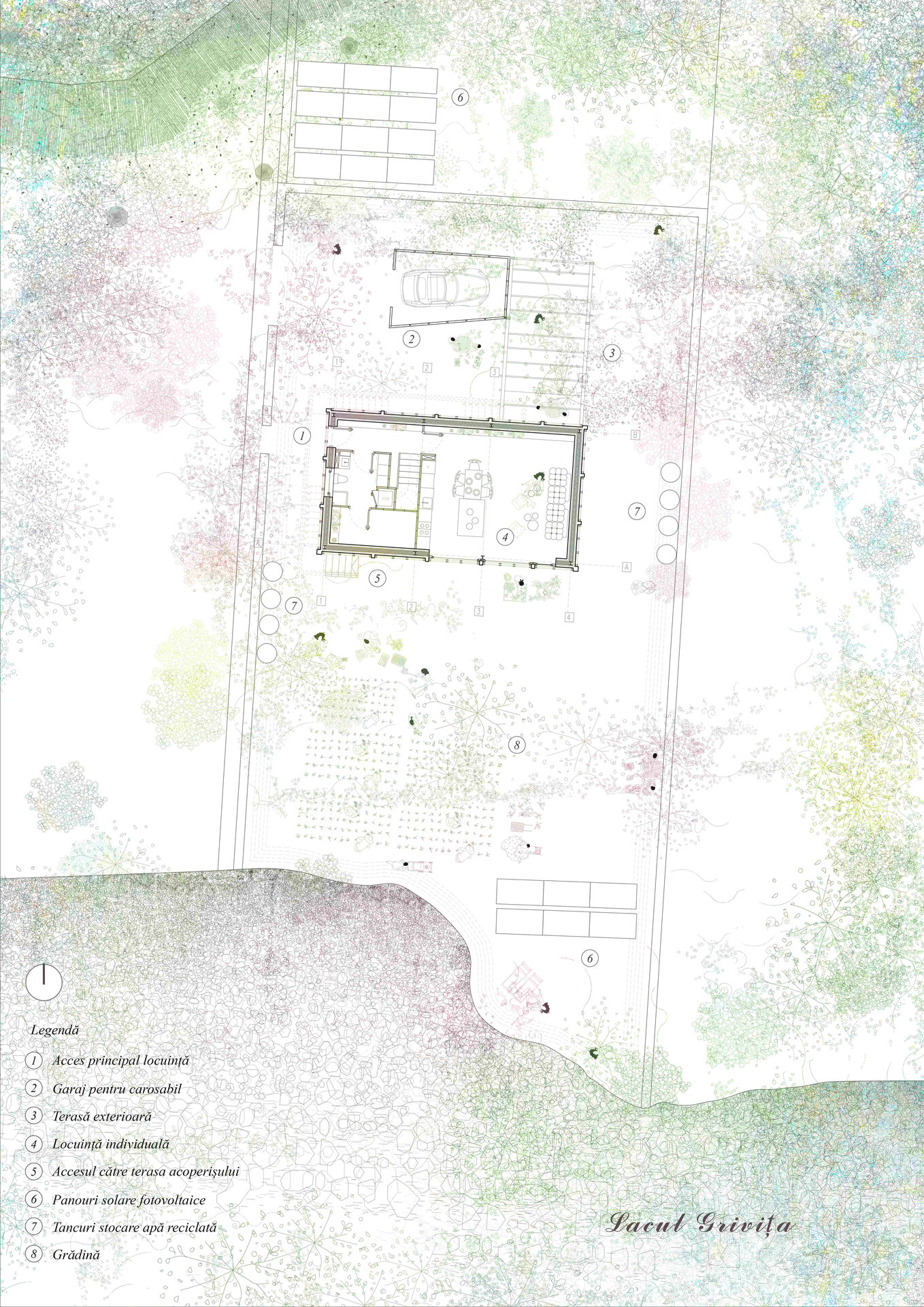 Tema proiectului este o locuință sustenabilă contemporană (cu capacitatea de locuire de 2-3 persoane), situată lângă Lacul Grivița, București, România. Elementul inovator al propunerii este sistemul care funcționează atât ca protecție solară, cât și reciclează apa gri. Membranele din polietilenă reciclată, care dublează panourile de protecție, ,,prind ceața de dimineață'', sau roua (/apa din aer), prin procesul de condensare; rouă care mai apoi este stocată în tancuri și folosită pentru udarea grădinii sau apa de robinet. Structura reciclată folosește elemente metalice ușoare (stâlpi+grinzi -profile HEA- și deck din tablă cutată) dintr-un fost container industrial. Materiale proiectului sunt locale (lemn), reciclate (polietilenă, policarbonat) și inovatoare (hempcrete, fibrociment, izolație din cânepa). Alte soluții ale casei pasive sunt orientarea cardinală, geometria compactă și ventilația naturală încrucișată. Pentru independența energetică, casa beneficiază și de panouri solare montate în proximitatea locuinței, orientate către sud. Principiile și ideile pot fi aplicate într-o miriadă de proiecte, fiind versatile și durabile.