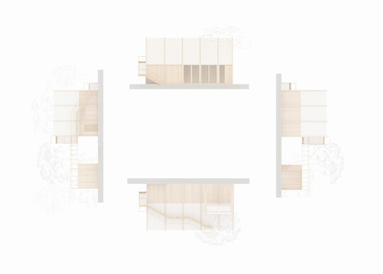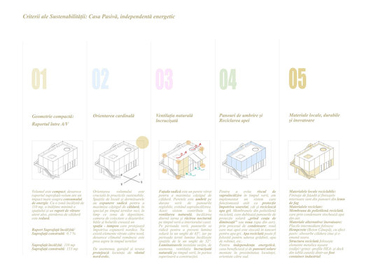 Volumul este compact, deoarece raportul suprafață-volum are un impact mare asupra consumului de energie. Cu o zonă încălzită de 110 mp, o înălțime minimă a spațiului și un raport de vitrare atent ales, pierderea de căldură este redusă. Raport Suprafață încălzită/ Suprafață construită: 0.7 % Suprafață încălzită: 110 mp Suprafață construită: 153 mp.