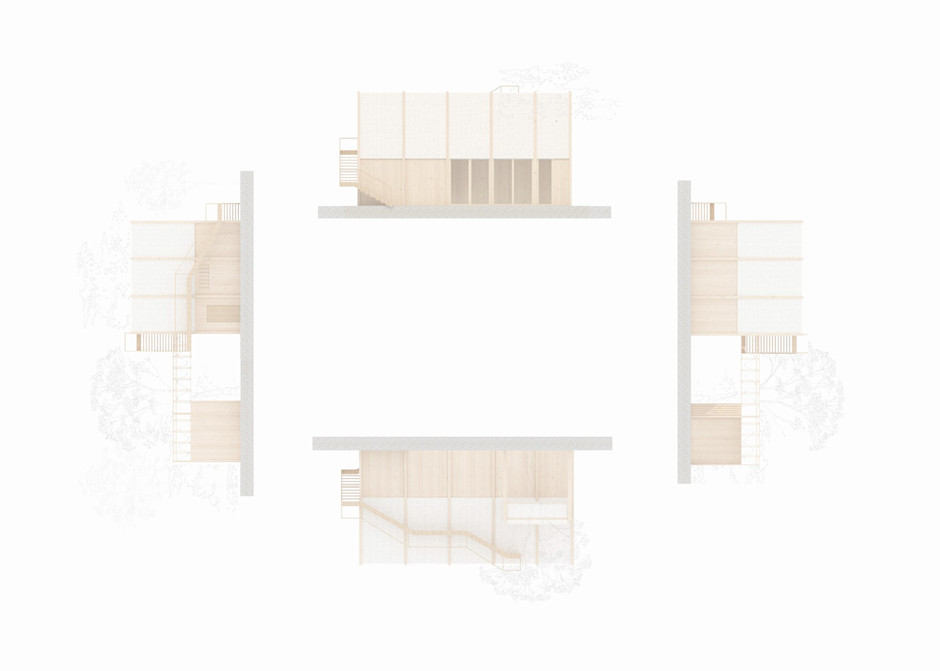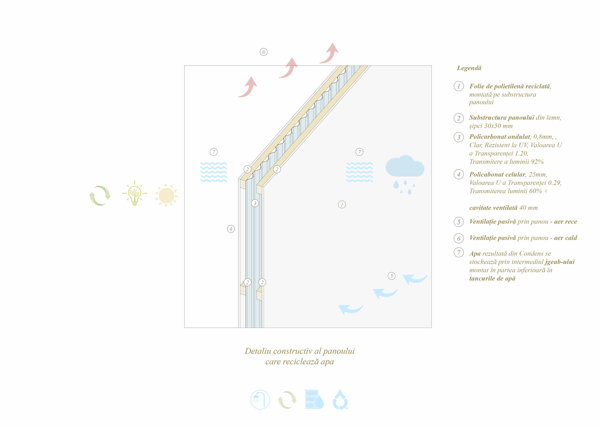 Pentru a evita riscul de supraîncălzire în timpul verii, am implementat un sistem care funcționează atât că protecție împotriva soarelui, cât și reciclează apa gri. Membranele din polietilenă reciclată, care dublează panourile de protecție solară ,,prind ceața de dimineață'' sau roua (/apa din aer), prin procesul de condensare; rouă care mai apoi este stocată în tancuri pentru apa gri. Apa reciclată poate fi folosită pentru udarea grădinii, apa de robinet, etc.