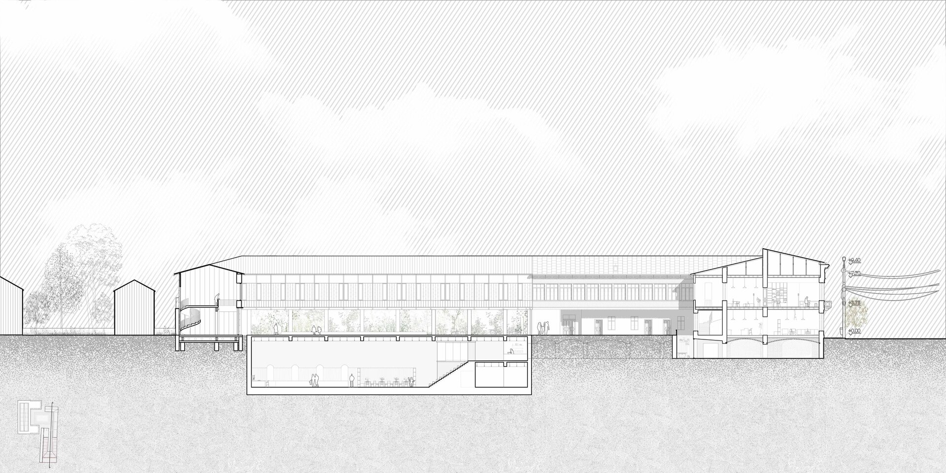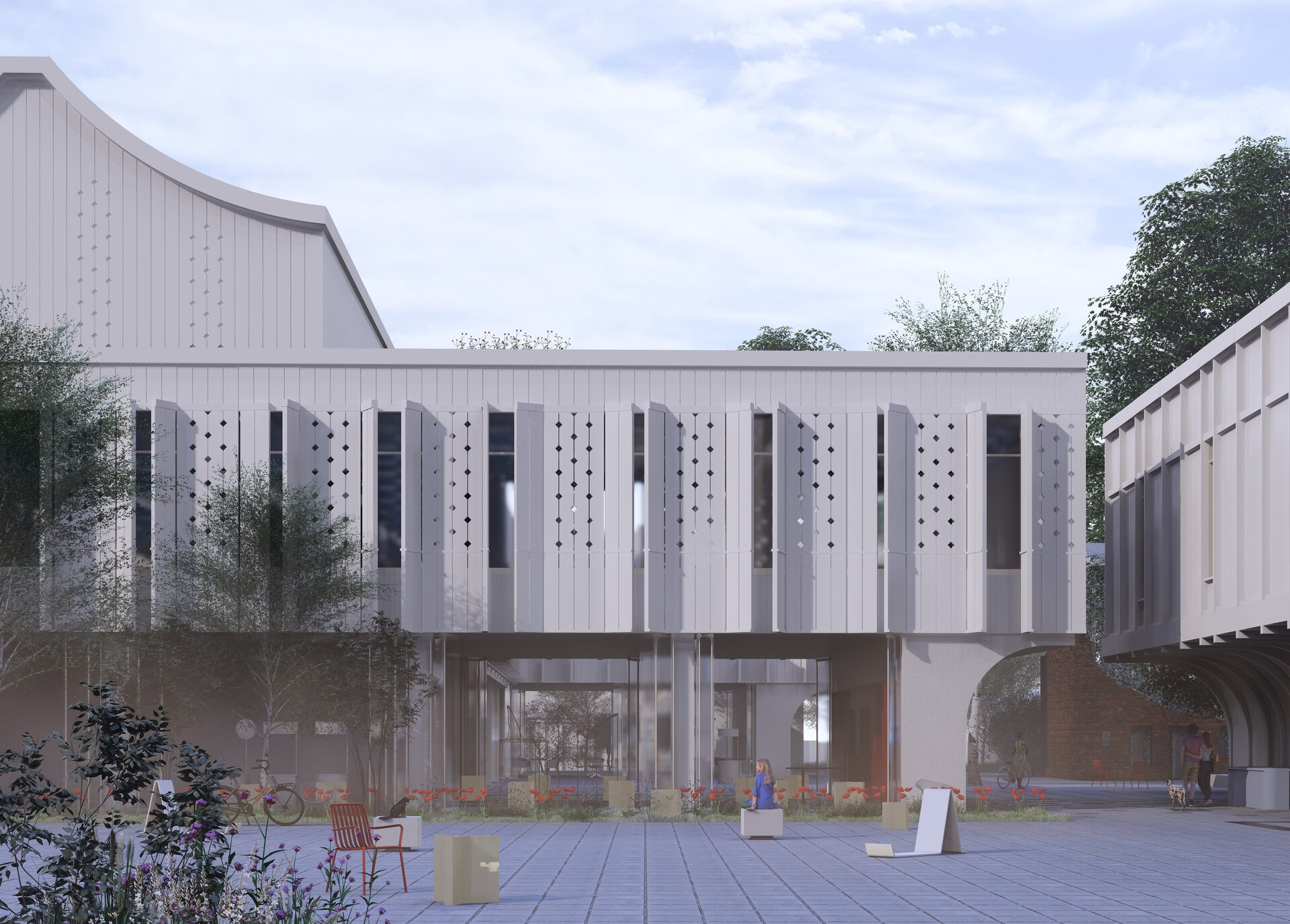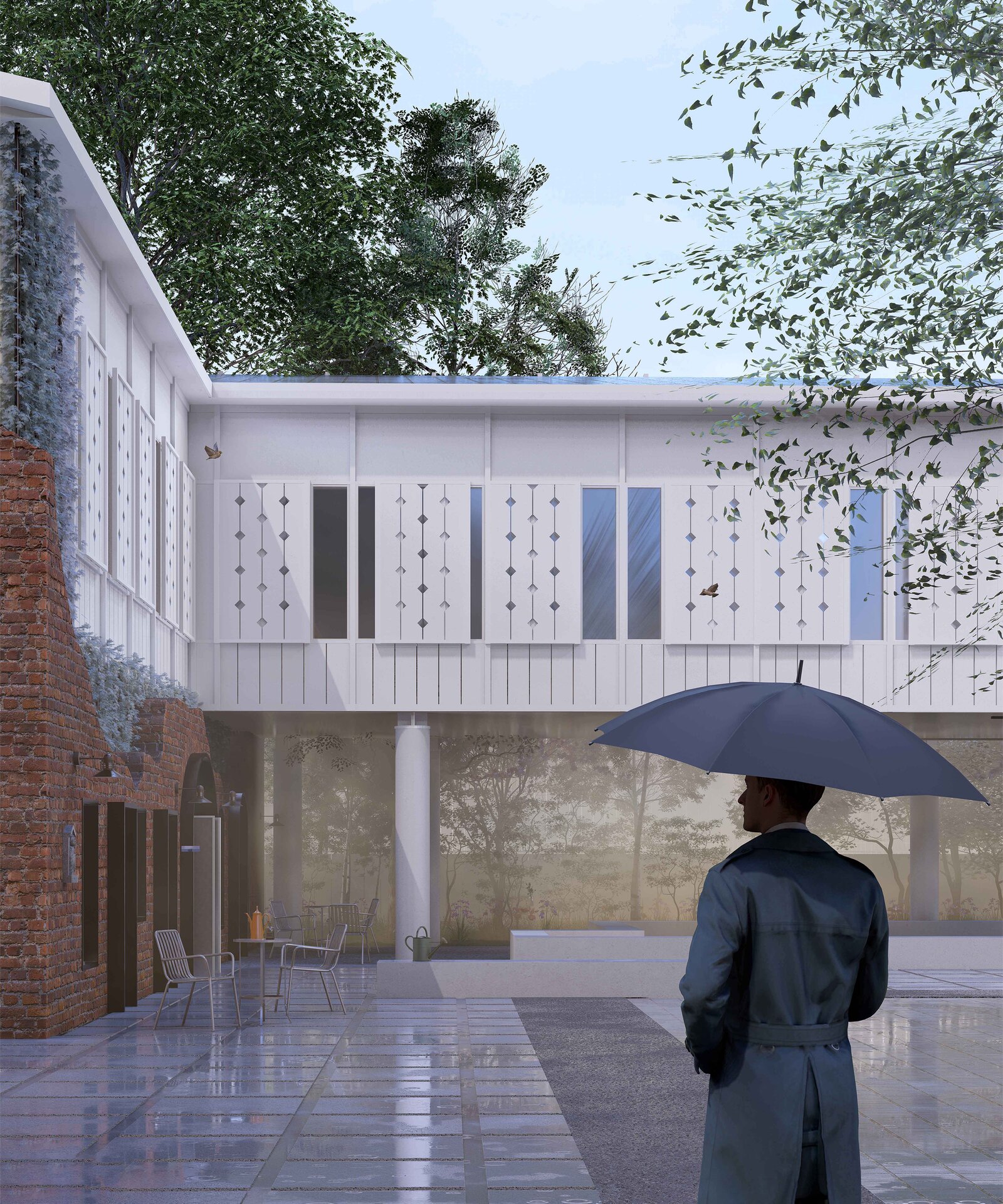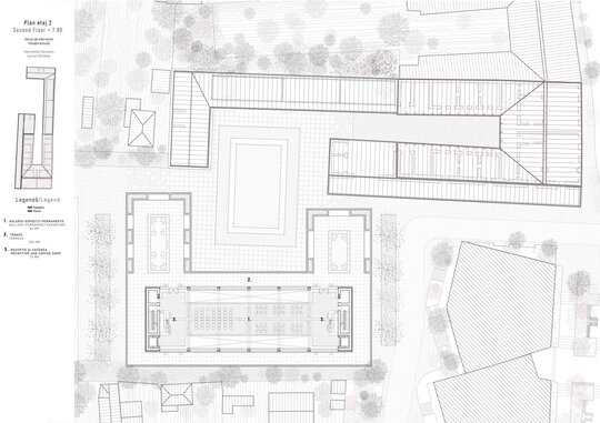 Punctele de pătrundere în incintă sunt tratate ca zone de tensiune spațială, amintind de accesul filtrat și controlat al caravanseraiului, care se deschide apoi într-o curte amplă, calmată, ce reinterpretează în cheie contemporană tipologia locală a casei cu gang și grădină interioară. Această curte devine spațiu de tranziție și mediere – între public și privat, între orașul dens și interiorul protejat.