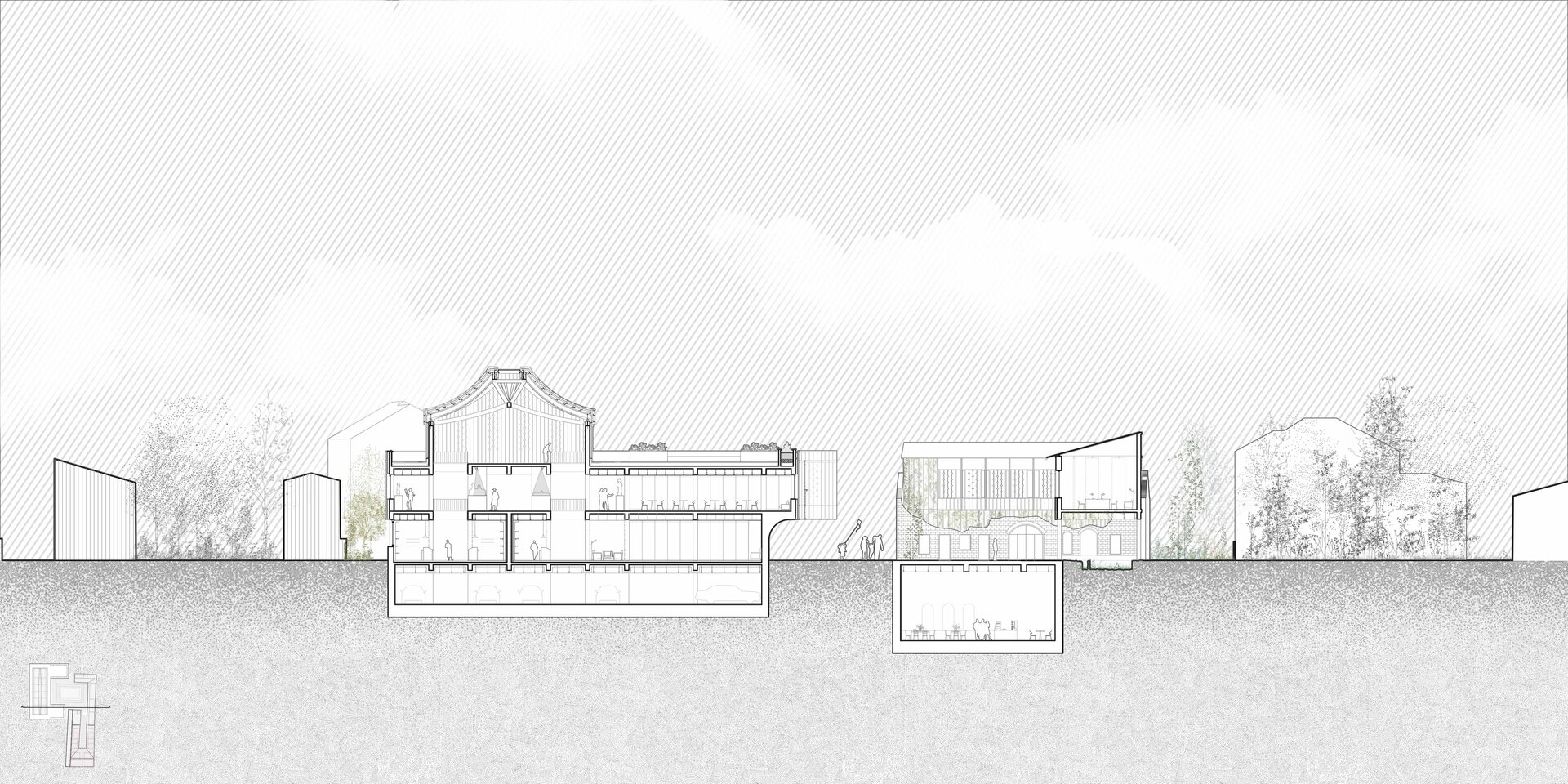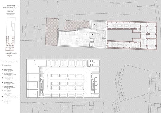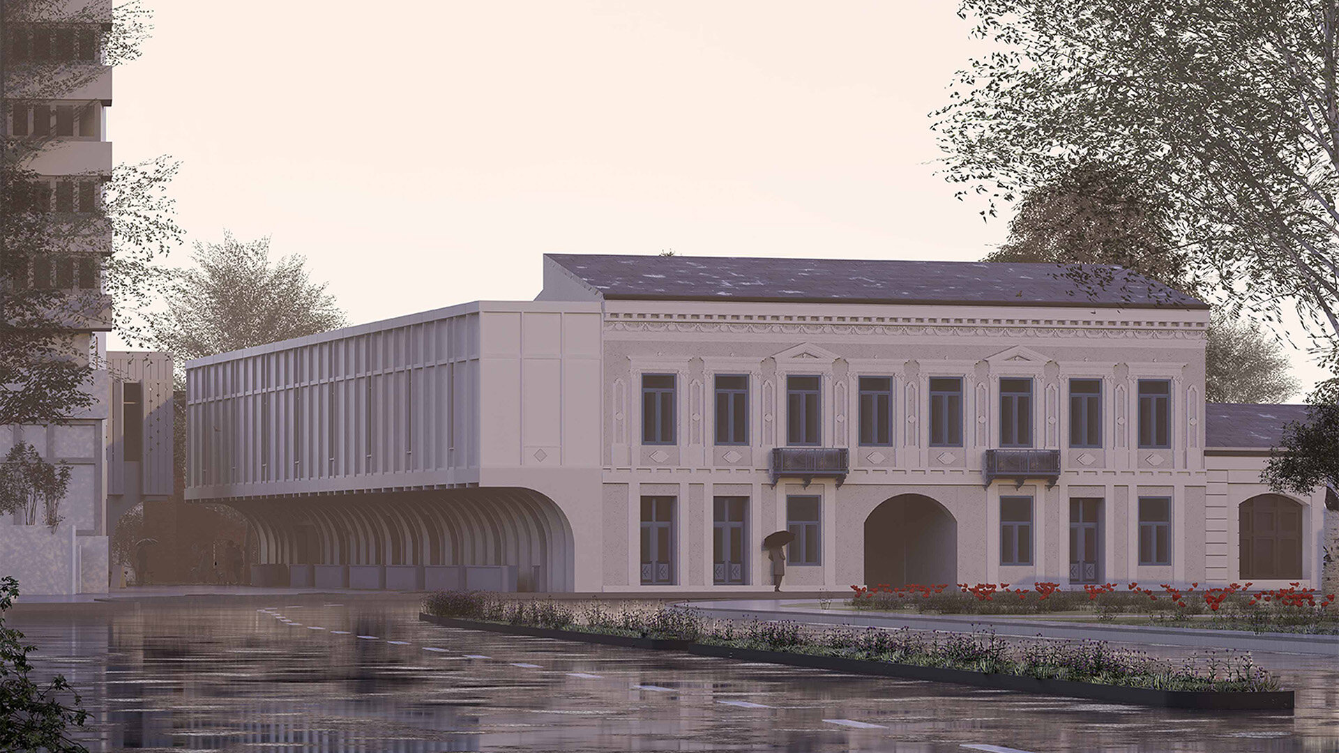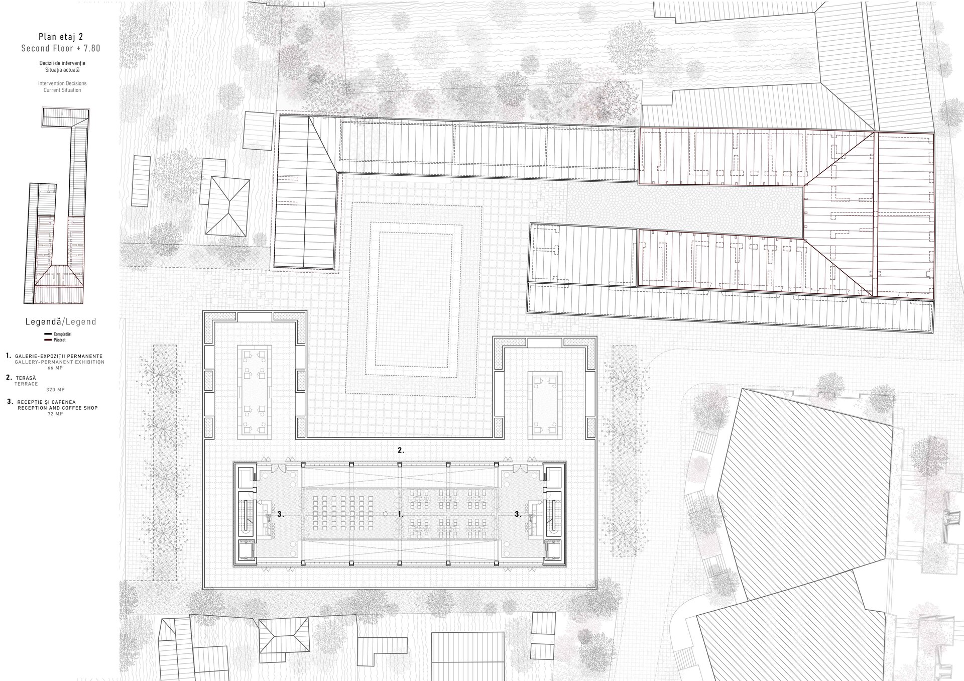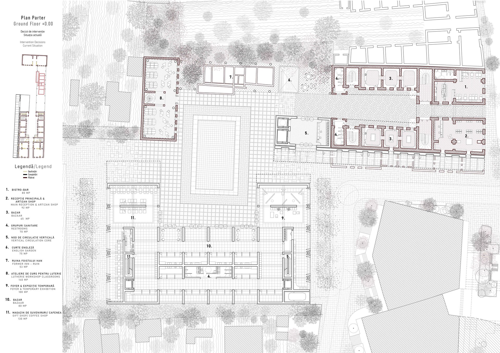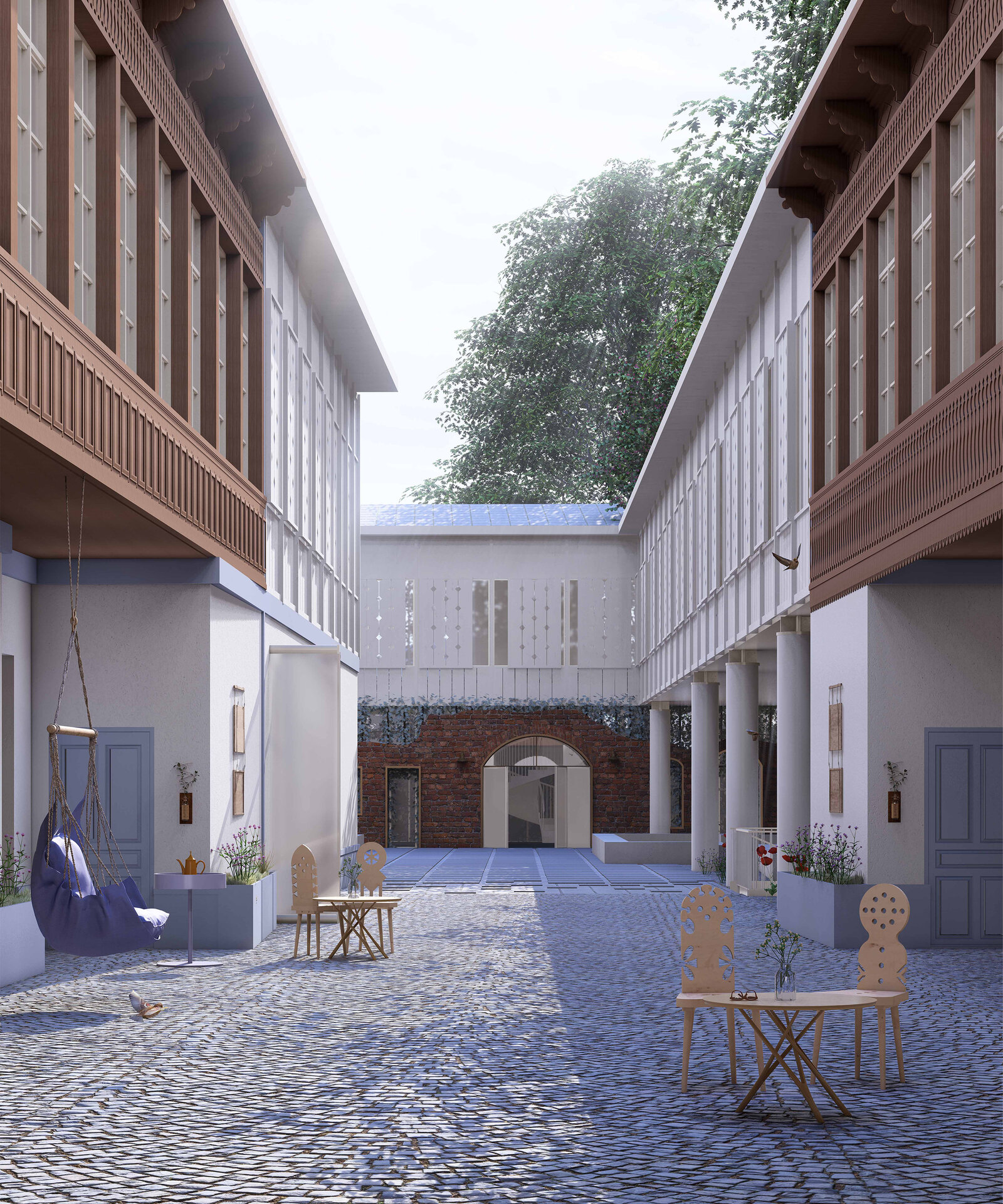 Relația dintre cele două parcele devine fundamentul proiectului. Prin glisarea curților generate de preexistent și nou, se definește o incintă comună, gândită ca nucleu activ al ansamblului. Accesul principal, de pe strada Sfânta Vineri, este marcat de un portic comercial reinterpretat în logica rasteh-ului oriental – o axă pietonală acoperită, amplasată pe amprenta anexelor demolate, care conduce gradual către curtea interioară.
