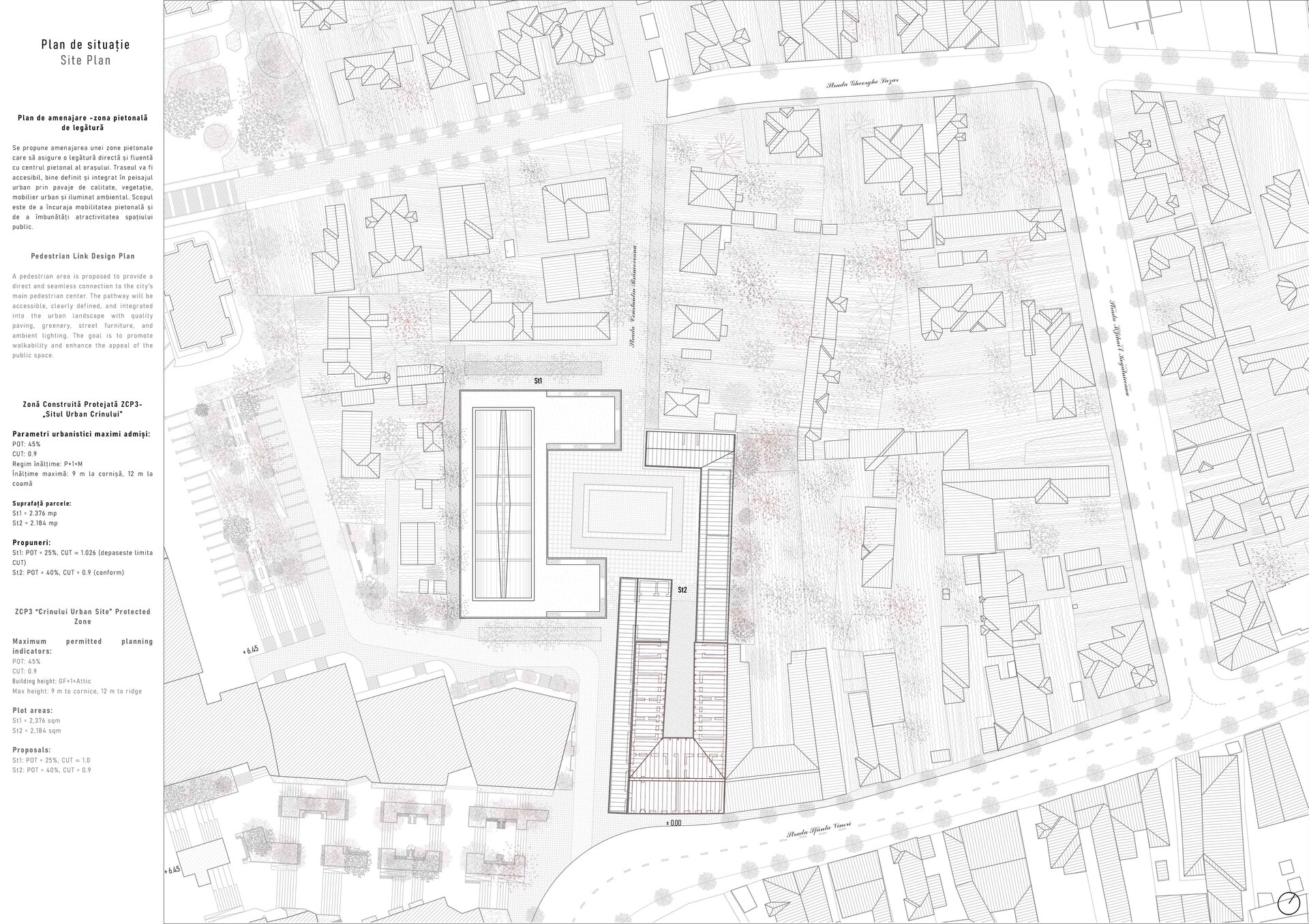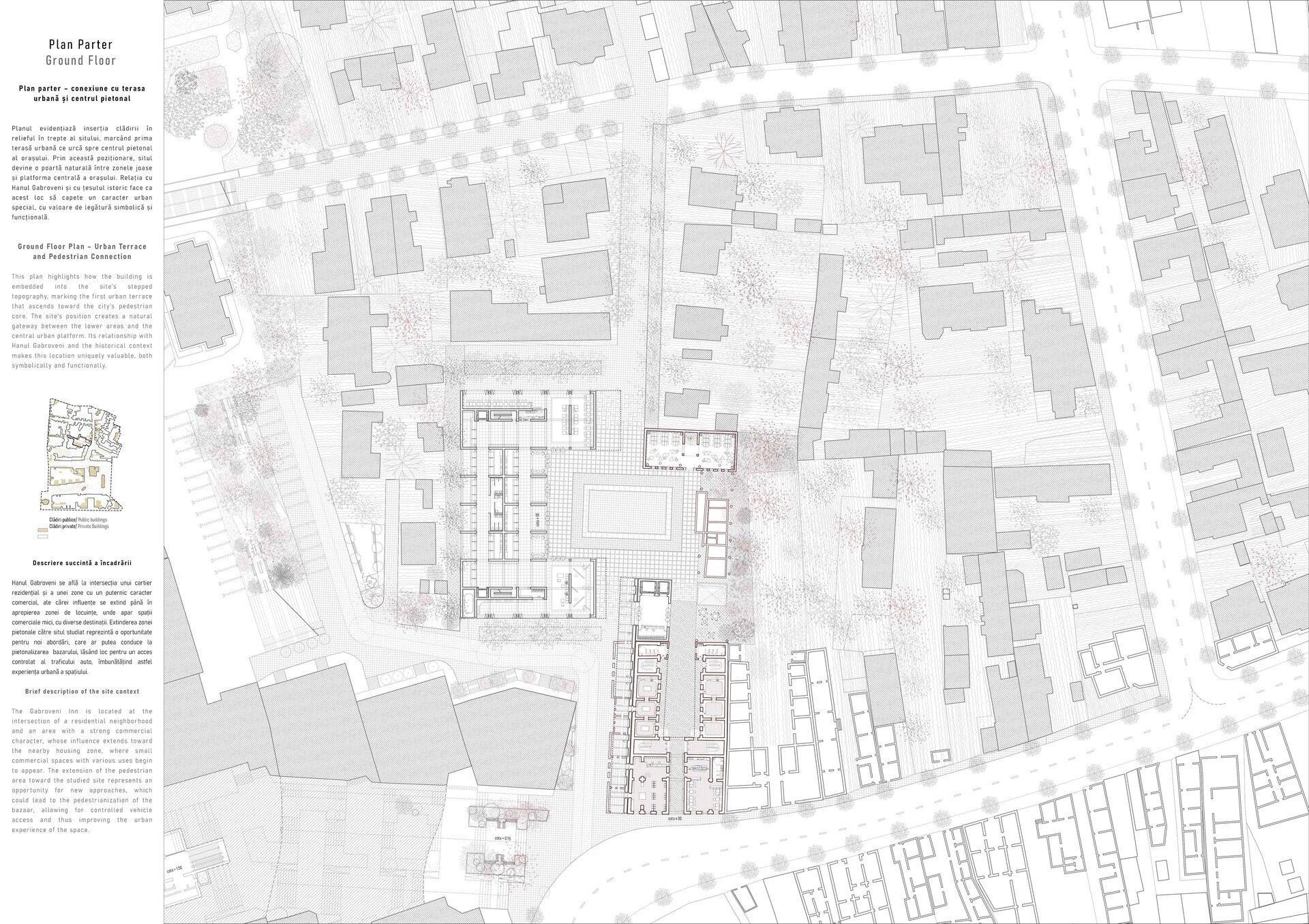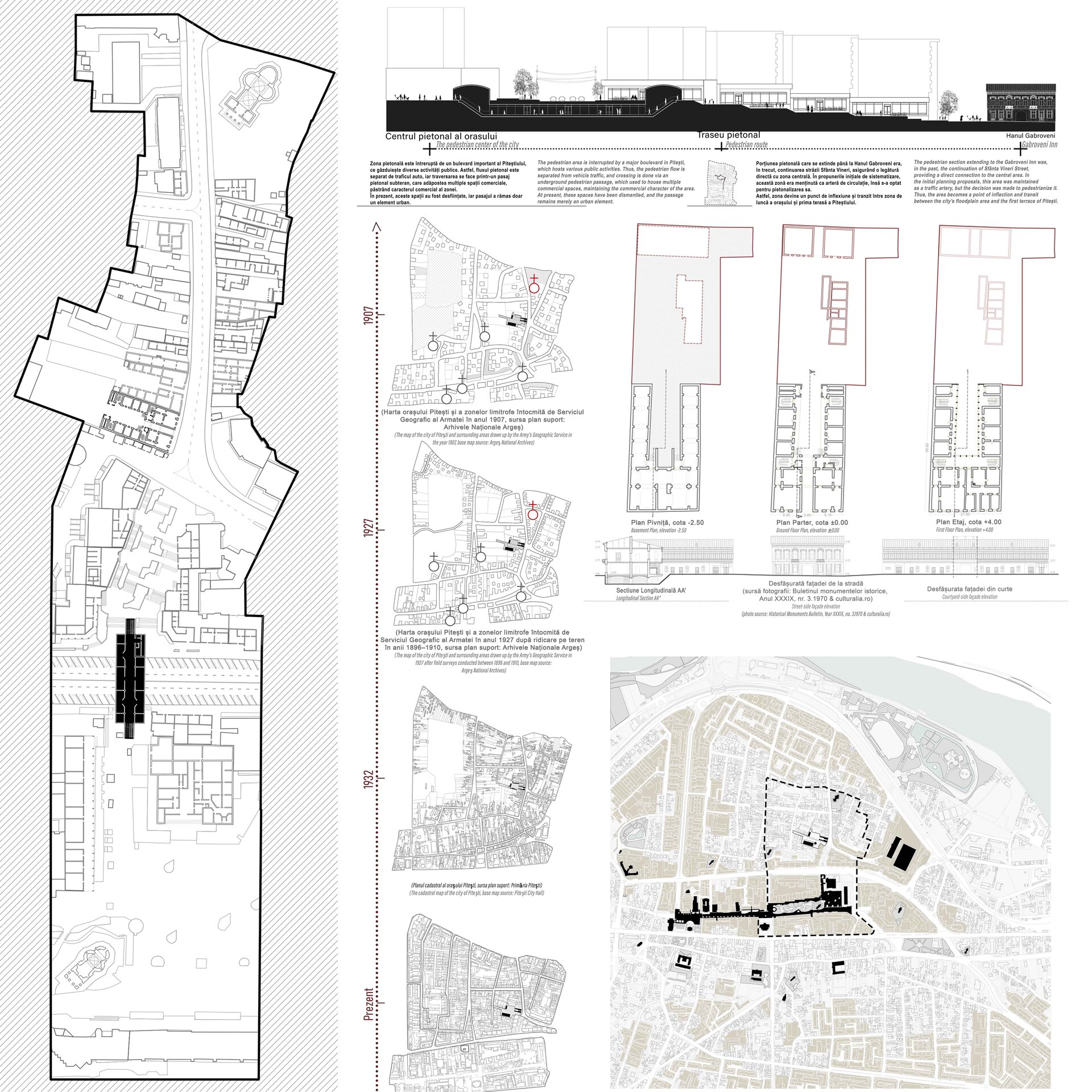 Tema urmărește conversia și extinderea funcțională a Hanului Gabroveni, monument istoric de clasă B și singurul han păstrat în Pitești. Intervenția propune valorificarea a două parcele – cea a hanului și cea a fostului bazar de vizavi – în scopul articulării unui ansamblu urban coerent, cu potențial de a redeveni reper cultural și social în centrul istoric al orașului.