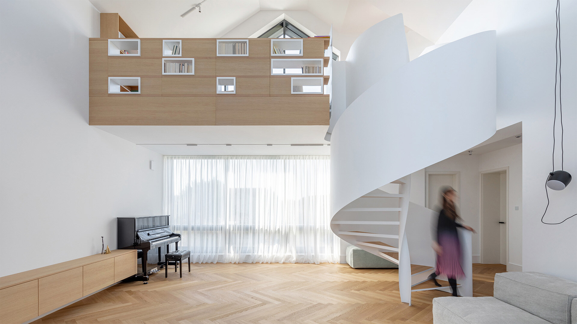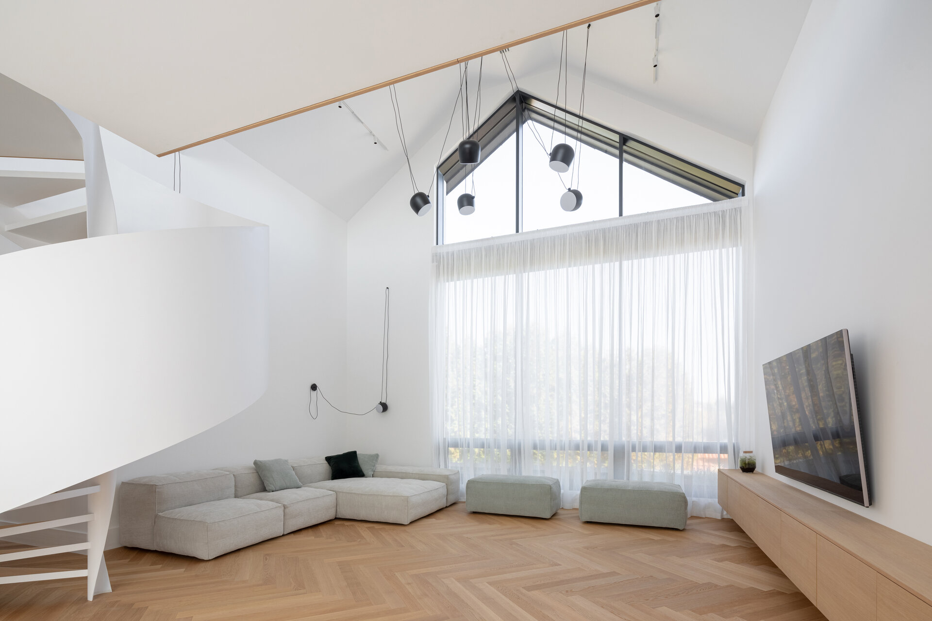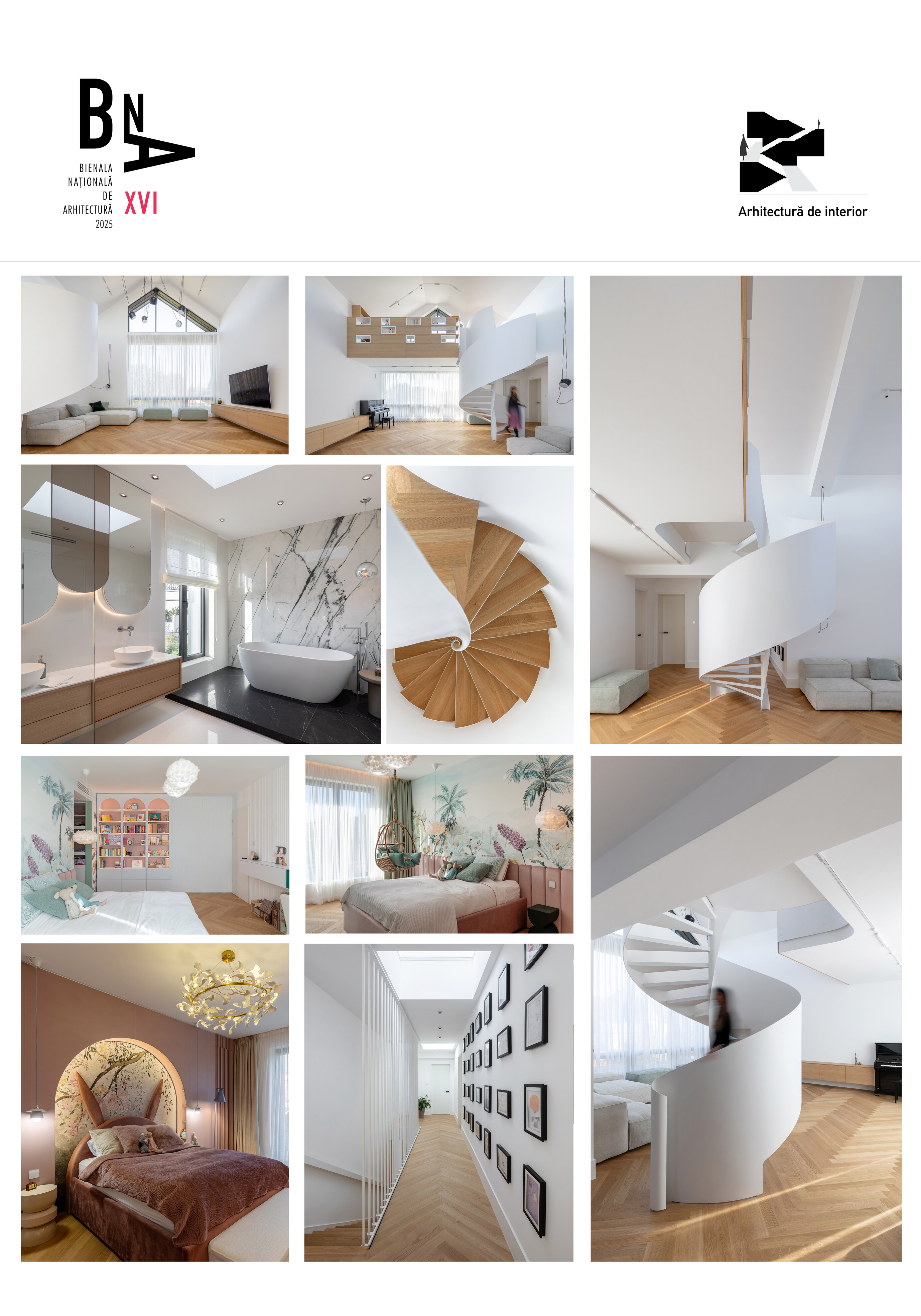Parterul întâmpină rezidenții într-un mediu deschis și primitor, care cuprinde livingul, zona de dining, baia de oaspeți, biroul și holul scării — fiecare definit printr-o selecție rafinată de materiale și finisaje. Etajul reunește două dormitoare pentru copii, fiecare cu dressing și baie proprie, un dormitor matrimonial cu dressing privat și baie en-suite, o baie suplimentară pentru oaspeți și un al doilea living cu o înălțime de 6 metri, conceput ca spațiu intim și primitor. O zonă de lectură pe split-level, accesată printr-o spectaculoasă scară elicoidală, completează experiența, oferind un colț retras și liniștit.