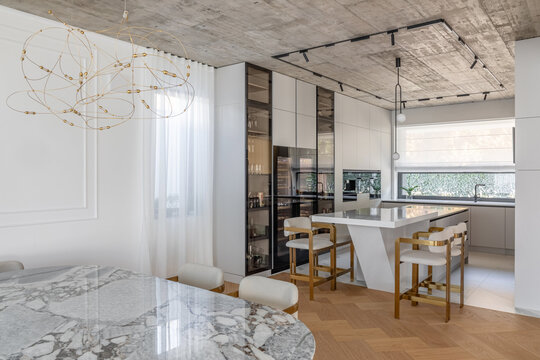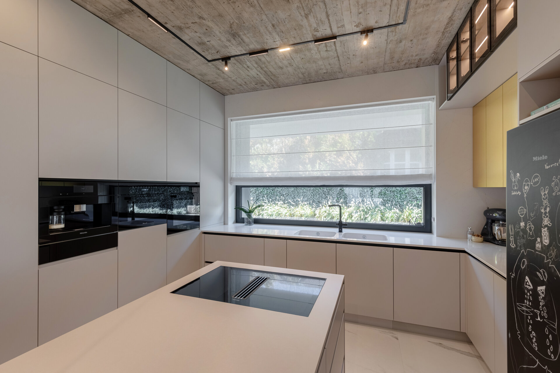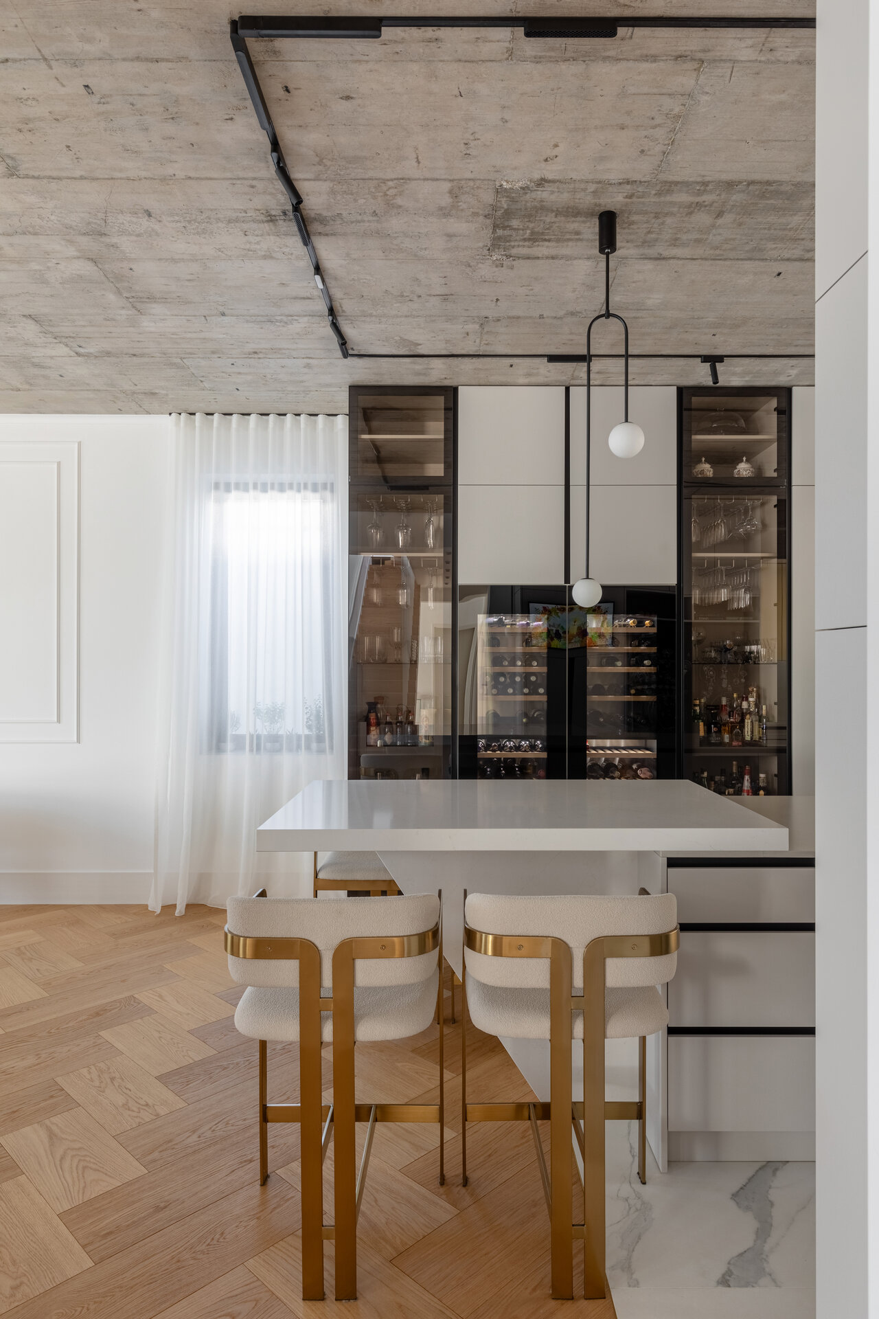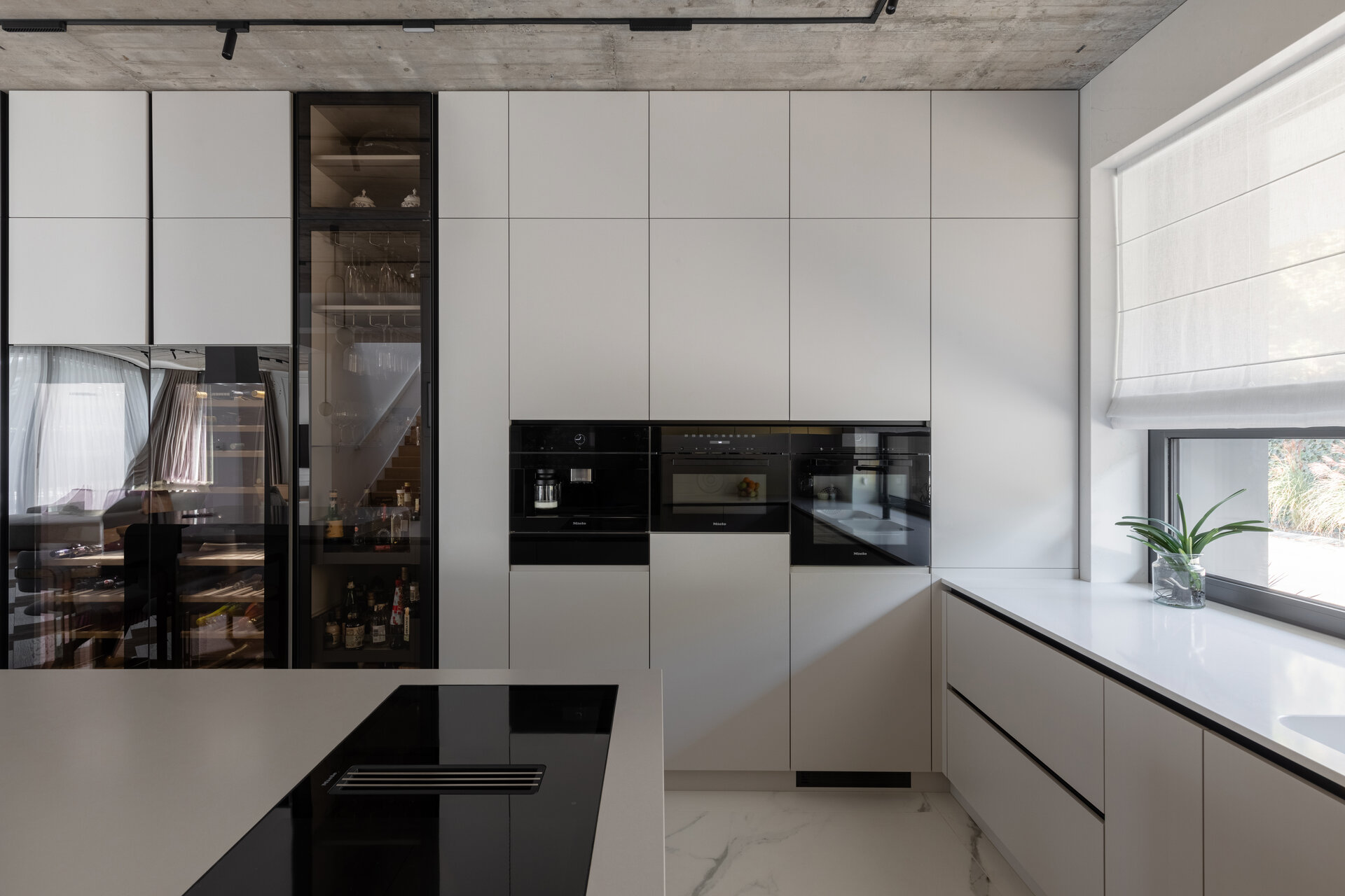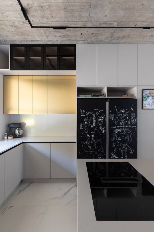 Îmbinând fildeș, negru și auriu, bucătăria emană rafinament. Corpurile suspendate aurii, cu rame bej și fronturi tip „tablă de scris”, vitrina din sticlă gri și insula centrală cu plită și hotă integrate adaugă profunzime și funcționalitate.