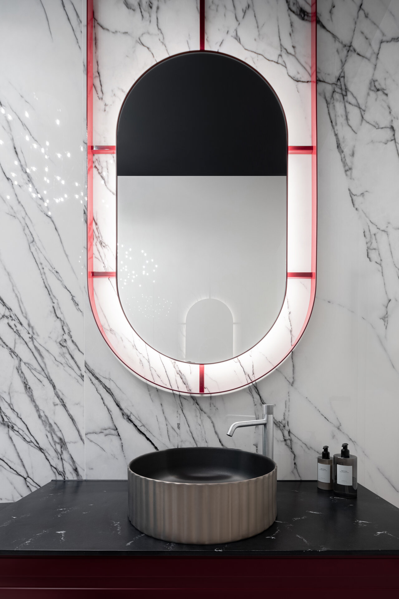 Baia de oaspeți: Contrast puternic între marmură și plafon gri, completat de lavoar burgundy, oglindă ovală și finisaje cromate.