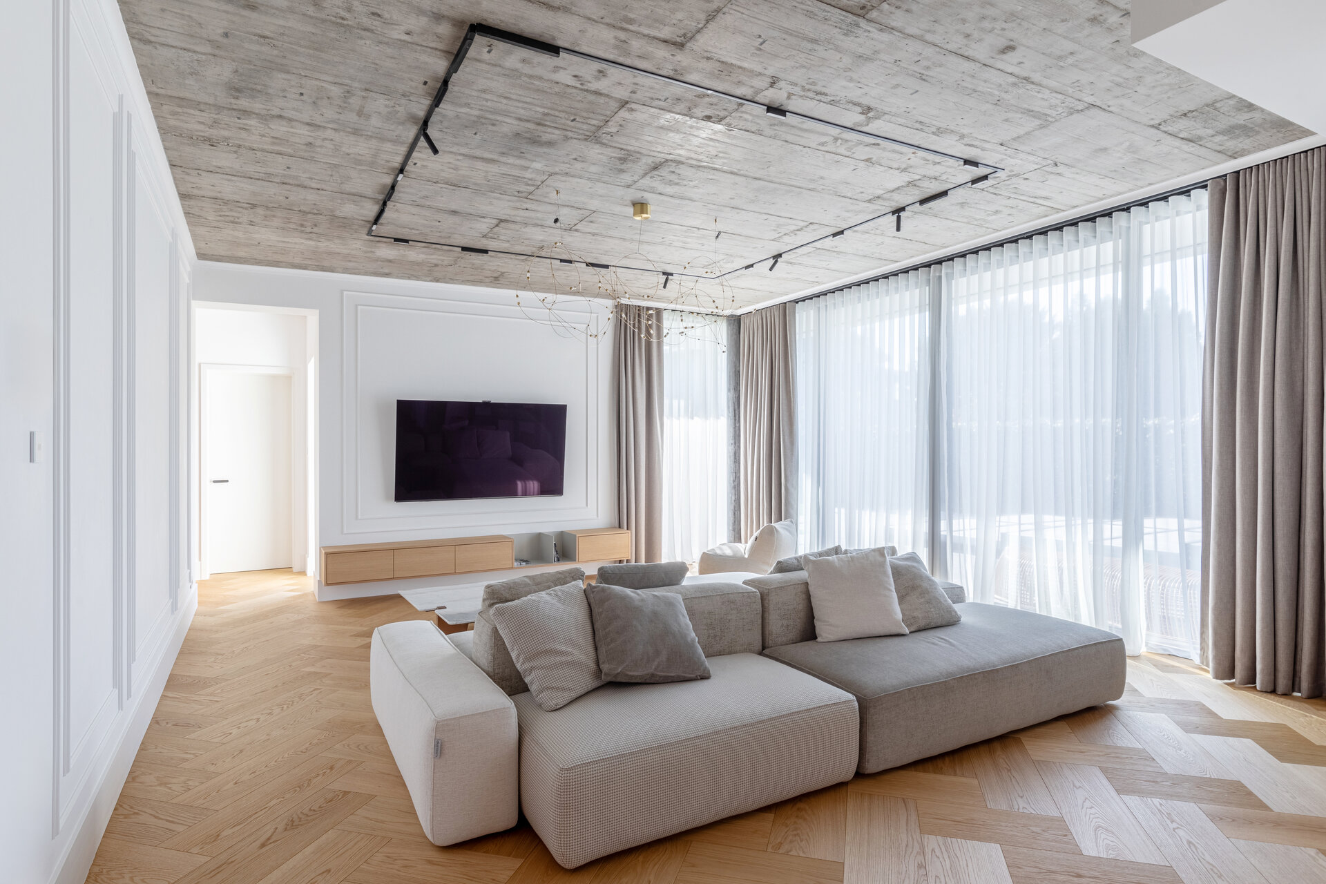 Povestea vizuală a locuinței se construiește printr-o selecție atentă de materiale și nuanțe cu eleganță atemporală: