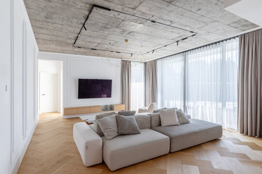 Living: Plafoane cu aspect de ciment, mobilier din lemn natural și o paletă neutră de alb, gri și bej auriu. Canapeaua din fibre naturale, masa cu finisaj marmorat și accente aurii, textilele bouclé și pianul impunător adaugă o notă artistică rafinată.