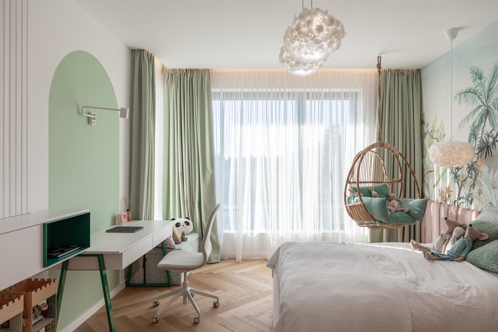 Dormitor Copil 1: Un univers ludic în nuanțe de verde și roz pudrat, cu tapet tropical/floral, fotoliu suspendat din ratan și corpuri de iluminat în formă de nori.