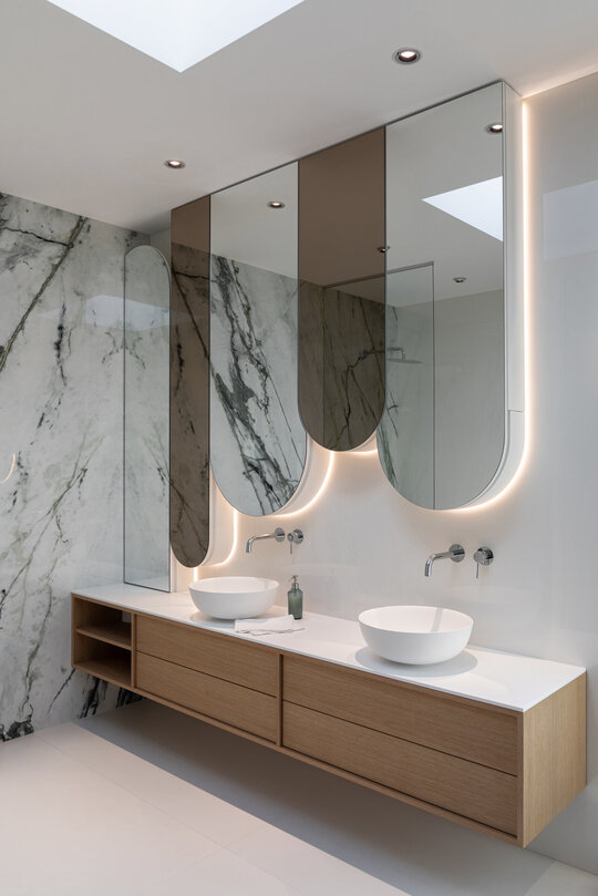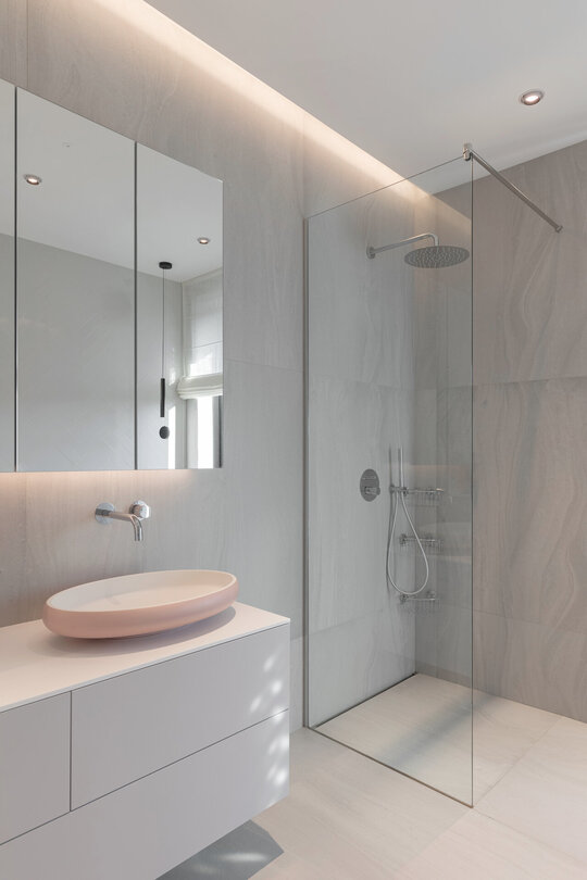 Băile copiilor: Pasteluri delicate și finisaje contemporane — inclusiv un lavoar oval roz într-una și o cadă rectangulară freestanding cu dulapuri suspendate oglindă în cealaltă.