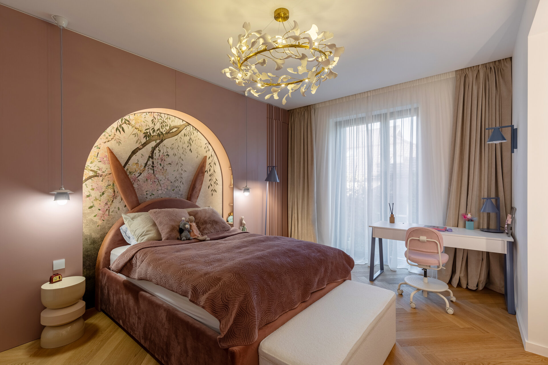 Dormitor Copil 2: Un refugiu de poveste, în roz pal, cu tăblie de pat în formă de iepure, corp circular auriu decorat cu frunze albe și elemente suspendate în formă de cești.