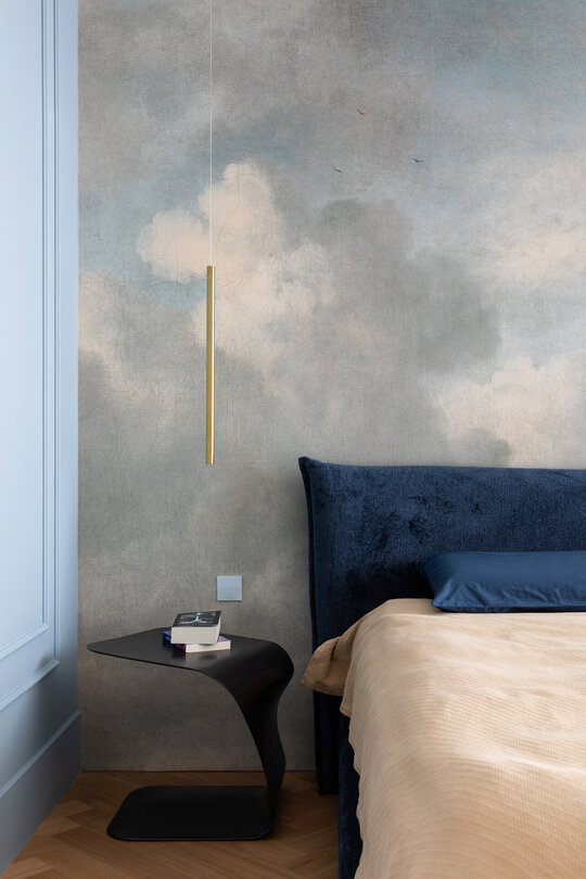 Dormitor Matrimonial: Un sanctuar liniștitor în tonuri de albastru, cu tapet tematic „nori”, pendule cilindrice aurii, corp de iluminat arcuit cu sfere albe și noptieră curbată din sticlă.