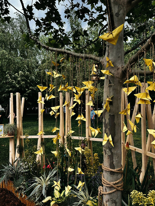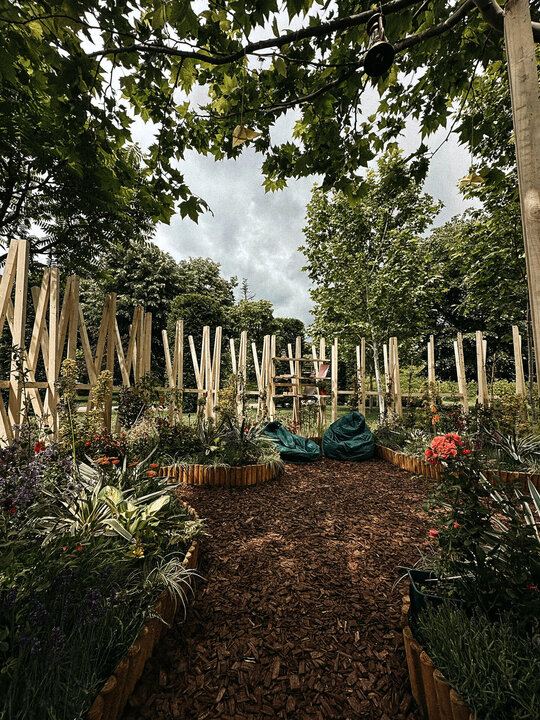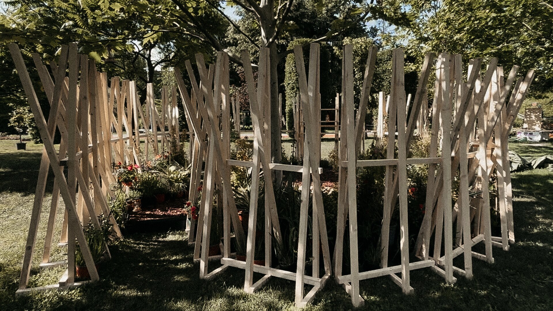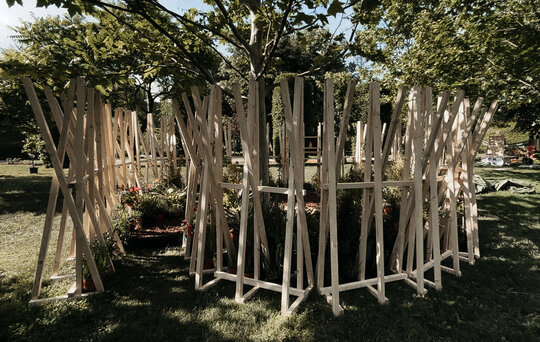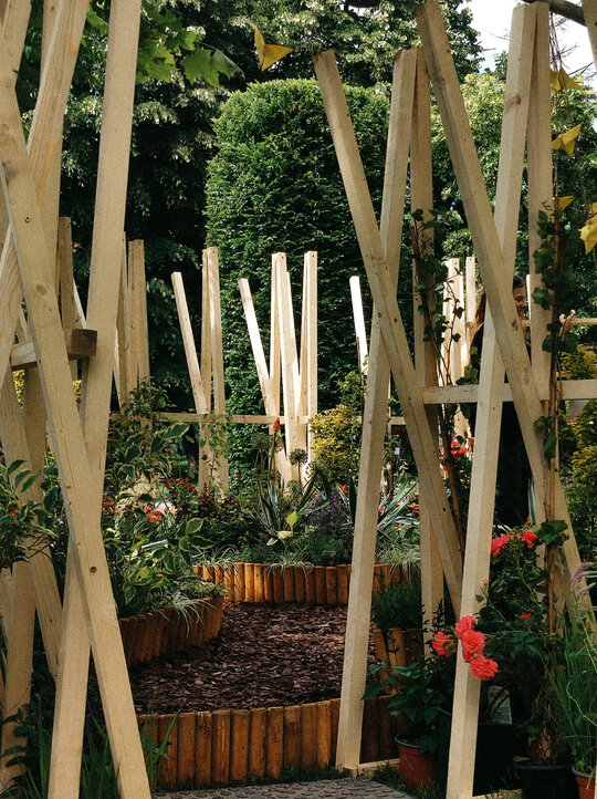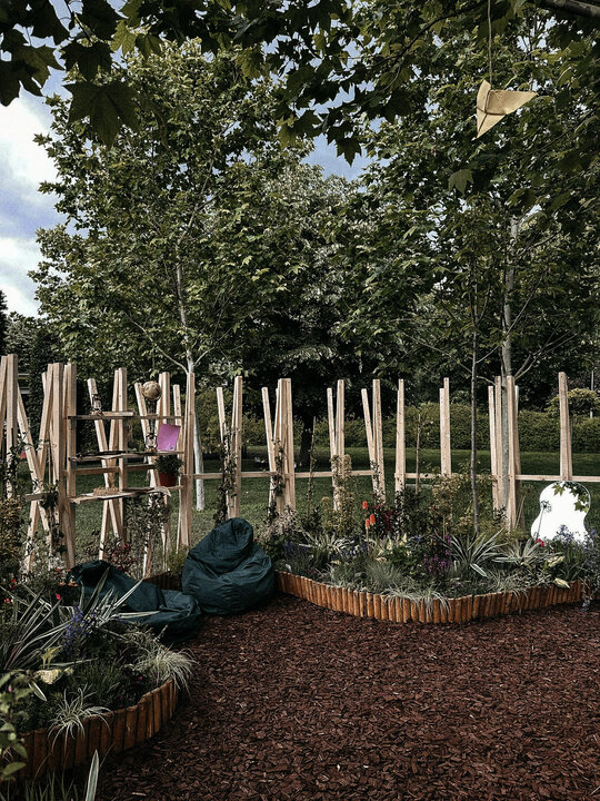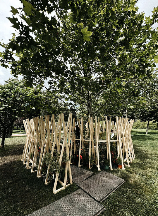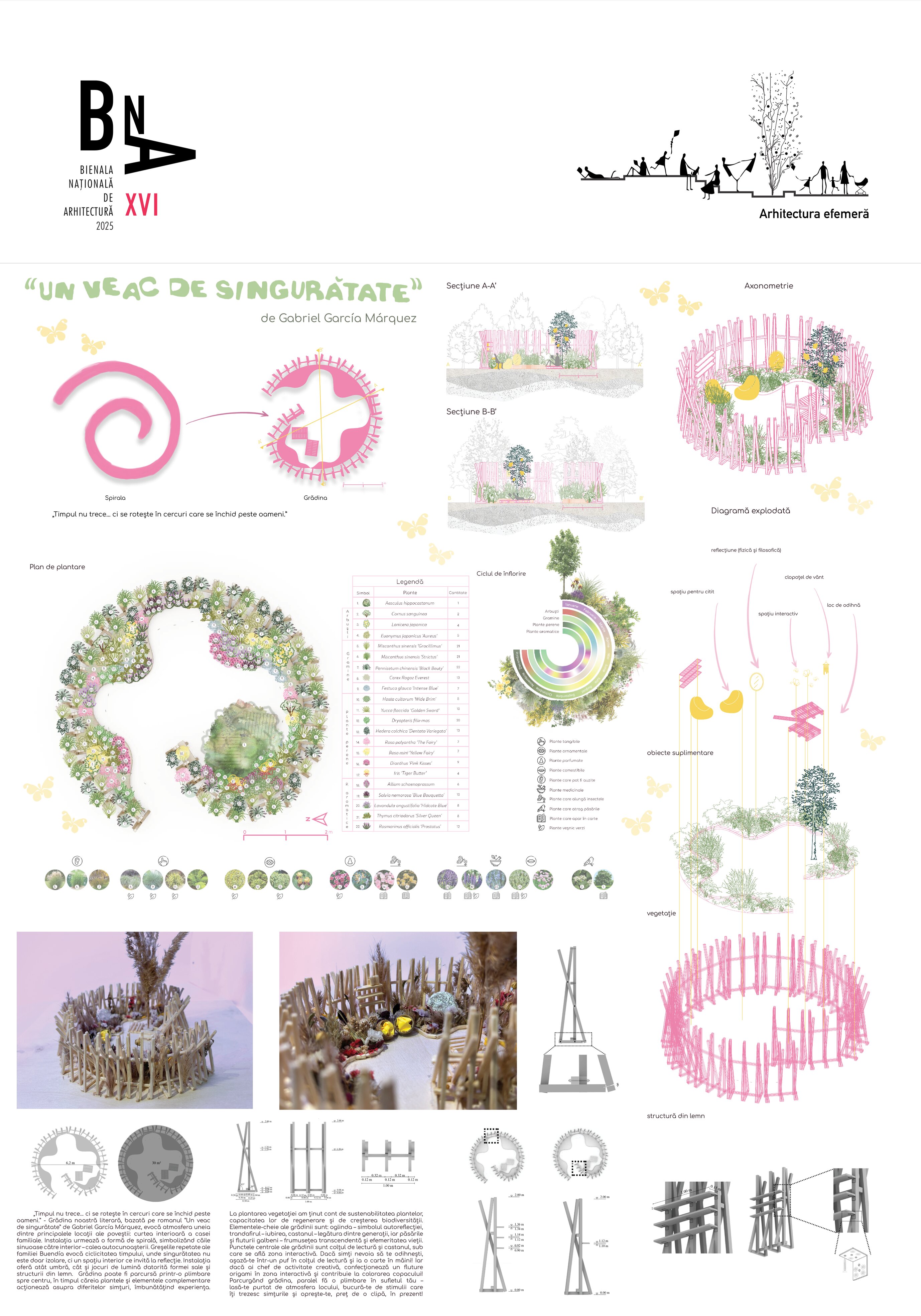 “Timpul nu trece ... ci doar se rotește în cercuri care se închid peste oameni.” Grădina noastră literară, bazată pe romanul “Un veac de singurătate” de Gabriel García Márquez, evocă atmosfera uneia dintre principalele locații ale poveștii: curtea interioară a casei familiale. Instalația urmează o formă de spirală, simbolizând căile sinuoase către interior – calea autocunoașterii. Greșelile repetate ale familiei Buendía evocă ciclicitatea timpului, unde singurătatea nu este doar izolare, ci un spațiu interior ce invită la reflecție. Instalația este un element spectaculos privit de la distanță, dar de aproape lasă loc misterului și stârnește curiozitate. Instalația oferă atât umbră, cât și jocuri de lumină datorită formei sale și structurii din lemn.