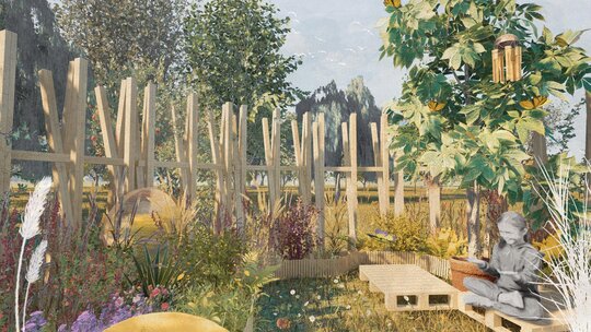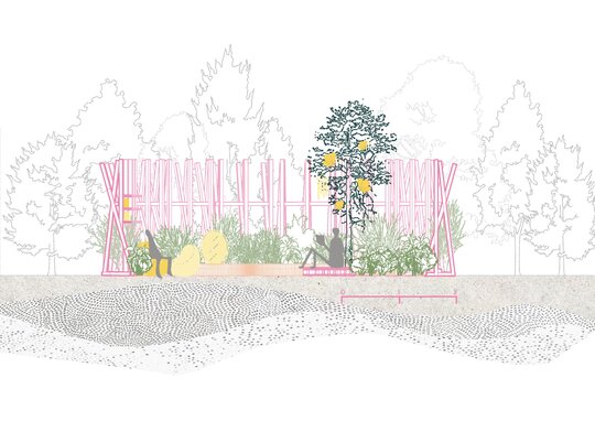 Grădina poate fi parcursă printr-o plimbare spre centru, în timpul căreia plantele și elementele complementare acționează asupra diferitelor simțuri, îmbunătățind experiența. La plantarea vegetației am ținut cont de sustenabilitatea și regenerarea plantelor: am ales în mare parte plante perene rezistente la secetă și iubitoare de soare, unele fiind și veșnic verzi – asigurând astfel un caracter decorativ pe tot parcursul anului. Pentru a spori biodiversitatea, am inclus și plante care atrag polenizatori, fluturi și păsări. Selecția vegetală este gândită și pentru a aduce plăcere oamenilor: șuieratul și textura ierburilor decorative, paleta coloristică a florilor, mirosul și aroma grădinii de plante aromatice stimulează simțurile. Am selectat și plante care apar în roman, pentru a reda cât mai fidel atmosfera: trandafirii, grădina cu flori, grădina de mirodenii și castanul sunt elemente integrale ale curții interioare, conferind grădinii o notă rustică.