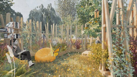 Punctele centrale ale grădinii sunt colțul de lectură și castanul, sub care se află zona interactivă. Dacă simți nevoia să te odihnești, așază-te într-un puf în colțul de lectură și ia o carte în mâini! Iar dacă ai chef de activitate creativă, confecționează un fluture origami în zona interactivă și contribuie la colorarea copacului! Parcurgând grădina, paralel fă o plimbare și în sufletul tău – lasă-te purtat de atmosfera locului, bucură-te de impulsurile care îți trezesc simțurile și oprește-te, preț de o clipă, în prezent.