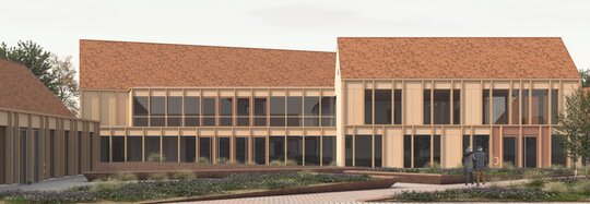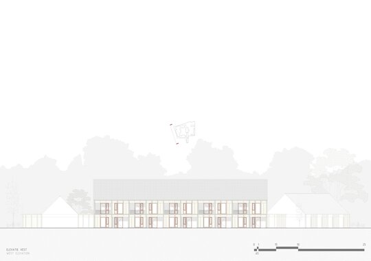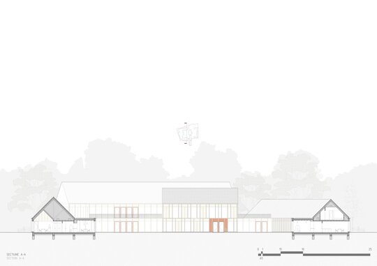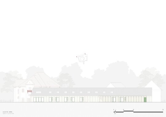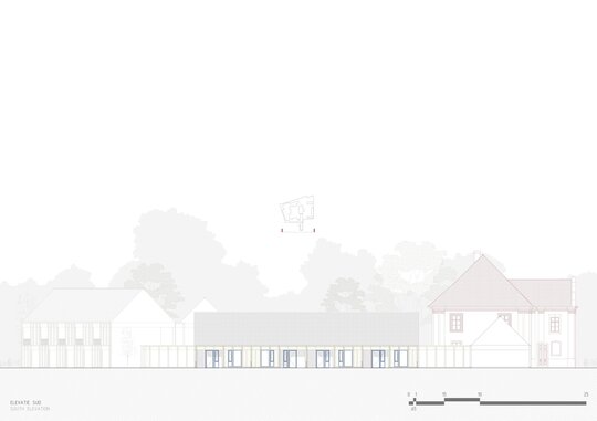 Pavilionul, poziționat între conac și șură, găzduiește un centru social de zi, accesibil atât rezidenților, cât și copiilor sau vârstnicilor din sat. Șura, reconfigurată ca spațiu multifuncțional, devine loc de întâlnire pentru evenimente locale. Secvența conac–pavilion–șură funcționează ca o zonă-tampon între curtea interioară „extrovertită”, destinată publicului, și curtea „introvertită” a căminului, protejând intimitatea și siguranța locatarilor vârstnici. Cabinetele medicale sunt amplasate strategic în aripa nordică, cu acces separat din exterior, ceea ce permite utilizarea lor și de către populația vârstnică din comunitate.
