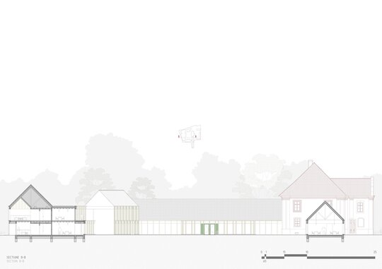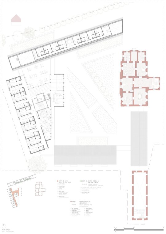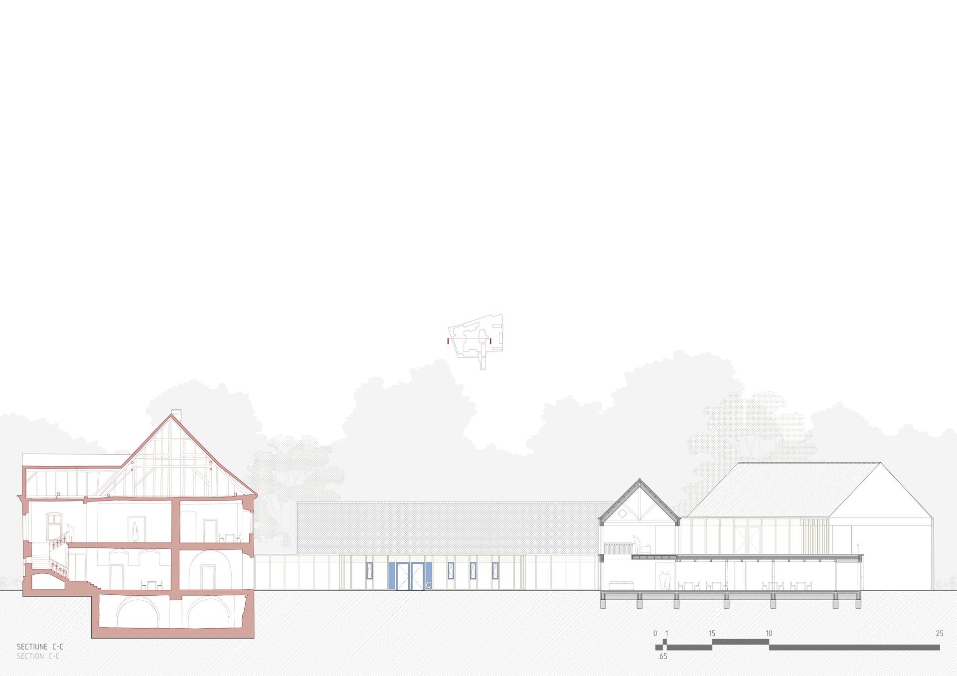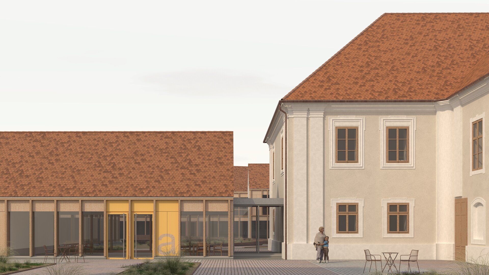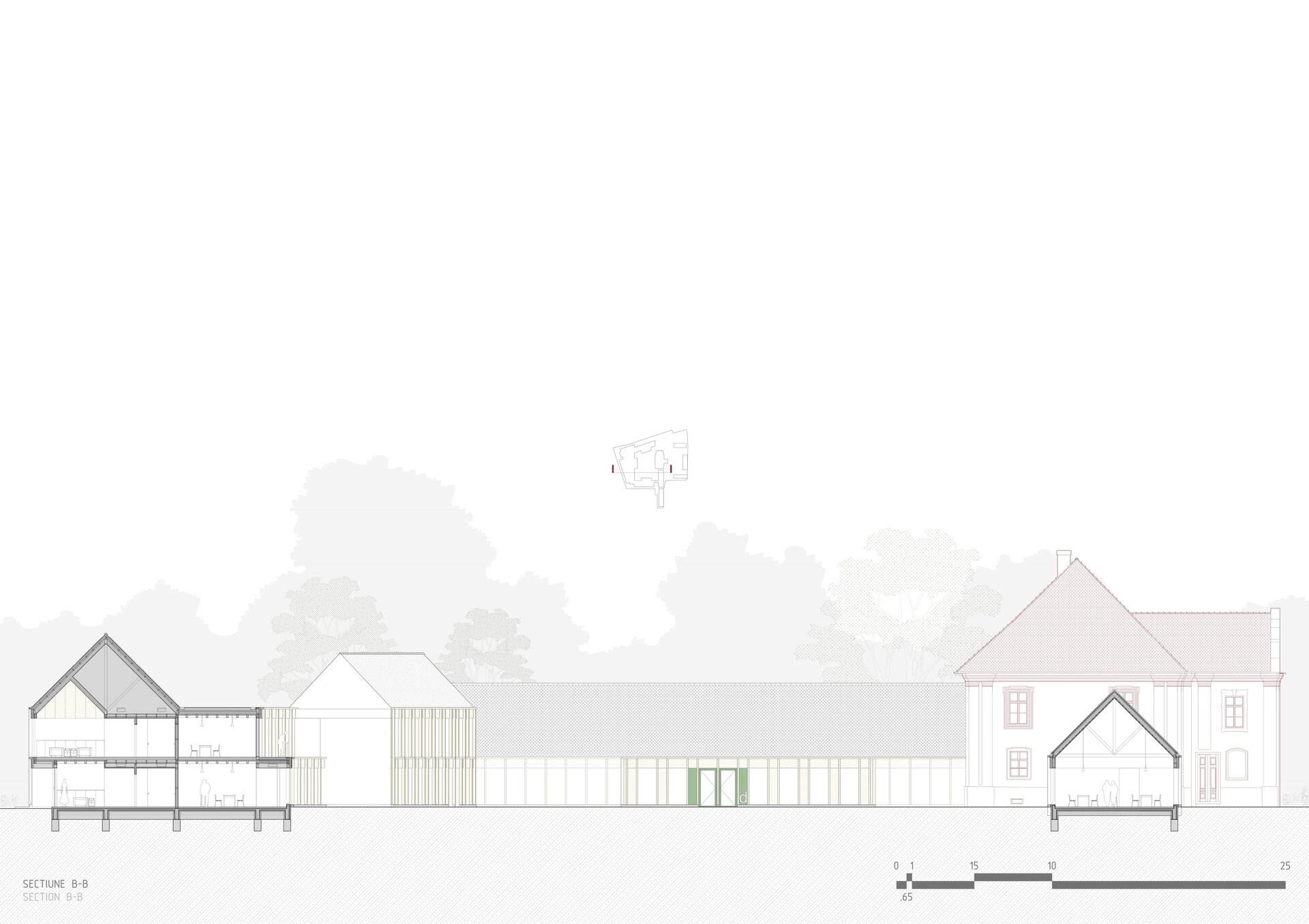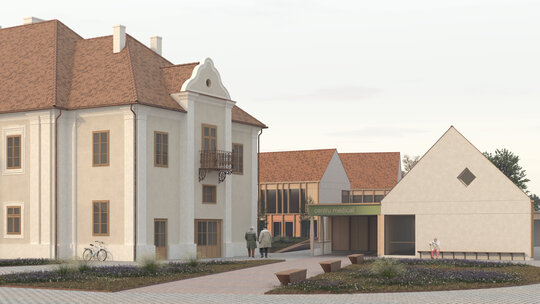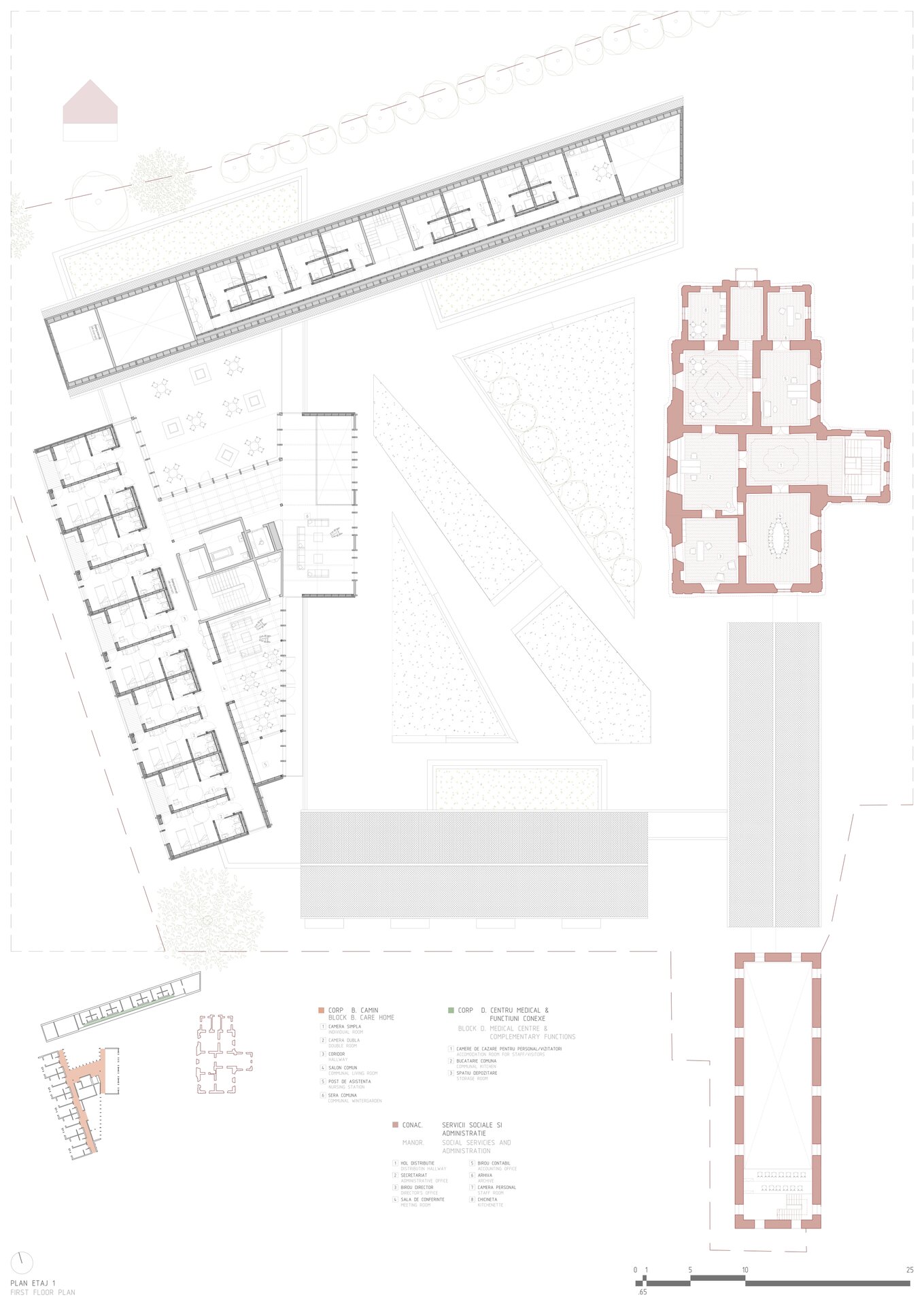 Structura închisă joacă un rol esențial în integrarea arhitecturii în contextul existent, dar și în crearea unui sentiment de intimitate, siguranță și apartenență. Clădirea este organizată în jurul unei curți care evocă vechea grădină a conacului, astăzi dispărută. Această grădină propusă încurajează mișcarea, întâlnirile și interacțiunea, oferind diversitate funcțională și vizuală. Fosta curte de primire a ansamblului istoric este reinterpretată ca un spațiu deschis comunității, în care sunt amplasate funcțiuni publice partajabile: magazin, coafor, centru turistic.