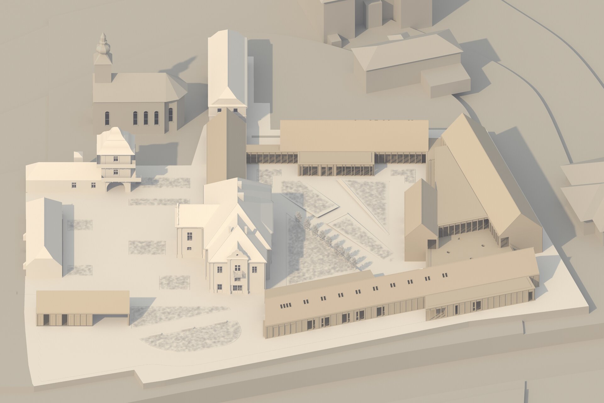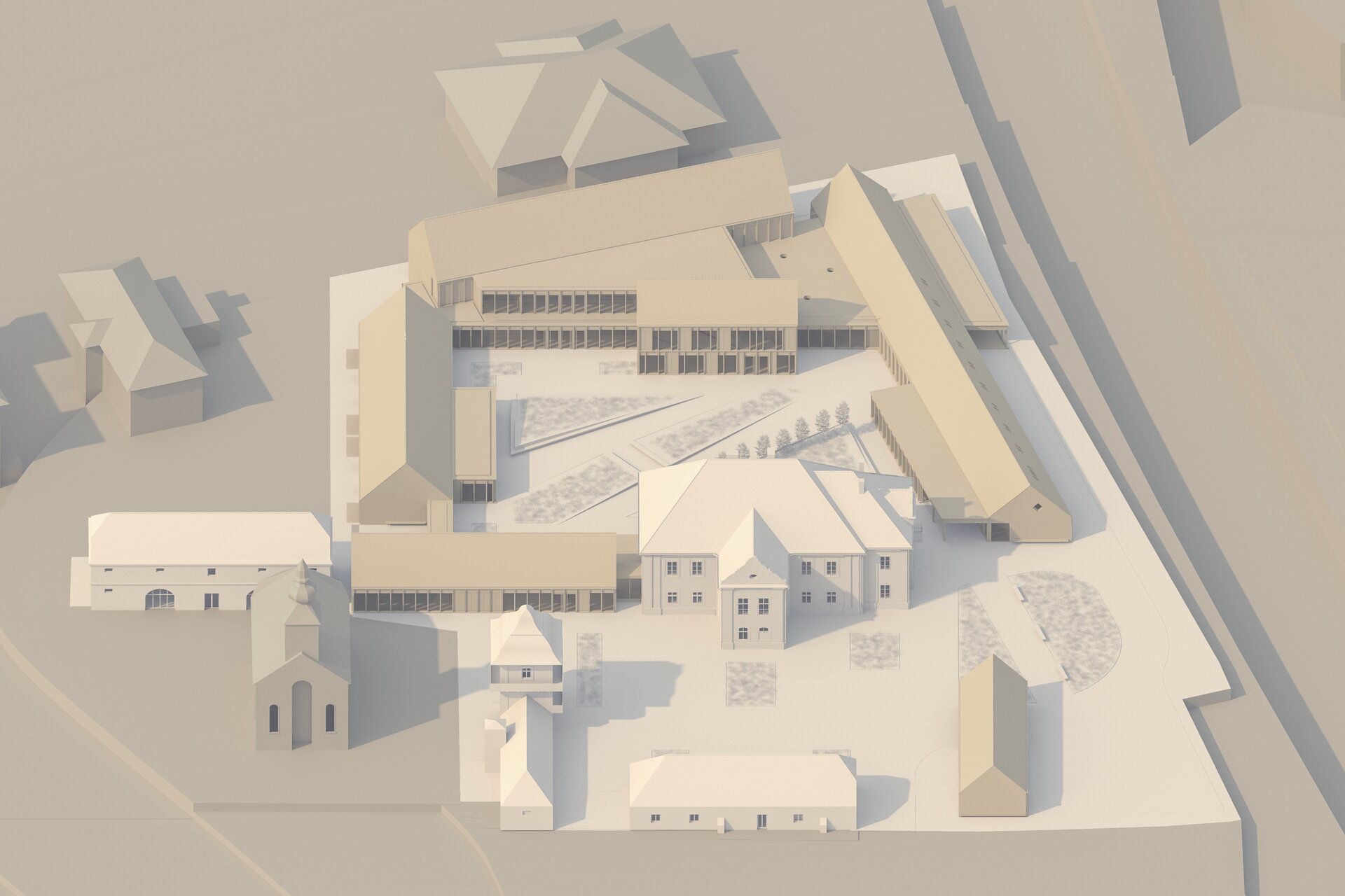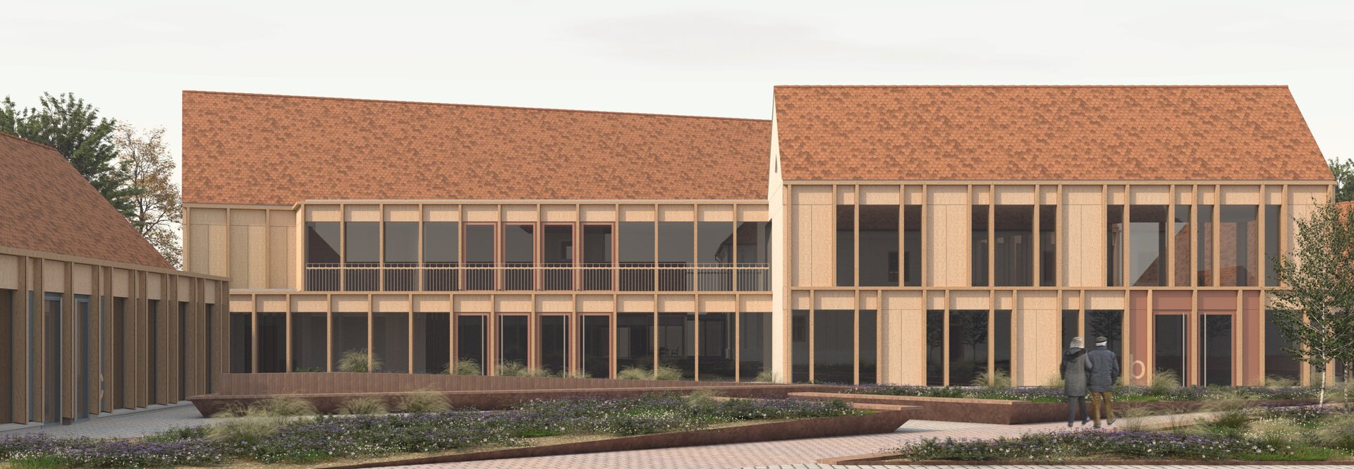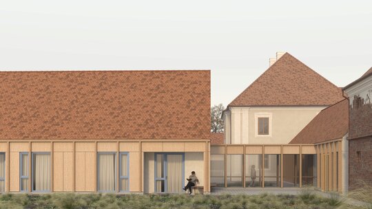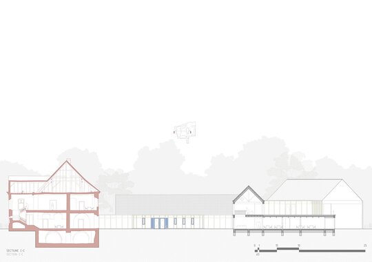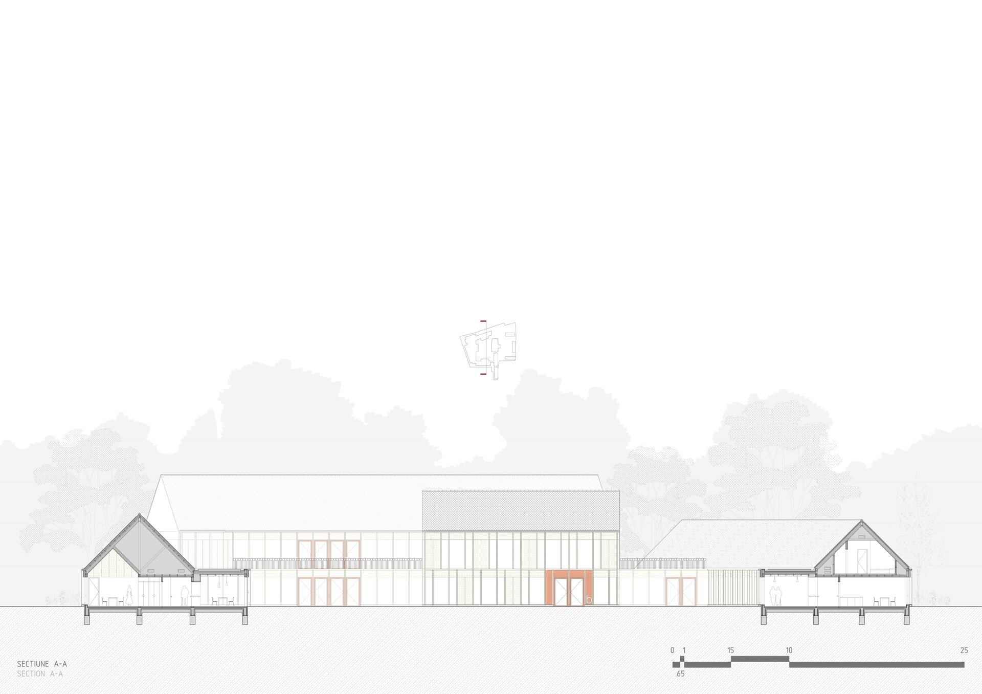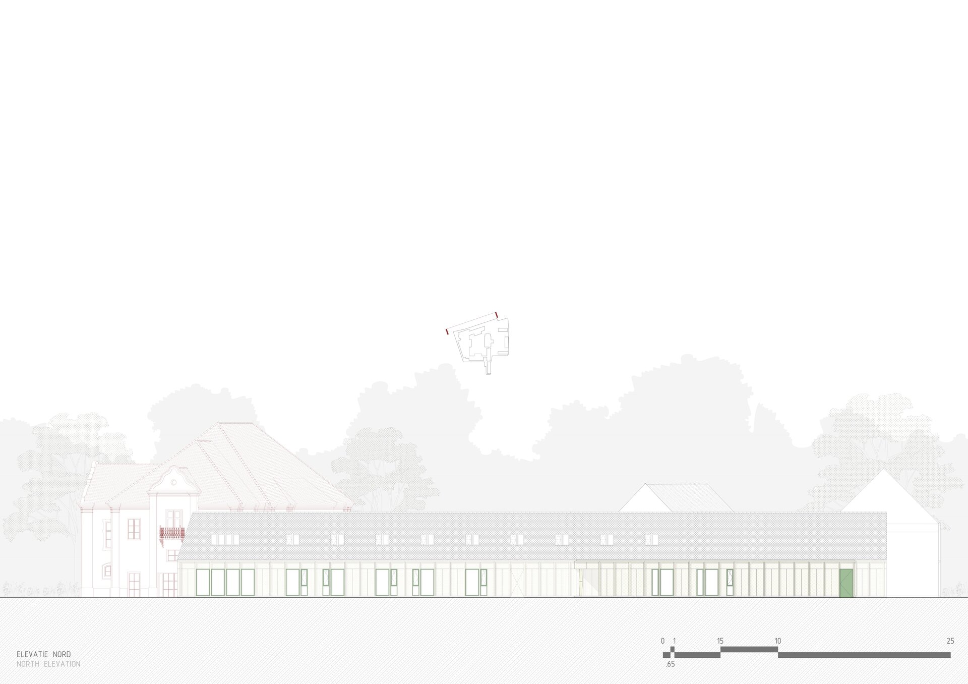 Structura închisă joacă un rol esențial în integrarea arhitecturii în contextul existent, dar și în crearea unui sentiment de intimitate, siguranță și apartenență. Clădirea este organizată în jurul unei curți care evocă vechea grădină a conacului, astăzi dispărută. Această grădină propusă încurajează mișcarea, întâlnirile și interacțiunea, oferind diversitate funcțională și vizuală. Fosta curte de primire a ansamblului istoric este reinterpretată ca un spațiu deschis comunității, în care sunt amplasate funcțiuni publice partajabile: magazin, coafor, centru turistic.
